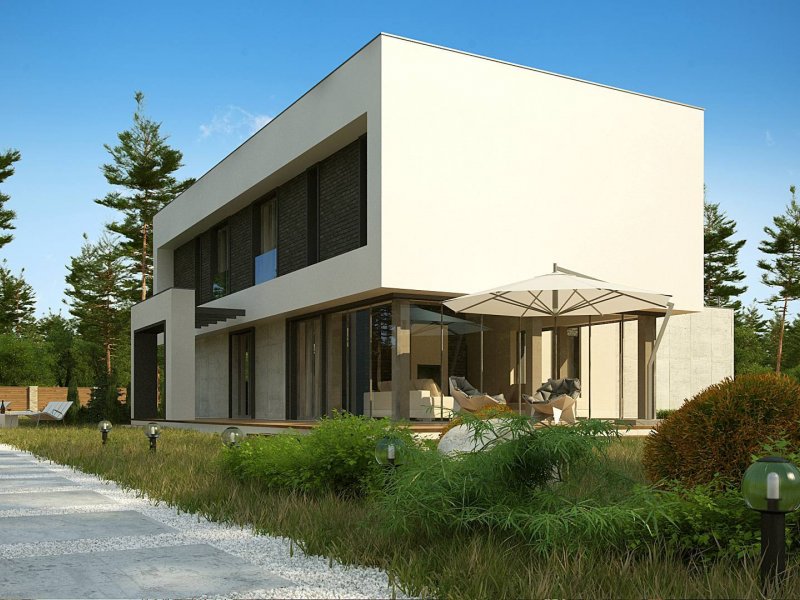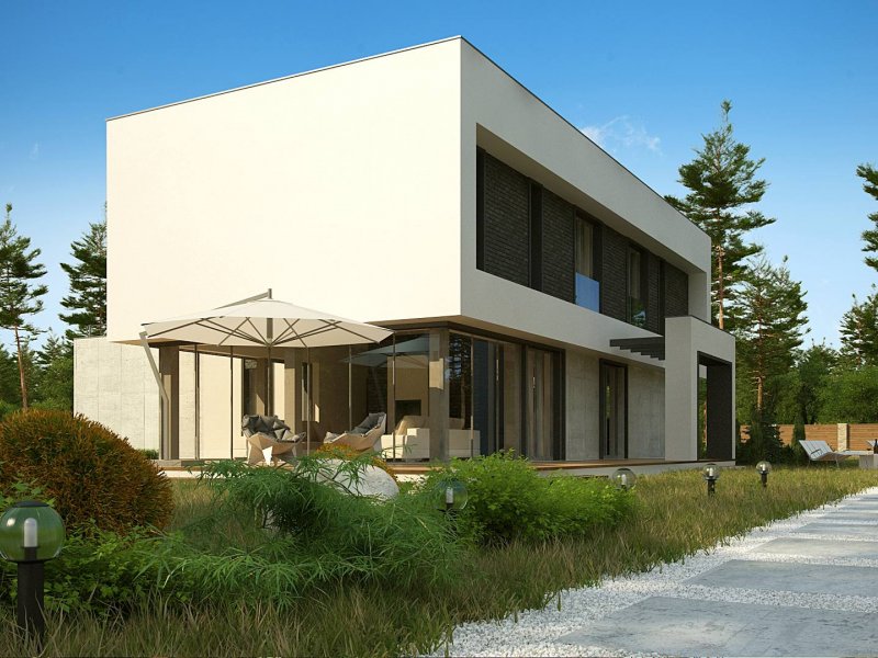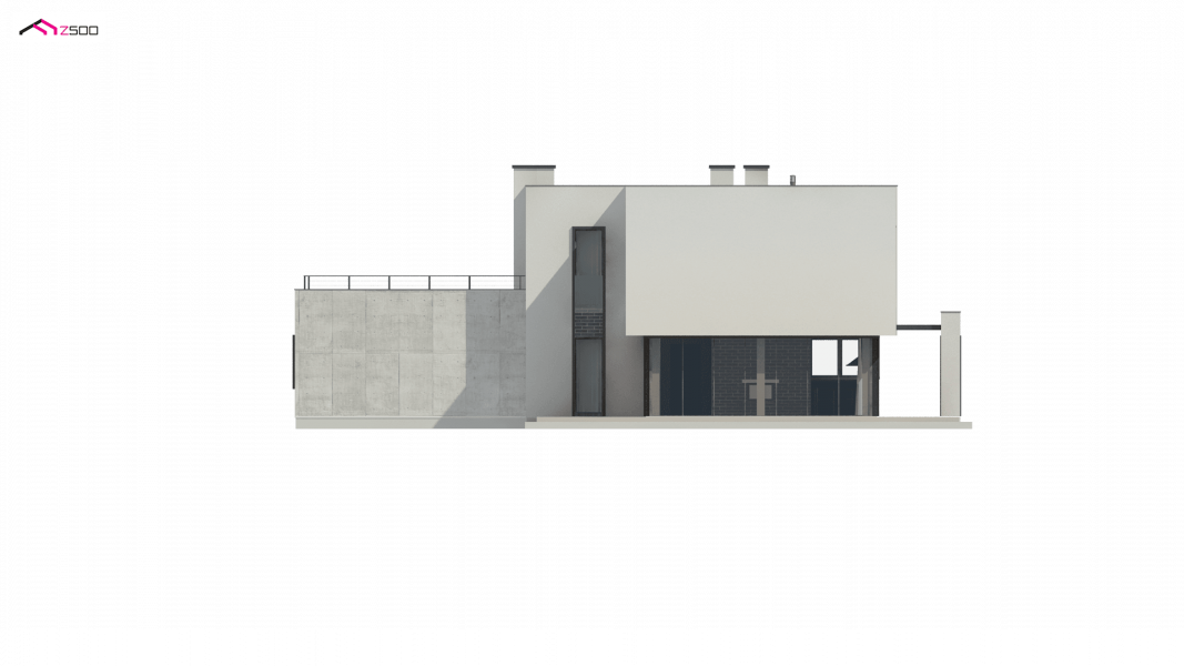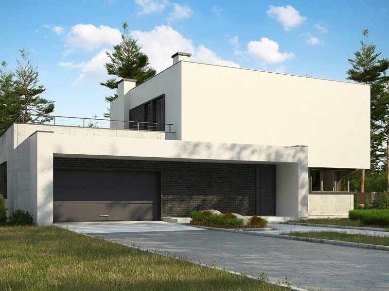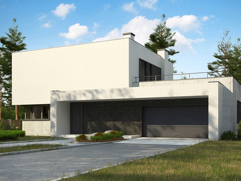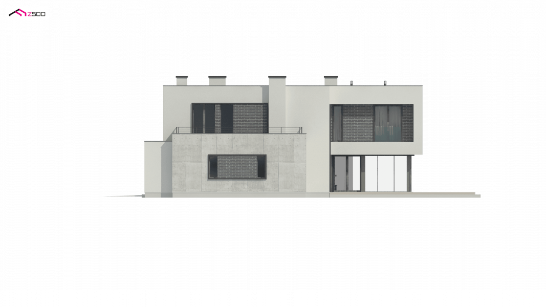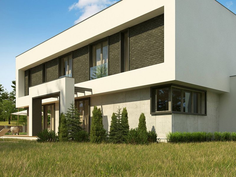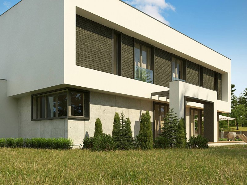 Zx130 Jest propozycją domu dla większej rodziny. Czysta forma, minimalistyczne kształty, nowoczesna bryła i współczesna architektura to główne zalety projektu Zx130. Materiały elewacyjne to beton architektoniczny, biały tynk, i ciemna płytka klinkierowa.