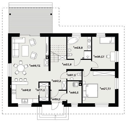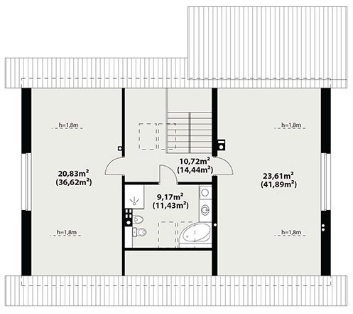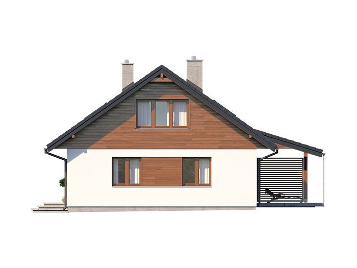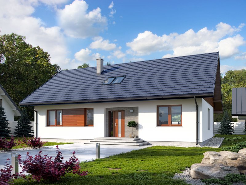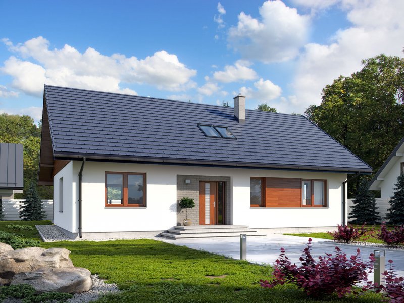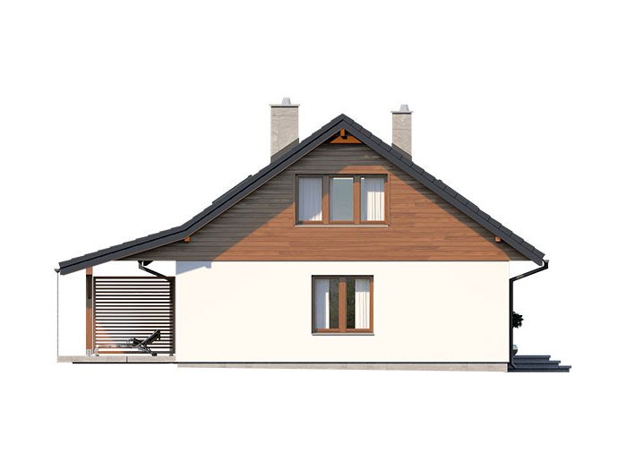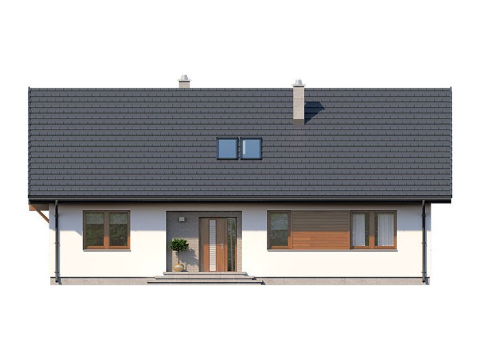Dom jednorodzinny, parterowy, z poddaszem użytkowym. Wygodny, funkcjonalny, z optymalnie rozplanowaną przestrzenią. Przestronny salon połączony z kuchnią otwiera się na duży, zadaszony taras. W parterze ponadto znadjują się dwie sypialnie, duża łazienka, wc, spiżarnia. Na poddaszu znajdują się dwa duże pokoje oraz łazienka. Dom jest tani i prosty w budowie a przez zastosowanie rozwiązań energooszczędnych również niedrogi w utrzymaniu.