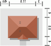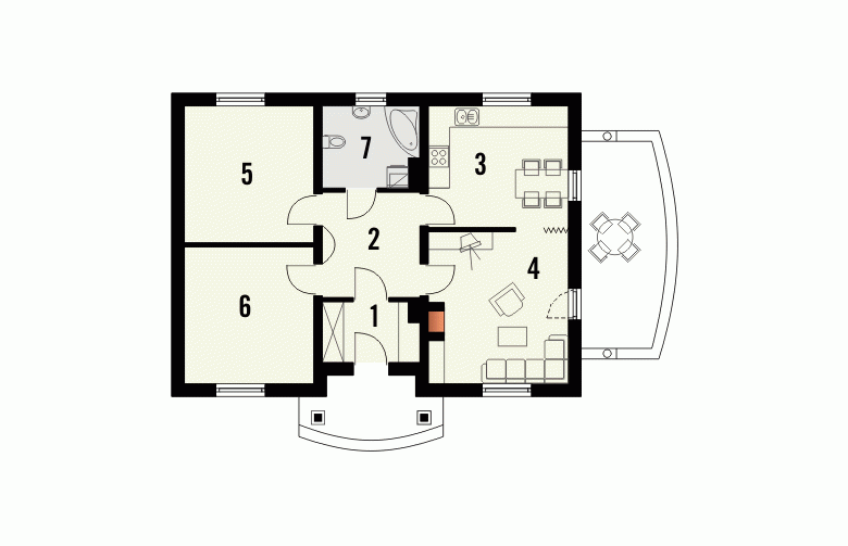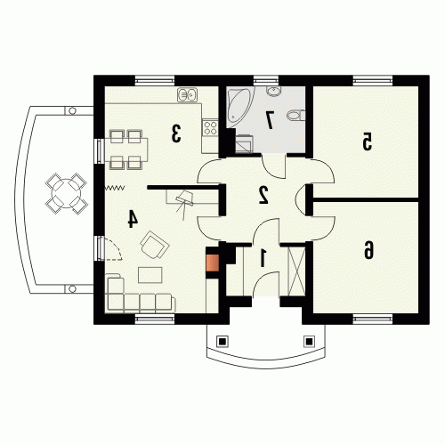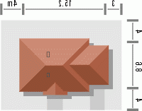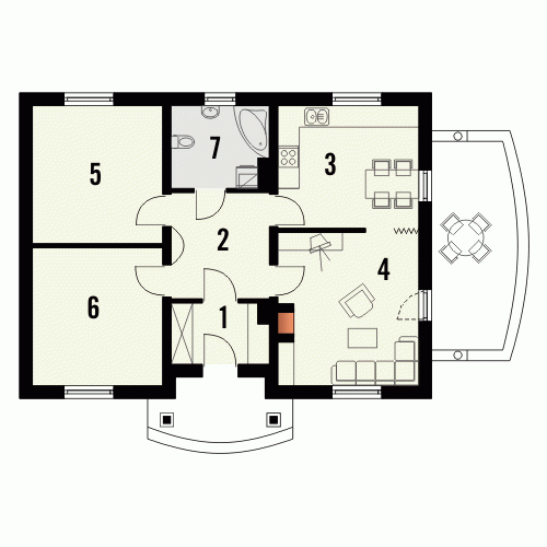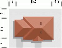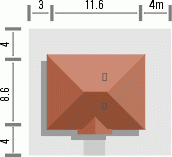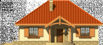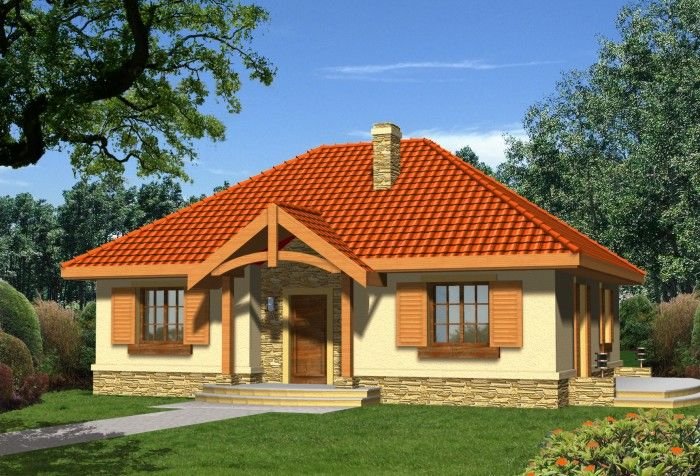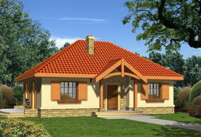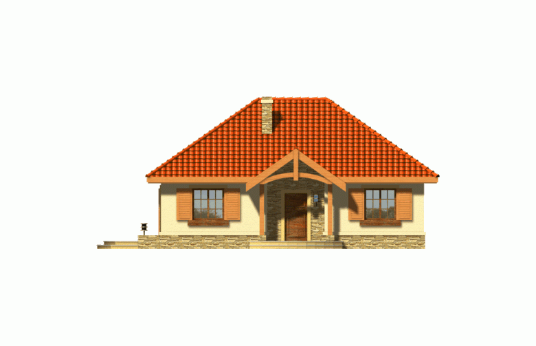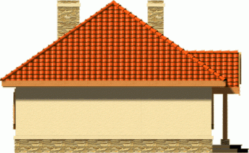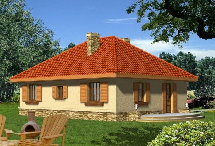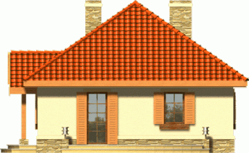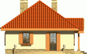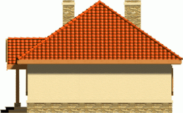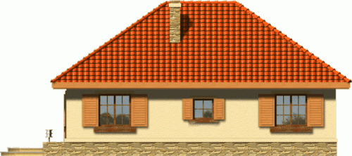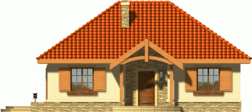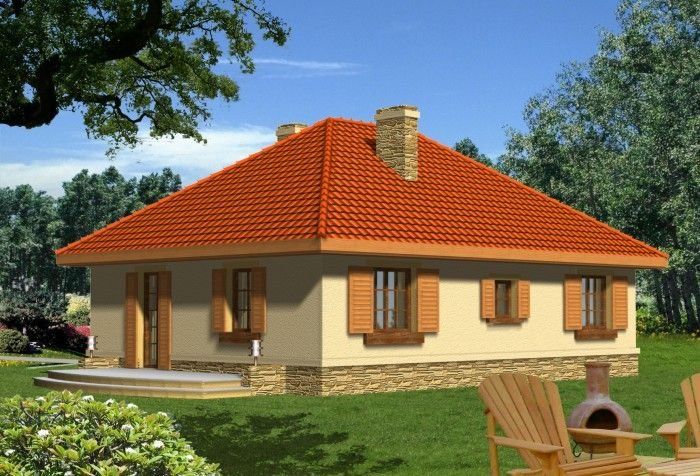 Ten prosty dom przykryty dachem kopertowym posiada wszelkie zalety małego domu mogącego być zrealizowanym zarówno w mieście jak i w terenie pozamiejskim. Dodatkowym atutem jest podział wnętrza na strefę dzienną i nocną oraz harmonijne elewacje z podkreślonym wejściem . Ze względu na taras i wyjście z salonu z bocznej elewacji dom można realizować na działkach zarówno z północną jak i południową orientacją od strony wejścia.