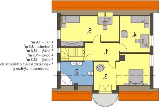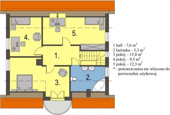 Na parterze znajduje się obszerny salon z wyjściem do ogrodu, funkcjonalnie połączony z jadalnią i kuchnią. Umieszczony w centralnym miejscu kominek umożliwia rozprowadzenie ciepła po całym domu. Kuchnia może być otwarta na salon lub też może stanowić niezależne, zamknięte pomieszczenie. Dodatkowy pokój na parterze to niewątpliwy atut, który może spełniać rolę sypialni lub gabinetu. Zdecydowanie rozdzielona została strefa dzienna i nocna. Na poddaszu znajdują się trzy sypialnie i wygodna łazienka.