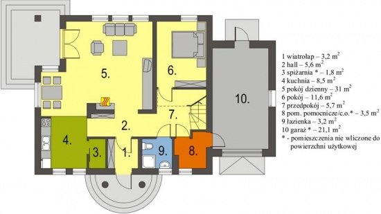 Na parterze znajduje się obszerny salon z wyjściem do ogrodu, funkcjonalnie połączony z jadalnią i kuchnią. Umieszczony w centralnym miejscu kominek umożliwia rozprowadzenie ciepła po całym domu. Kuchnia może być otwarta na salon lub też może stanowić niezależne, zamknięte pomieszczenie. Dodatkowy pokój na parterze to niewątpliwy atut, który może spełniać rolę sypialni lub gabinetu. Zdecydowanie rozdzielona została strefa dzienna i nocna. Na poddaszu znajdują się trzy sypialnie i wygodna łazienka.