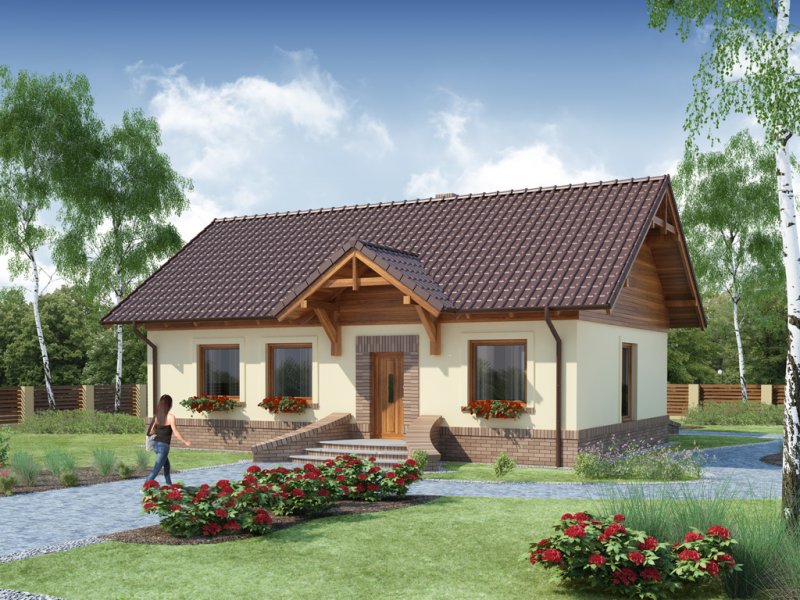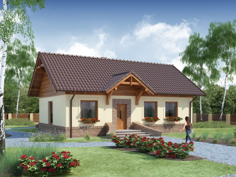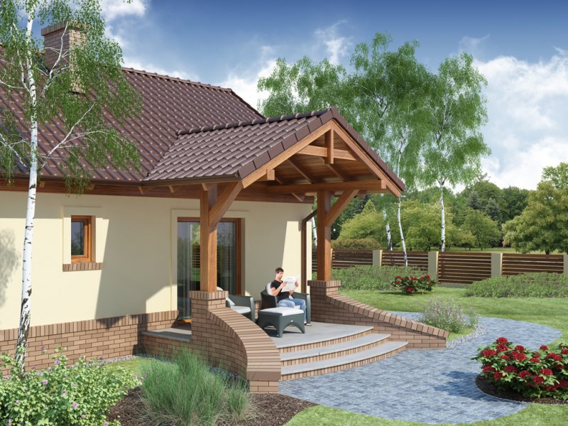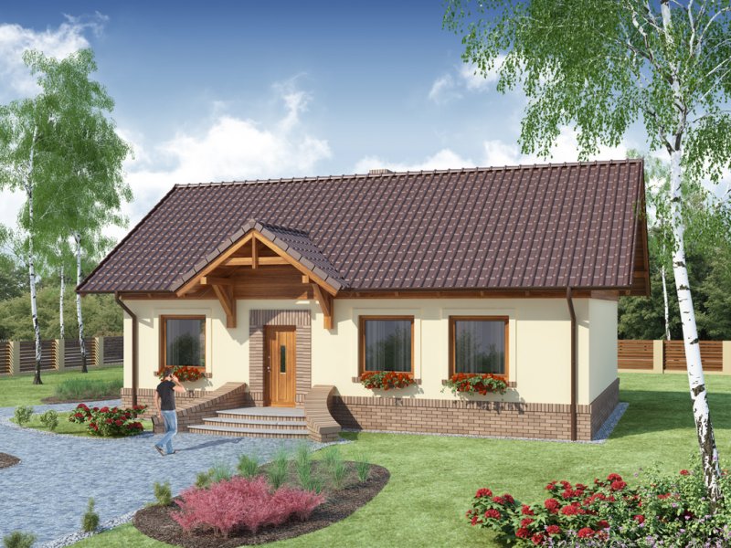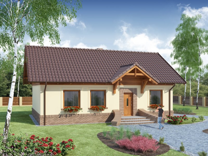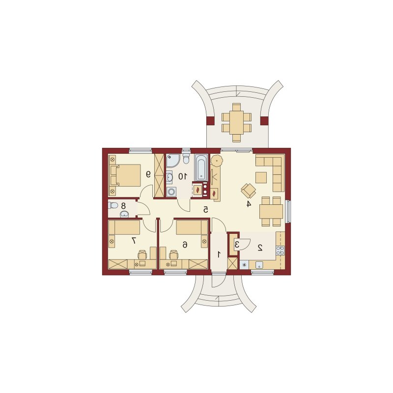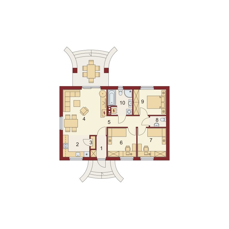 Amadeusz to dom zaprojektowany z myślą o 4 osobowej rodzinie. Jego klasyczna forma korzystnie wpływa na oszczędność związaną z ogrzewaniem domu oraz samą jego budową. Zaraz po przekroczeniu wiatrołapu ukazuje się strefa dzienna domu - połączony z jadalnią salon z widokiem na zadaszony taras. Jadalnia płynnie przechodzi w kuchnię, którą po dostawieniu ścianki działowej możemy przekształcić w zamkniętą. Od strony kuchni zaprojektowano także dostępną spiżarnię. Decydując się na jej likwidację, można uzyskać większą przestrzeń na szafy w wiatrołapie. Część nocną domu stanowią trzy sypialnie, łazienka oraz toaleta.