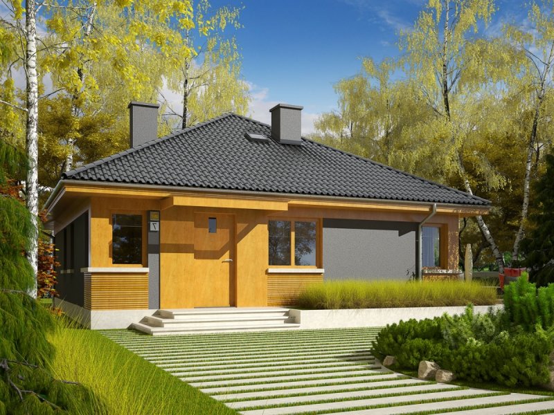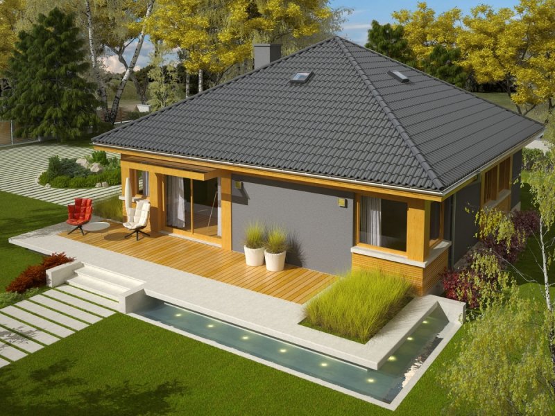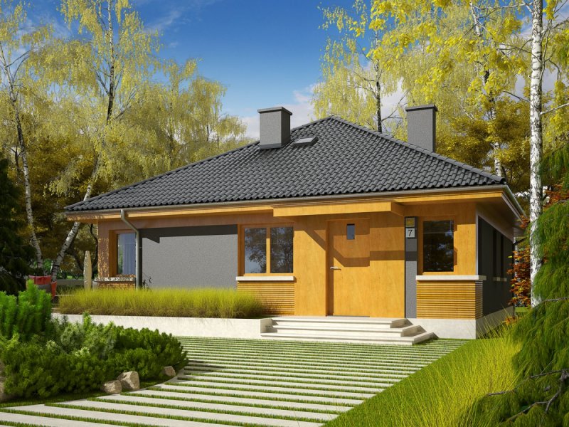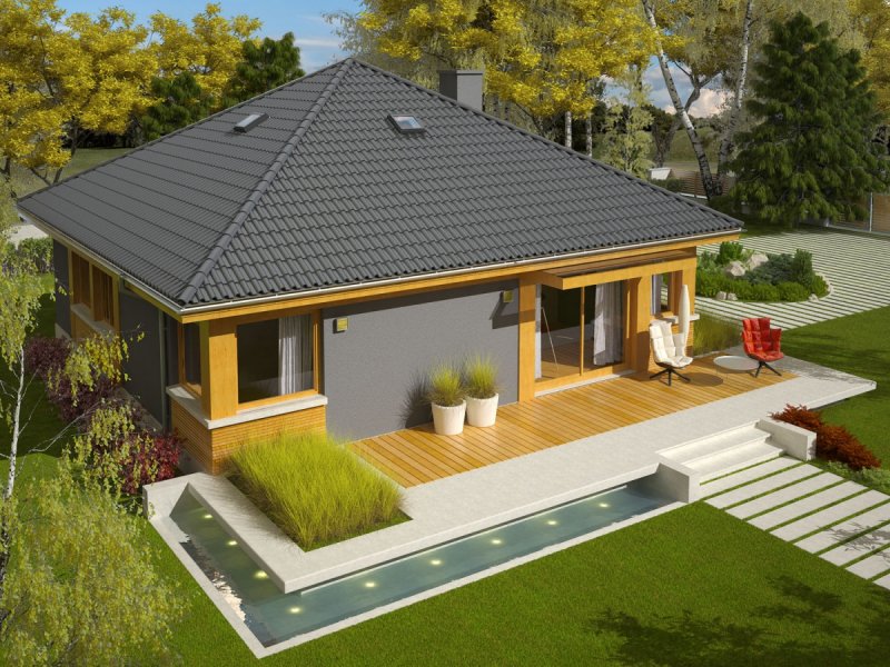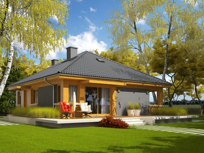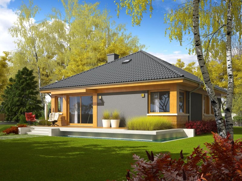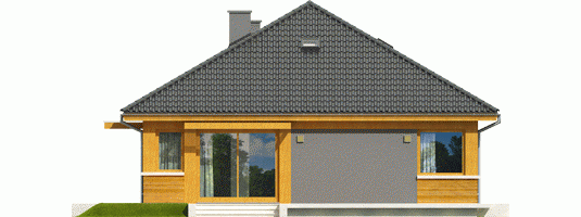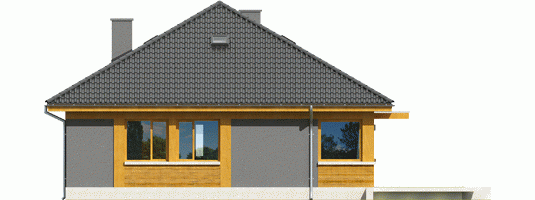 Dom zaprojektowany w technologii murowej ze stropem gęstożebrowym. Dach o konstrukcji drewnianej pokryty dachówką cementową IBF. Elewacje wykończono tynkiem mineralnym i okładziną drewnianą. Cokół kamienny. Stolarka okienna drewniana lub PCV. Rolety zewnętrzne naokienne w systemie CleverBox firmy BeClever.
