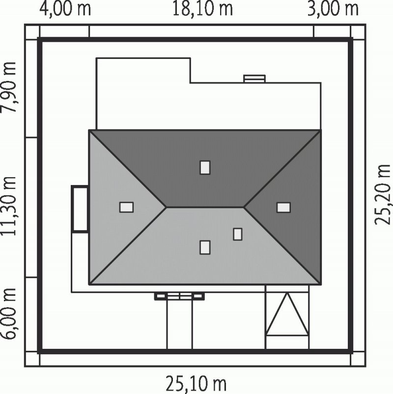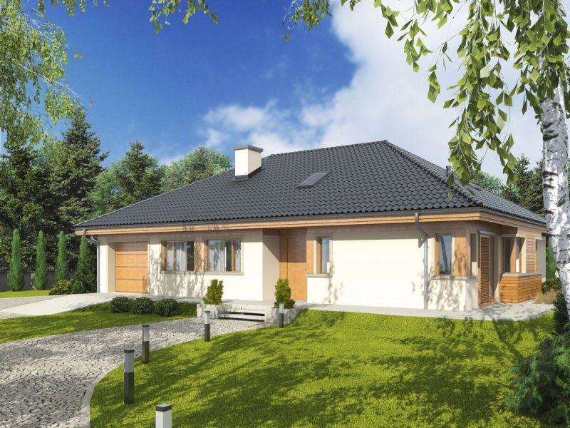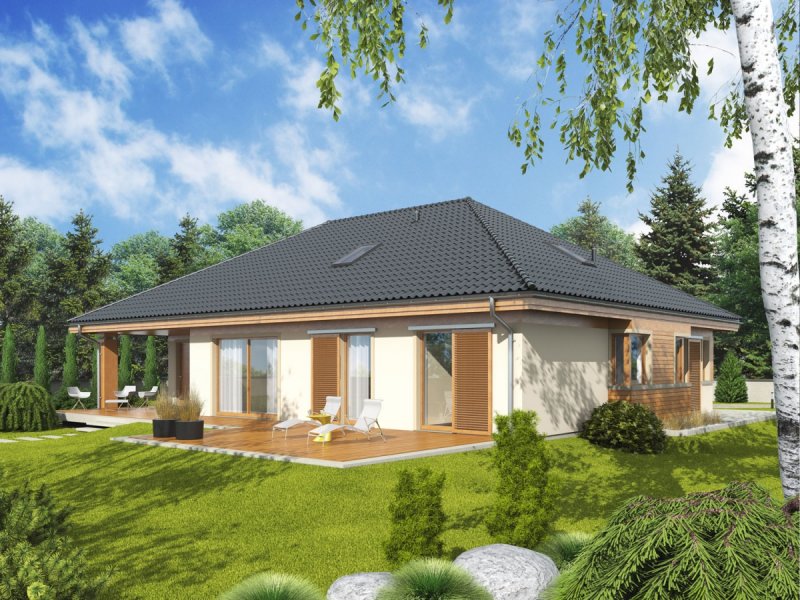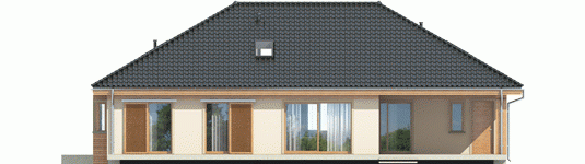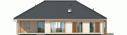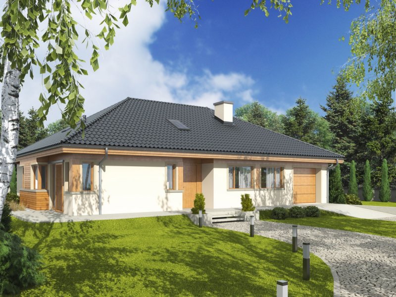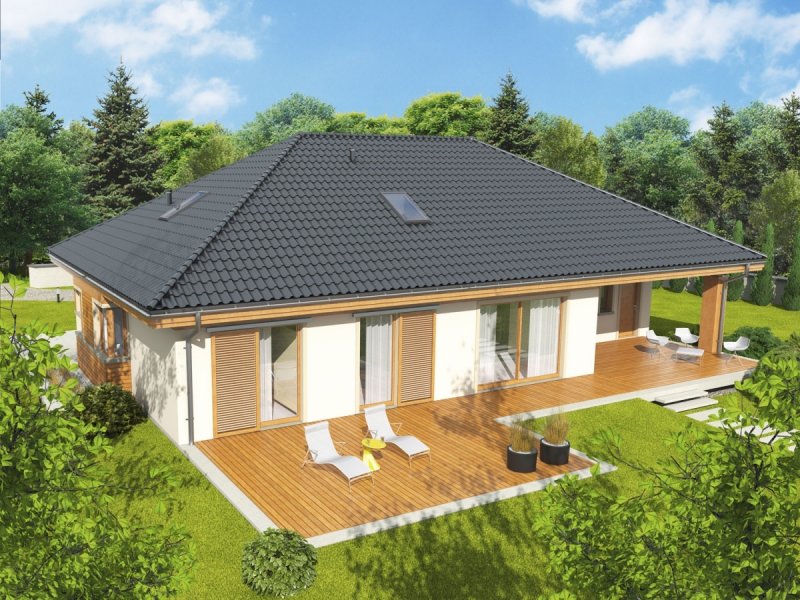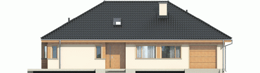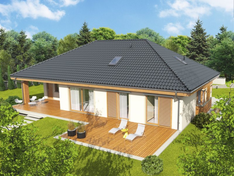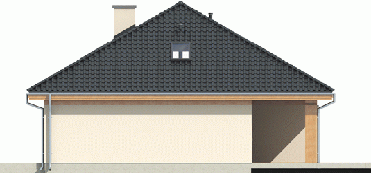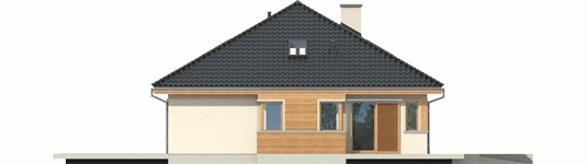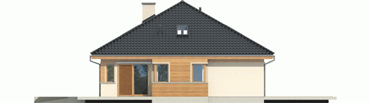 Dom zaprojektowany w technologii murowej ze stropem gęstożebrowym. Dach o konstrukcji drewnianej pokryty dachówką ceramiczną Röben. Więźba dachowa dostępna również w systemie prefabrykacji drewnianej. Elewacje wykończono tynkiem mineralnym i okładziną drewnianą. Cokół kamienny. Stolarka okienna drewniana lub PCV.