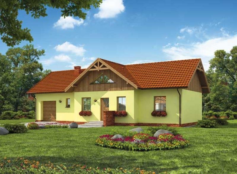 "Ankara" To zgrabny domek o jasnej i ciepłej elewacji, z którą kontrastują wykończenia z ciemnego drewna, czerwony dach oraz stylowe wykończenia z czerwonej cegły wokół podstawy domu, a także przy wejściu frontowym w postaci, poprowadzonego z jednej strony schodów, murku. Ciekawy element tego projektu stanowią łamiące monotonię bryły budynku , ryzality widoczne z przodu i tyłu budynku. Nadającym dodatkowego uroku całej konstrukcji elewacji frontowej jest umieszczone w ryzalicie trójkątne, dzielone okno, umieszczone nad wejściem do domu. Z lewej strony budynku zostało przewidziane miejsce na garaż. Gdy przyjrzymy się z bliska wnętrzu domu, zaskoczy on nas swoją przestronnością i funkcjonalnością rozwiązań. Stylowe wejście prowadzi nad poprzez wiatrołap i komunikację do obszernego, stanowiącego serce domu, pokoju dziennego, z którego możemy przejść na, wiodący do ogrodu, taras, stanowiący cichą przystań kojącą nerwy, czy też będący dobrym miejscem na zorganizowanie przyjęcia w ciepły, letni dzień. Oprócz pokoju dziennego, na parterze znajdują się aż trzy pokoje, obszerna kuchnia z wydzieloną częścią jadalną, która połączona została z salonem, co zapewne ułatwi życie gospodarzy, szczególnie, gdy do domu zawitają goście. Z kuchni możemy przejść do kotłowni i garażu. To jednak nie koniec ciekawych rozwiązań architektonicznych zastosowanych w tym projekcie. Obszerna łazienka została bowiem podzielona na dwie części - jedną, w której przewidziano miejsce na WC, oddzieloną ścianką od intymnego miejsca kąpielowego. Najbardziej zaskakującym elementem projektu, jest obszerny pokój zlokalizowany na poddaszu. W zależności od potrzeb można w nim urządzić stylową bibliotekę, gdzie z przyjemnością spędzimy długie, jesienne wieczory, pokój telewizyjny, romantyczną sypialnię, oddzieloną od reszty domu, pokój dla dorastającego dziecka czy też może sypialnię dla gości? Projekt Ankara z pewnością zaspokoi potrzeby osób, pragnących własnego, przytulnego domku jednorodzinnego. Projekt składa się z części architektonicznej, konstrukcyjnej, wewnętrznych instalacji wod.-kan, c. o. , gaz. i elektrycznej. W projekcie załączone są podstawowe zestawienie stali, drewna i stolarki okienno-drzwiowej. Do projektu dołączamy bezpłatną zgodę na wprowadzenie zmian, oświadczenie projektantów o wykonaniu projektu zgodnie z obowiązującymi normami i przepisami oraz kserokopie uprawnień projektantów wraz z aktualnym wpisem do izby. W przypadku zamówienia projektu w technologii lekkiej, drewnianej konstrukcji szkieletowej, powierzchnia użytkowa budynku jest o około 7% większa.