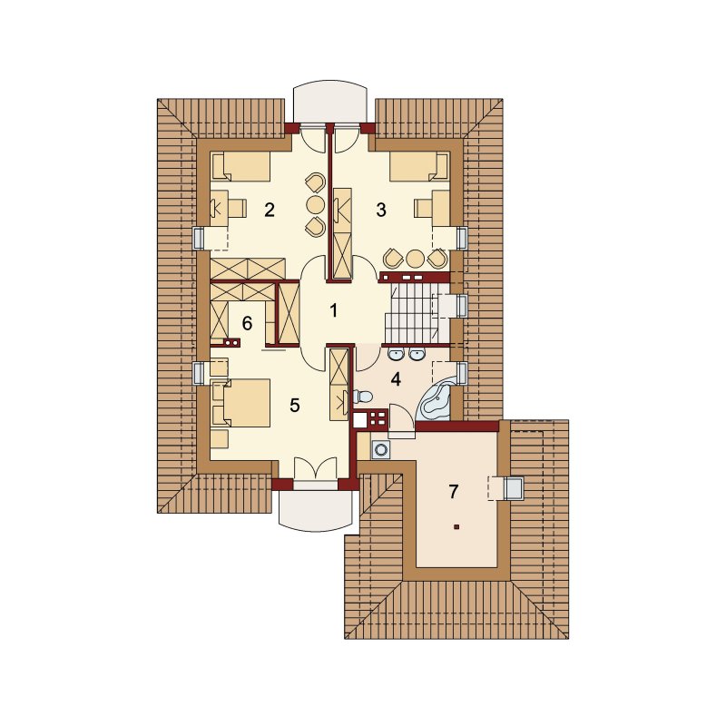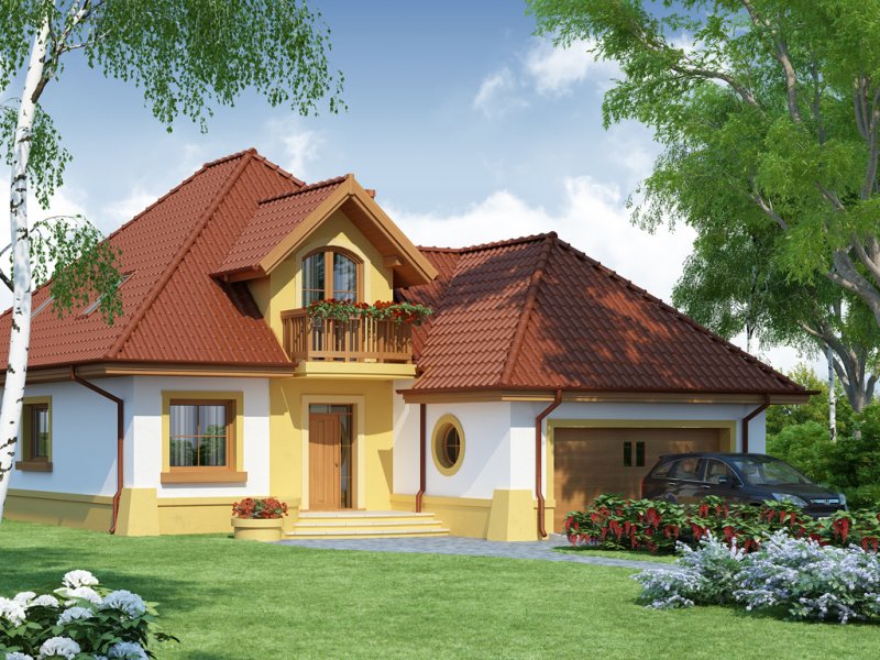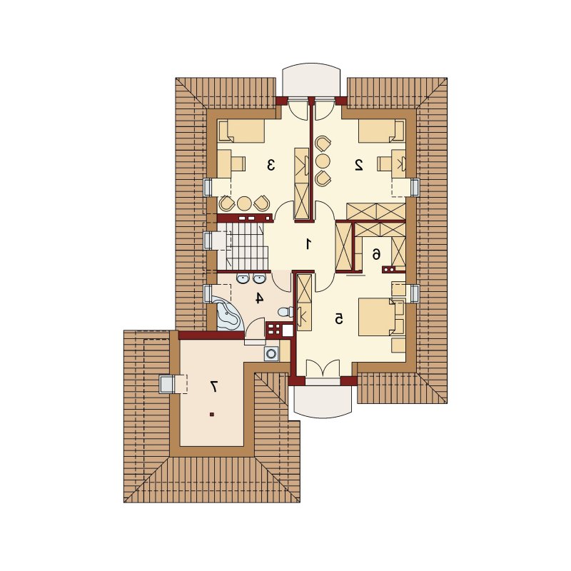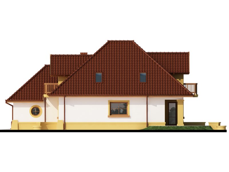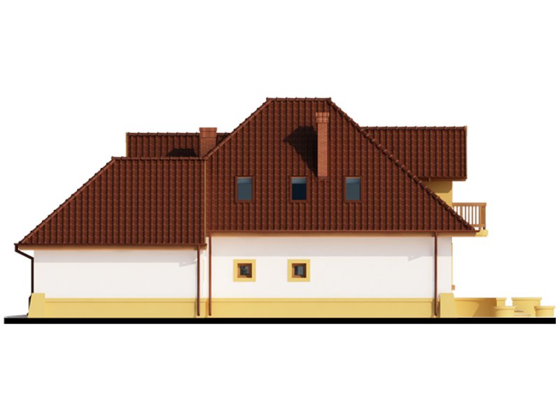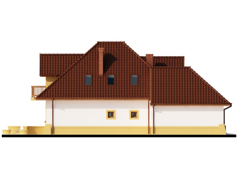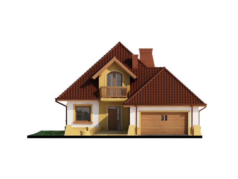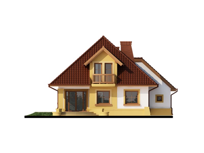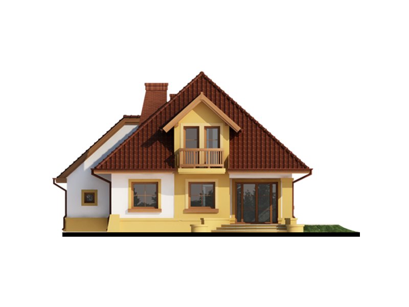 Dom z poddaszem użytkowym, przeznaczony dla 4-5-osobowej rodziny. Na parterze znajduje się przestronny pokój dzienny połączony z jadalnią i otwartą kuchnią. Rozwiązanie funkcjonalne pozwala na wydzielenie ww. pomieszczeń. Wyjście na taras z podcieniem jest możliwe zarówno z części wypoczynkowej pokoju dziennego jak i z części przeznaczonej na jadalnie. Na parterze znajdują się dwa pomieszczenia gospodarcze, z których jedno jest dostępne poprzez garaż, a drugie bezpośrednio z holu i ponieważ znajduje się w bliskim sąsiedztwie kuchni może pełnić rolę spiżarni. Usytuowanie pomieszczeń gospodarczych daje możliwość ich połączenia. Na parterze znajduje się także dodatkowy pokój i łazienka. Na poddaszu znajdują się trzy sypialnie, łazienka z wydzielonym aneksem na pralnie oraz garderoba. Hol na poddaszu posiada wnękę przeznaczoną na szafę. Dzięki prostym rozwiązaniom konstrukcyjnym i nieskomplikowanej bryle jest on niedrogi w budowie i eksploatacji. Projekt dostępny w lustrzanym odbiciu.