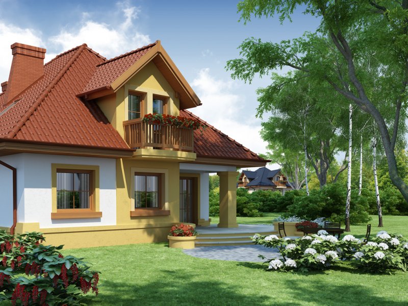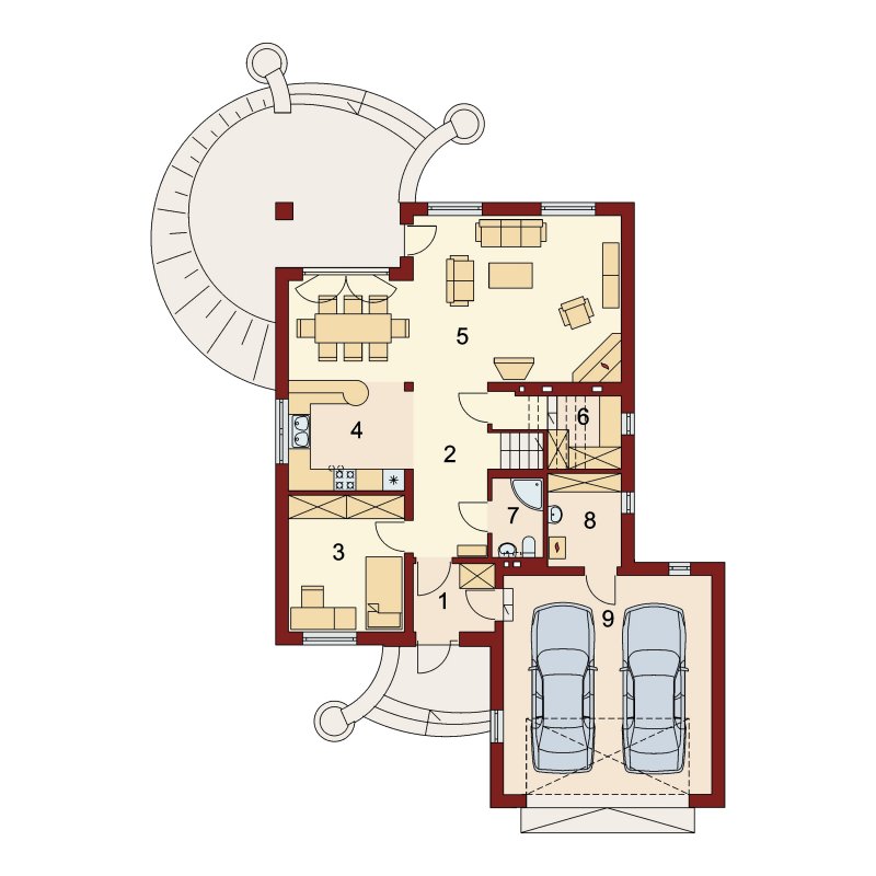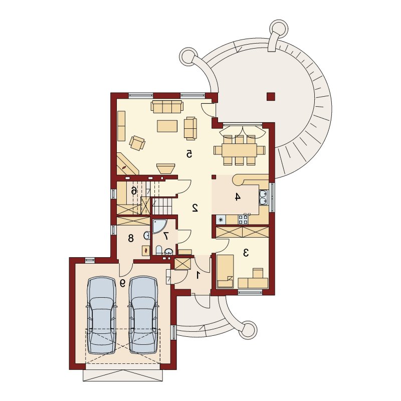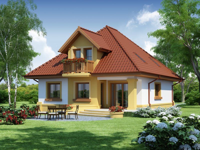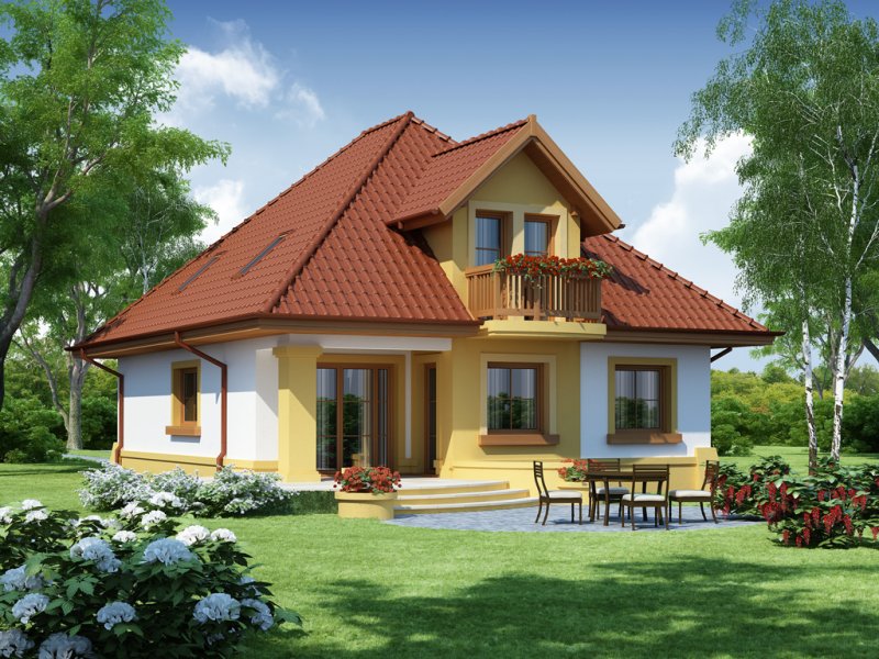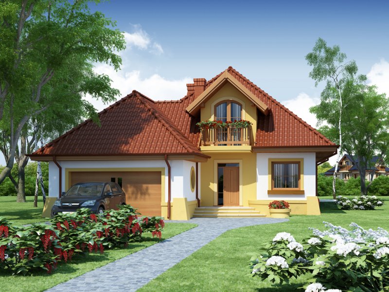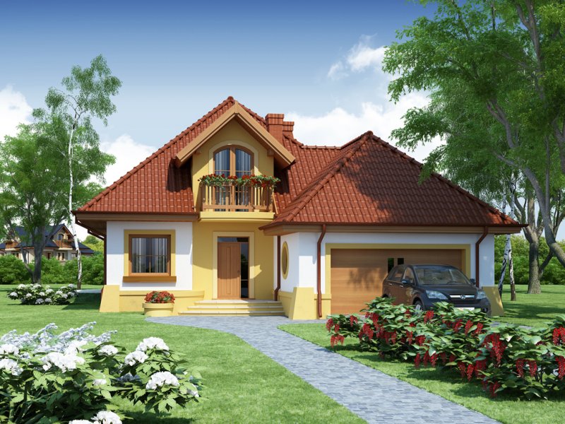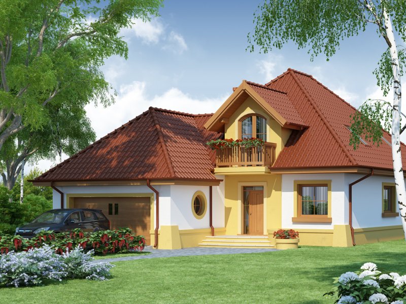 Dom z poddaszem użytkowym, przeznaczony dla 4-5-osobowej rodziny. Na parterze znajduje się przestronny pokój dzienny połączony z jadalnią i otwartą kuchnią. Rozwiązanie funkcjonalne pozwala na wydzielenie ww. pomieszczeń. Wyjście na taras z podcieniem jest możliwe zarówno z części wypoczynkowej pokoju dziennego jak i z części przeznaczonej na jadalnie. Na parterze znajdują się dwa pomieszczenia gospodarcze, z których jedno jest dostępne poprzez garaż, a drugie bezpośrednio z holu i ponieważ znajduje się w bliskim sąsiedztwie kuchni może pełnić rolę spiżarni. Usytuowanie pomieszczeń gospodarczych daje możliwość ich połączenia. Na parterze znajduje się także dodatkowy pokój i łazienka. Na poddaszu znajdują się trzy sypialnie, łazienka z wydzielonym aneksem na pralnie oraz garderoba. Hol na poddaszu posiada wnękę przeznaczoną na szafę. Dzięki prostym rozwiązaniom konstrukcyjnym i nieskomplikowanej bryle jest on niedrogi w budowie i eksploatacji. Projekt dostępny w lustrzanym odbiciu.