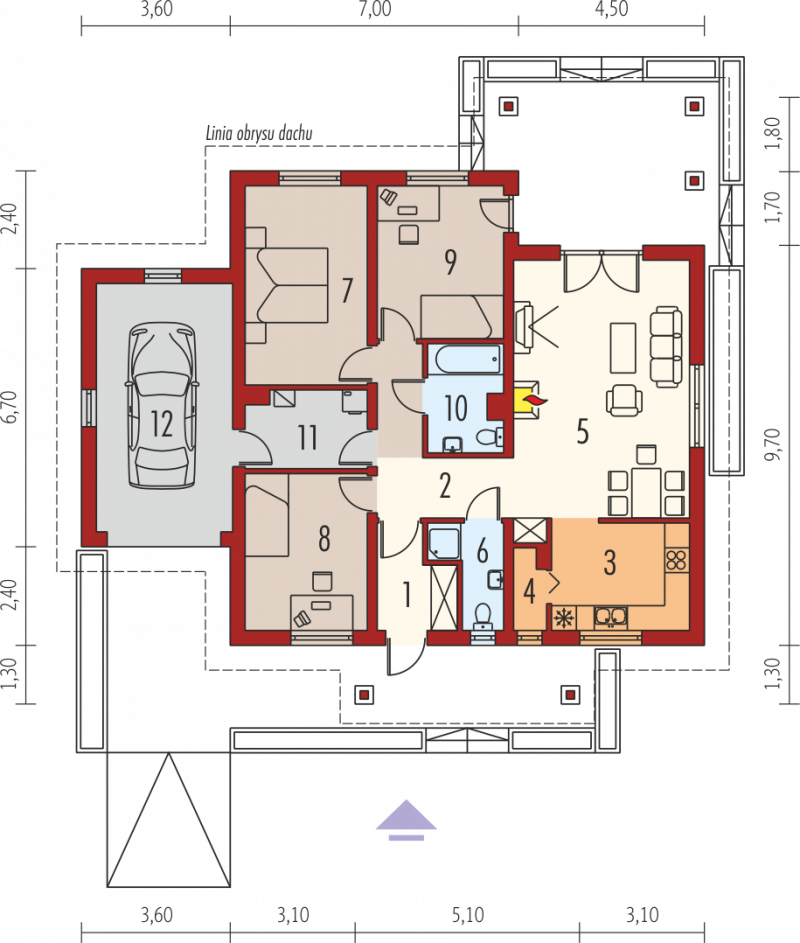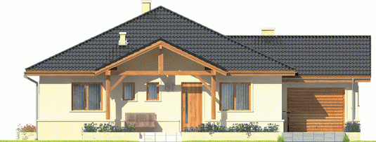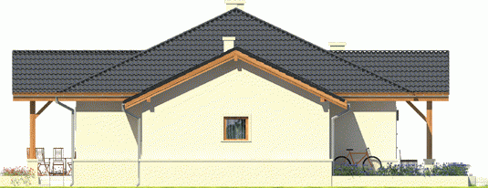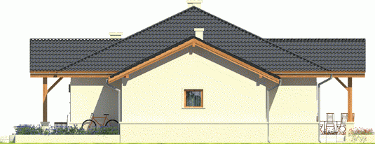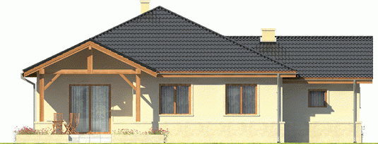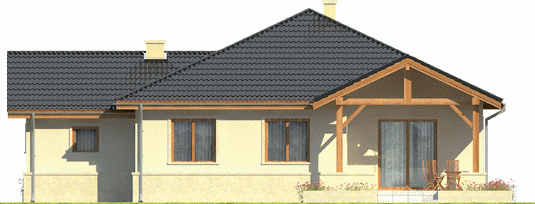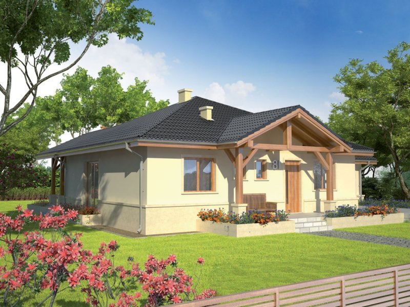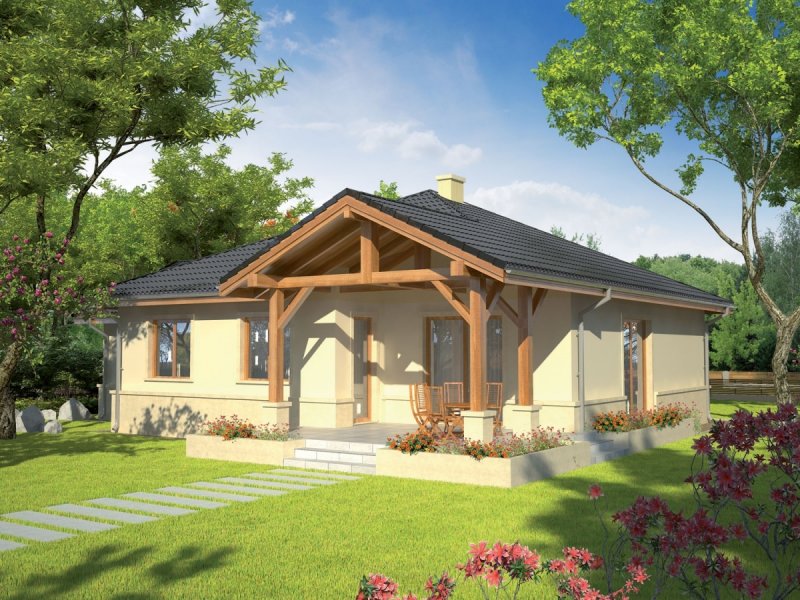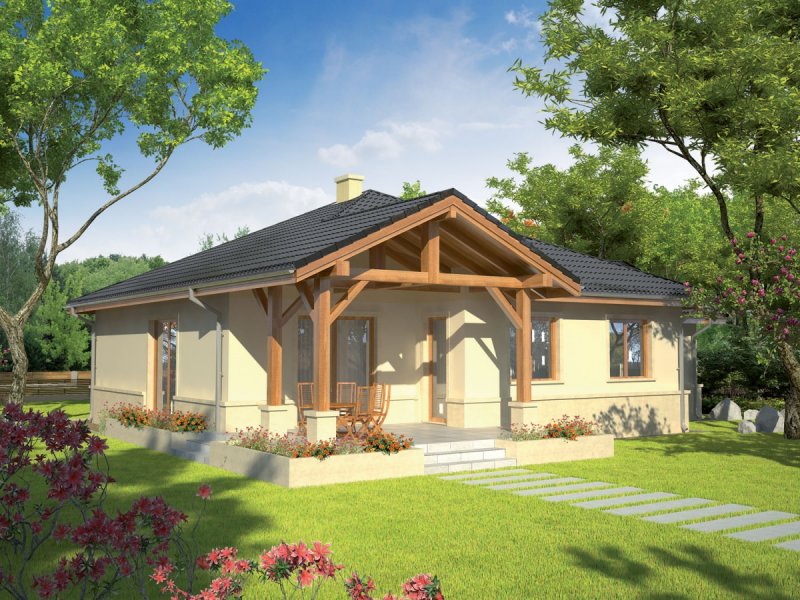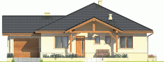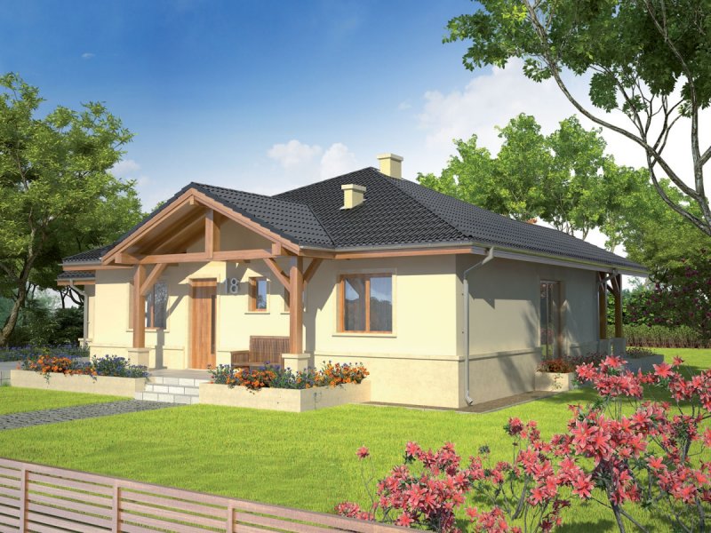 Dom parterowy, niepodpiwniczony, z garażem jednostanowiskowym, przeznaczony dla 3-4-osobowej rodziny. Apollo wyróżnia się maksymalnym wykorzystaniem powierzchni użytkowej. Na stosunkowo niewielkiej przestrzeni udało się zaprojektować ekonomiczny i funkcjonalny układ pomieszczeń. Strefę dzienną tworzy kuchnia ze spiżarnią, jadalnia oraz reprezentacyjny salon z kominkiem. Strefa nocna mieści sypialnię oraz dwa pokoje. W domu znajdują się ponadto dwie komfortowe łazienki oraz praktyczne pomieszczenie gospodarcze. Urzekającym elementem jest także taras dostępny z salonu i jednego z pokoi, który będący przedłużeniem ogrodu. Tradycyjna bryła domu została urozmaicona przykuwającym uwagę zadaszeniem nad wejściem. Elewacja w przyjaznych, ciepłych kolorach podkreśla przytulny charakter domu. Niepowtarzalnego uroku dodają czarujące, drewniane detale. Jest możliwość zbliźniaczenia domu.