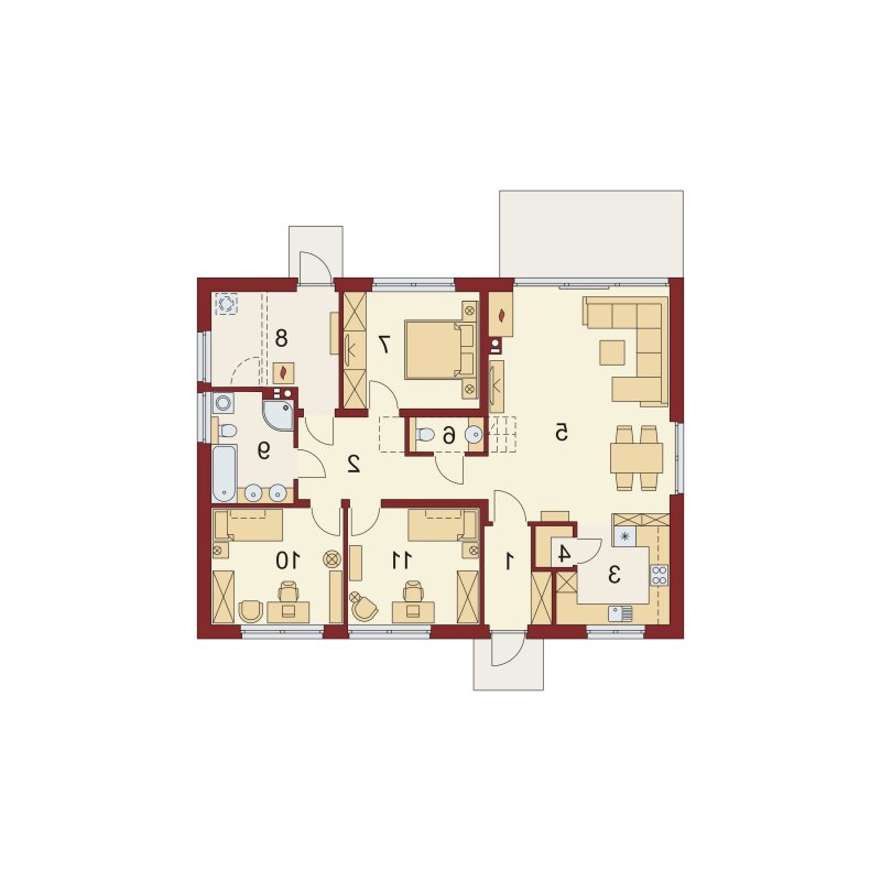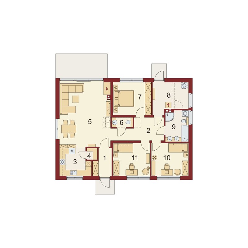 ATLANT 3 PS to projekt stworzony z myślą o 4-osobowej rodzinie. Przez wygodny przedsionek z miejscem na szafę, wchodzimy do przestronnego salonu połączonego z jadalnią. Kuchnię, można otworzyć na część dzienną, lub pozostawić oddzieloną meblami, natomiast spiżarnię w zależności od upodobań można przeznaczyć na miejsce dla dodatkowych szaf kuchennych czy powiększenie przestrzeni na odzież w wiatrołapie. Przy przejściu do zacisznej części nocnej znajduje się dogodnie umiejscowiona toaleta, za którą znajdują się trzy obszerne sypialnie orazkompleksowo wyposażona łazienka z której mozna zrobić przejście do pralni, wydzielonej z pomieszczenia gospodarczego w ramach adaptacji. Zastosowanie stopu gęstożebrowego umożliwia ponadto bezproblemową aranżację pomieszczeń na poddaszu projektując schody w miejscu obecnego WC.