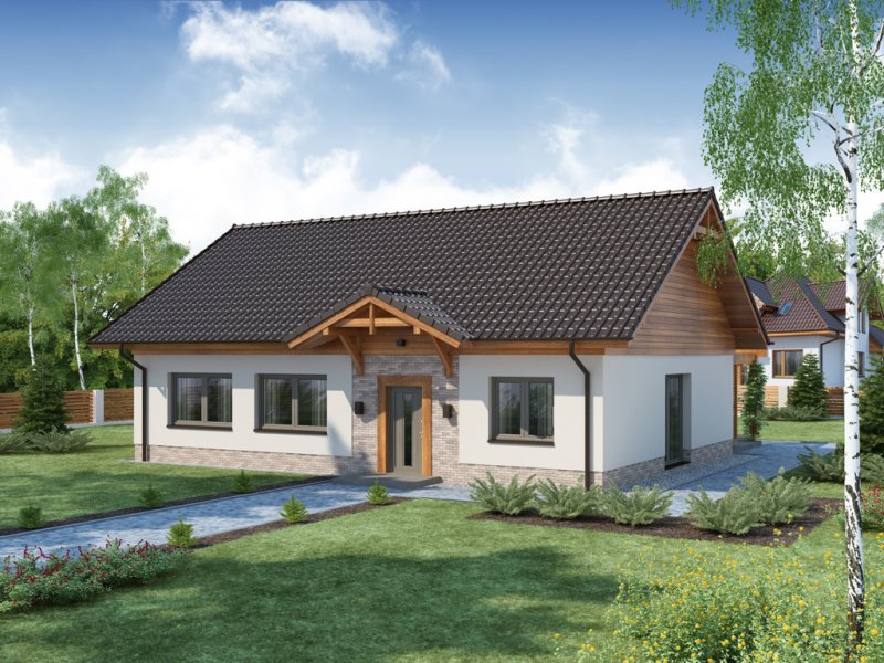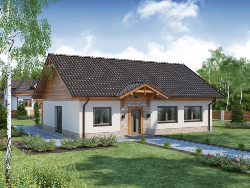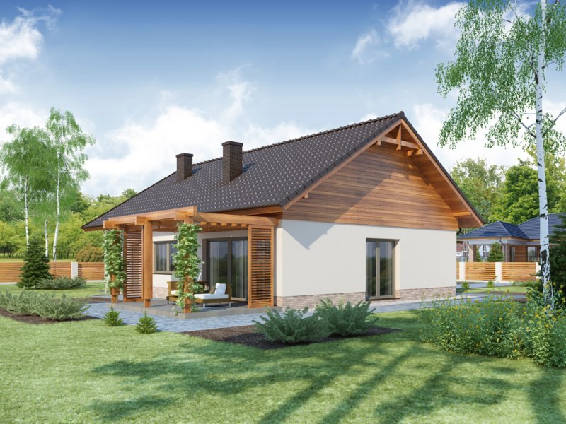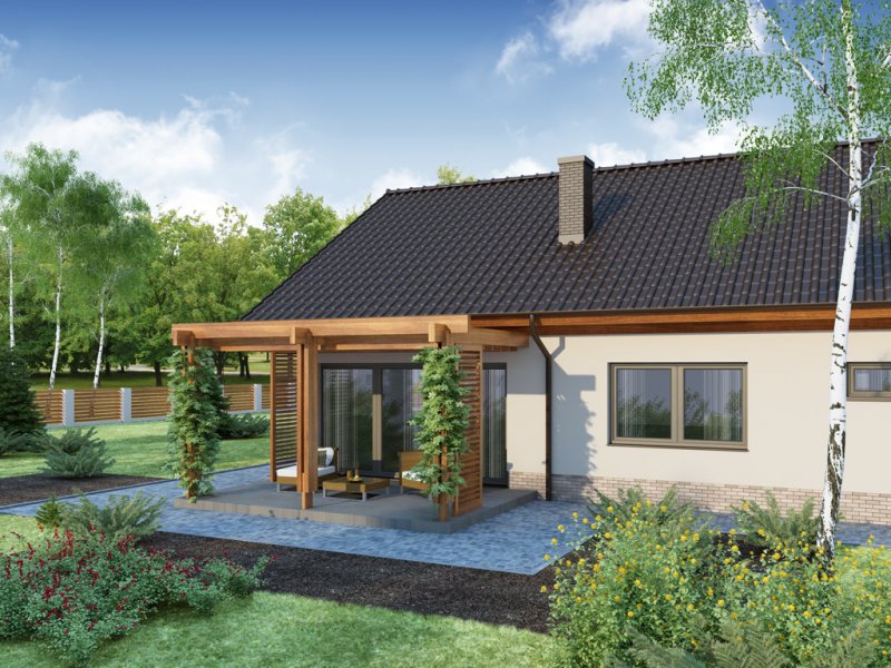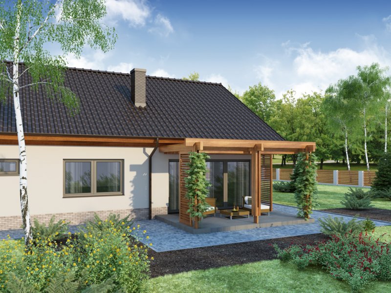 Wizualizacja jest propozycją tego jak dany projekt domu oraz jego otoczenie można zaaranżować. Sposób prowadzenia tarasu, kształt murków i elementy małej architektury typu pergole, donice itp. nie są objęte zakresem projektu. W związku z powyższym na projekcie budowlanym elementy te mogą nie być uwzględnione w projekcie ( patrz pergole ) lub zmieniony może być ich kształt i sposób prowadzenia ( wielkości tarasów, profil murków )