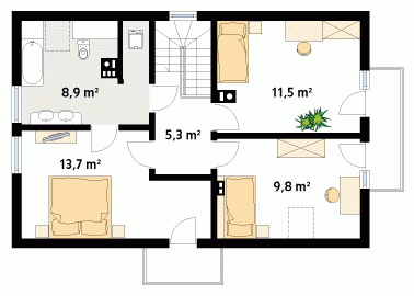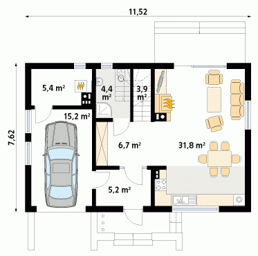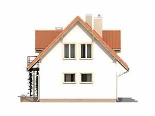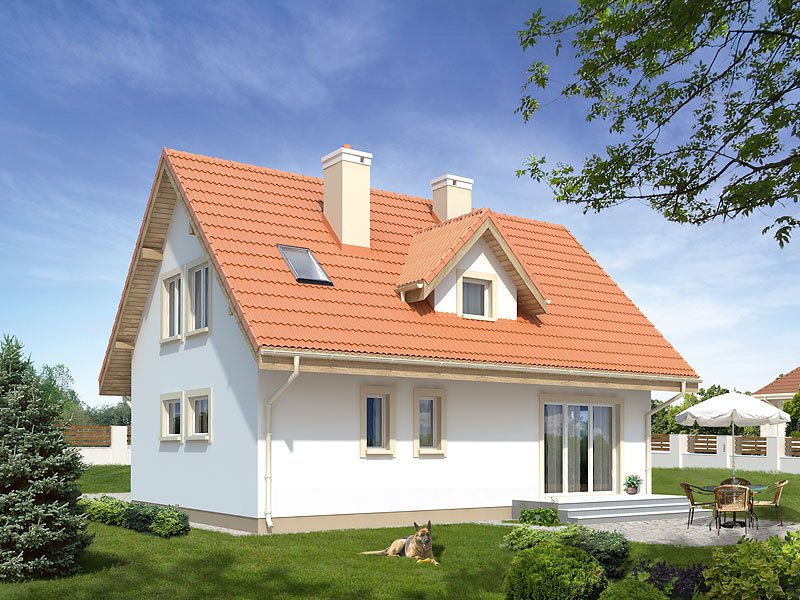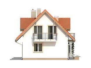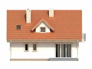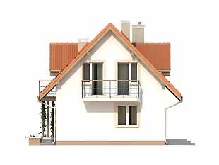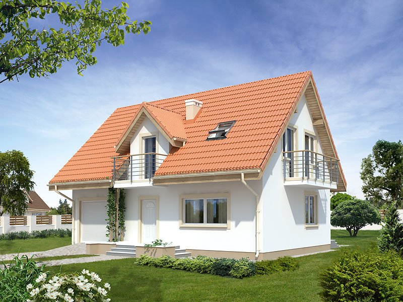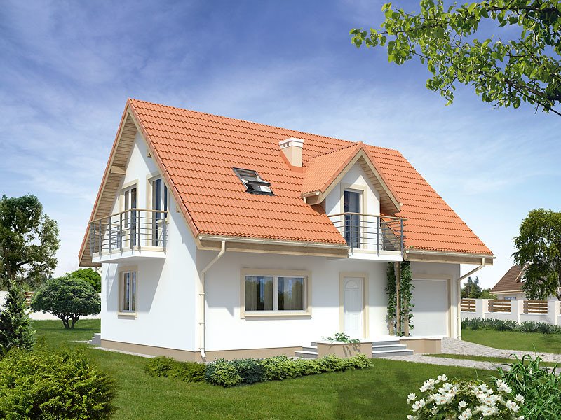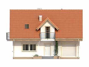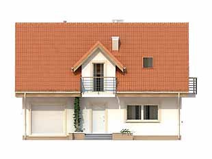 Mały dom jednorodzinny z użytkowym poddaszem i garażem w bryle budynku. Idealny dla niewielkiej rodziny. Na parterze znajduje się przestronna część dzienna i pomieszczenia gospodarcze, na poddaszu trzy wygodne sypialnie z balkonami i duża łazienka z pralnią.
