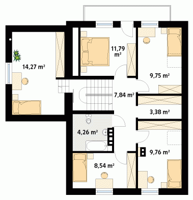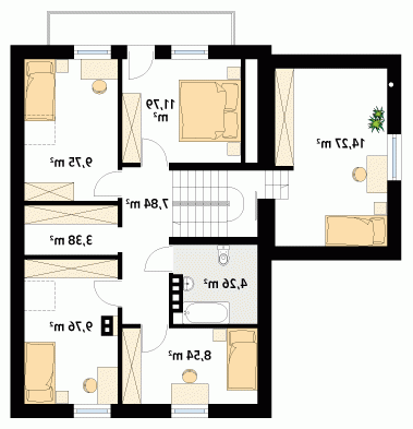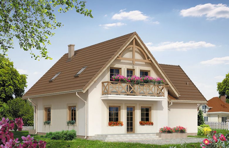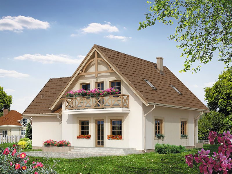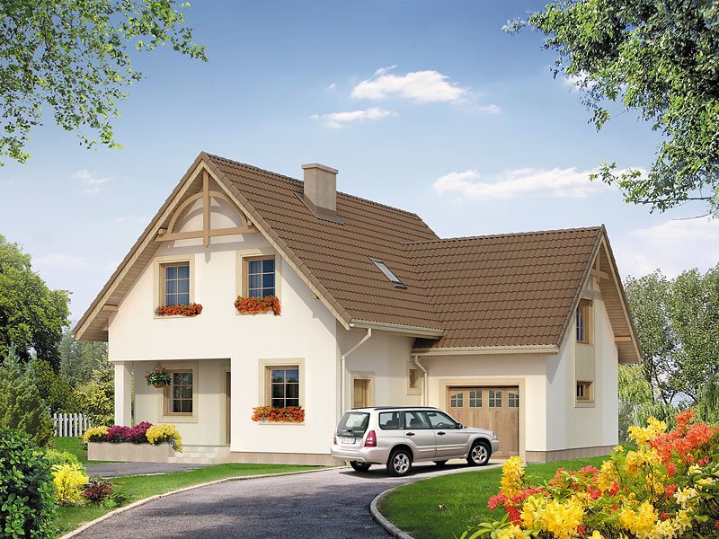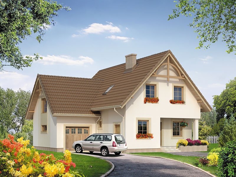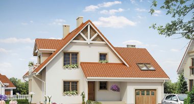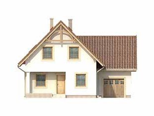 Dom jednorodzinny z użytkowym poddaszem i garażem, zaprojektowany dla dużej rodziny. Na parterze znajdziemy dodatkowy pokój. Na poddaszu zaprojektowano aż pięć sypialni, łazienkę oraz garderobę.