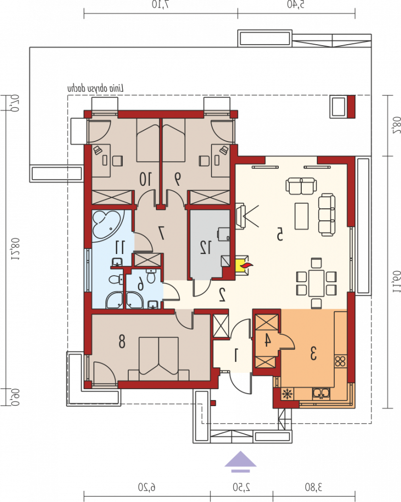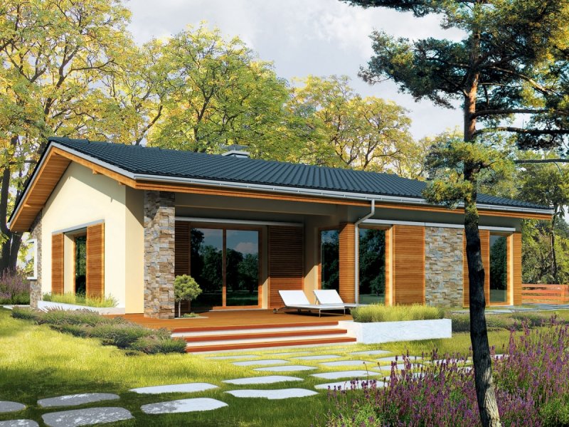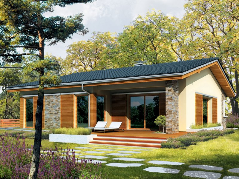 Dom zaprojektowany w technologii murowej ze stropem gęstożebrowym. Dach o konstrukcji drewnianej pokryty blachodachówką. Więźba dachowa dostępna również w systemie prefabrykacji drewnianej. Elewacje wykończono tynkiem mineralnym oraz okładziną drewnianą. Stolarka okienna drewniana lub PCV.