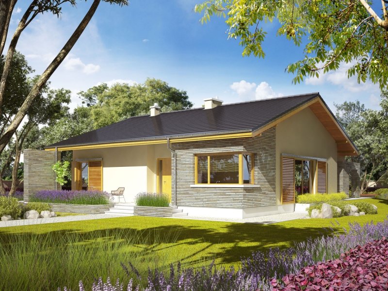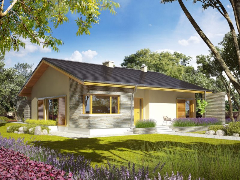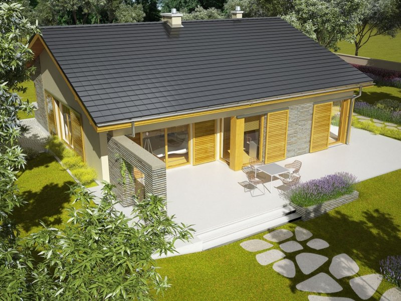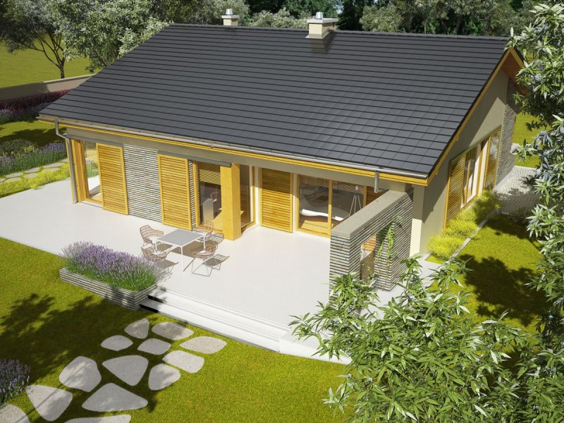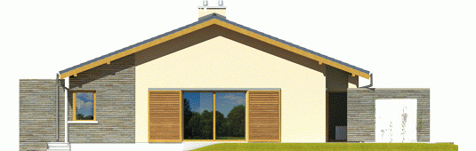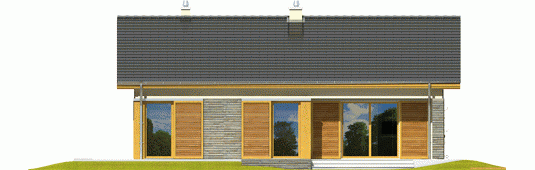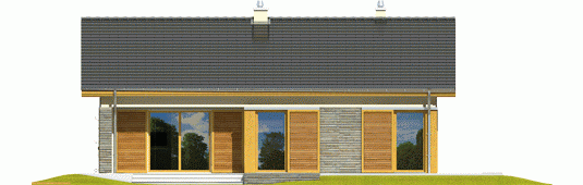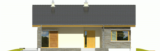 Dom zaprojektowany w technologii murowej ze stropem gęstożebrowym. Dach o konstrukcji drewnianej pokryty dachówką cementową. Elewacje wykończono tynkiem mineralnym oraz okładziną drewnianą. Stolarka okienna drewniana lub PCV.