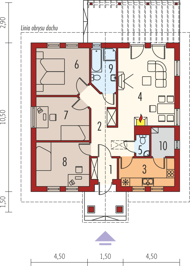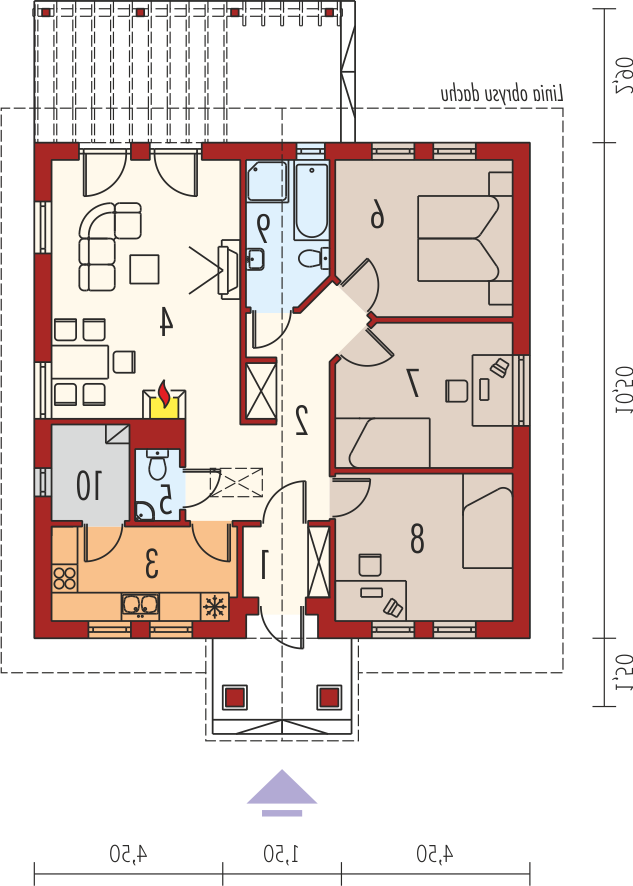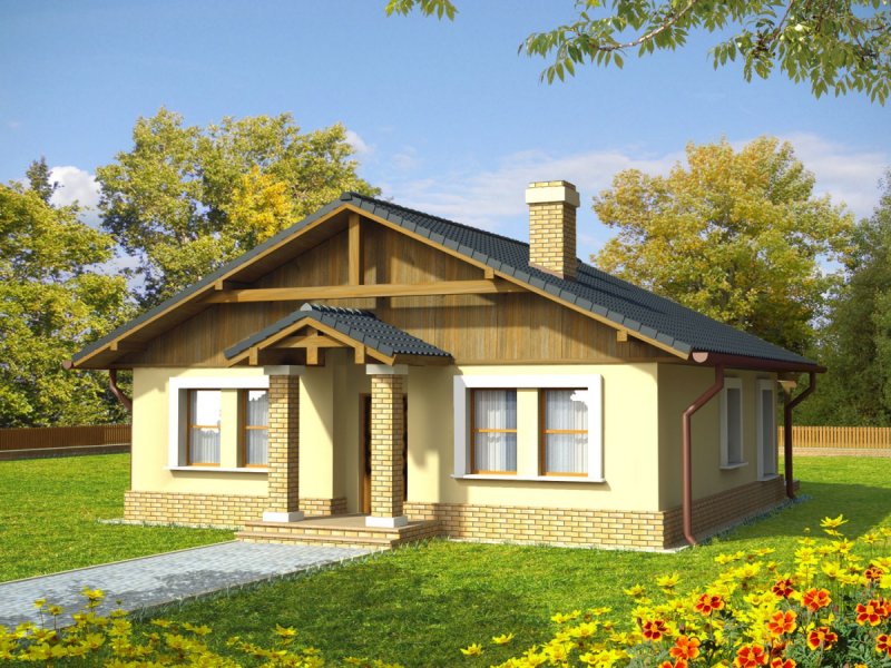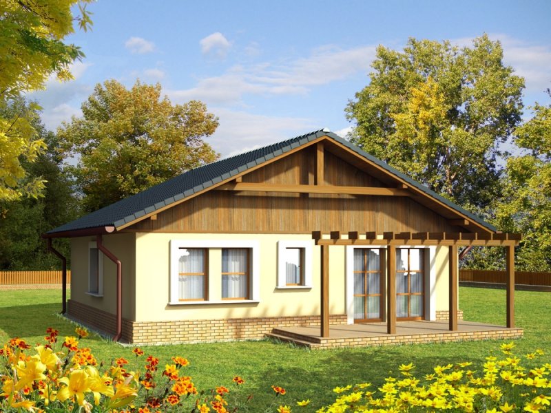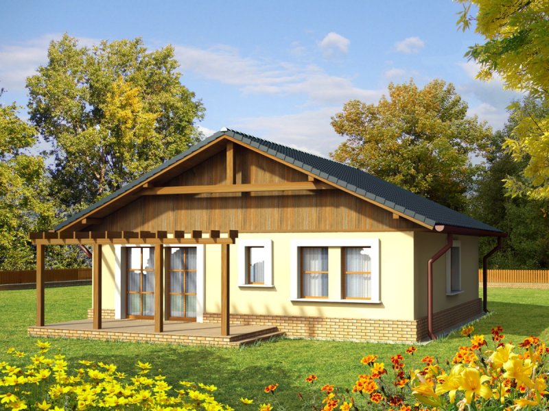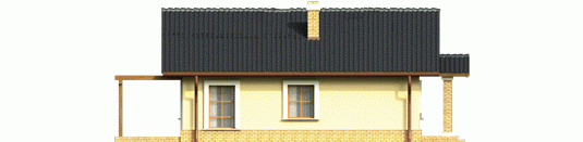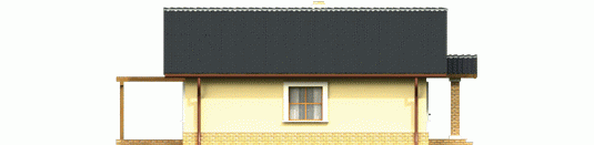 Dom parterowy niepodpiwniczony zaprojektowany dla 4-5 osobowej rodziny. Wnętrze nie posiada ścian konstrukcyjnych co umożliwia jego dowolną aranżację. Poddasze można wykorzystać jako pomieszczenie gospodarcze dostępne przez składane schody. Projekt domu dostępny jest w dwóch wersjach w zależności od usytuowania dachu - kalenicą lub szczytem do frontu.