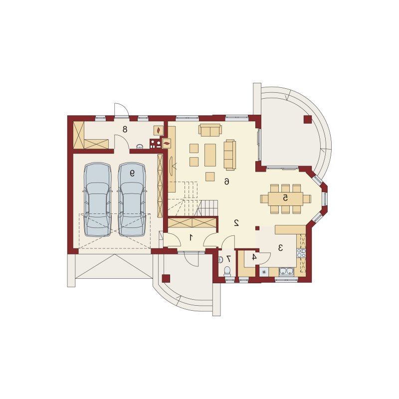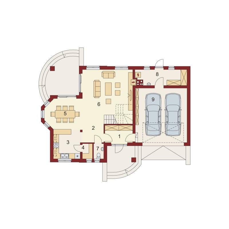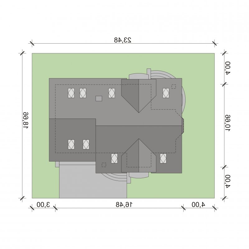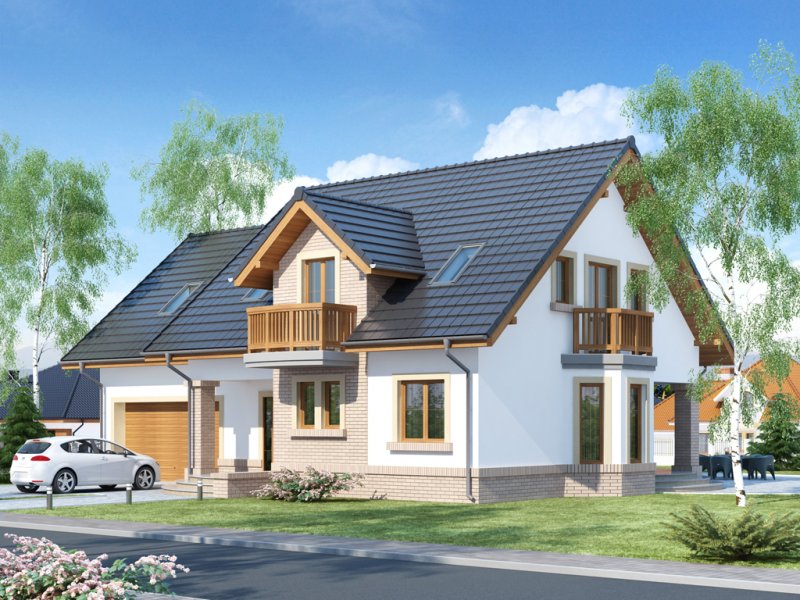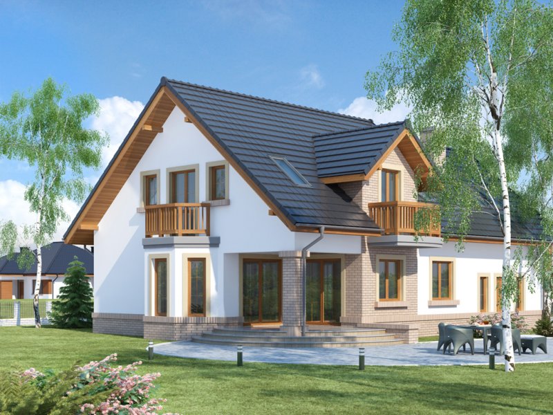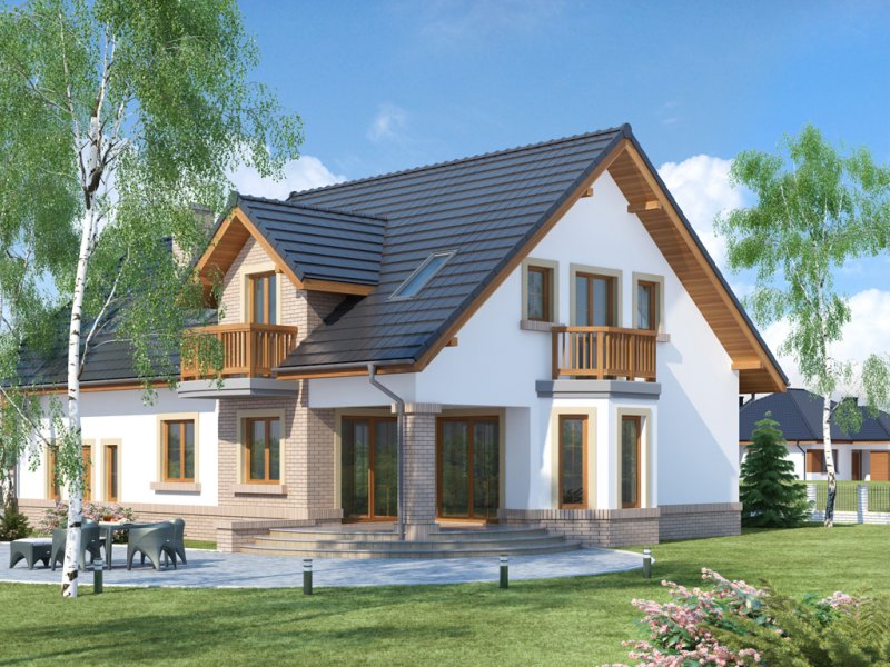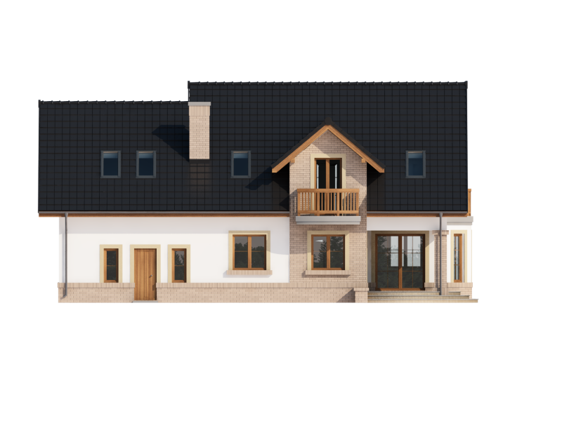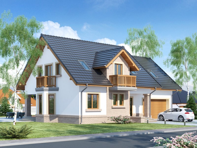 Bonita 2 to funkcjonalny dom o tradycyjnej bryle, przeznaczony dla 4-osobowej rodziny. Mijając zadaszone wejście, trafiamy do ustawnego wiatrołapu z miejscem na szafy pod zabudowę. Wiatrołap dzieli strefę dzienną domu ze strefą gospodarczą. W skład strefy dziennej wchodzi oświetlona wieloma przeszkleniami jadalnia umieszczona w wykuszu, salon z przytulnym kominkiem i widokiem na zadaszony taras, otwarta kuchnia z praktyczną spiżarnią oraz wc. Zwolennicy kuchni zamkniętych, dzięki zastosowaniu ścianki działowej, mają możliwość wydzielenia samej kuchni lub całej części kuchenno-jadalnianej. Według potrzeb domowników, istnieje możliwość przekształcenia wc w łazienkę kosztem spiżarni. Dostęp na taras przewidziano zarówno z salonu jak i strefy jadalni. Część gospodarcza domu to dwustanowiskowy garaż oraz pomieszczenie gospodarcze/kotłownia wyposażone w dodatkowe wyjście na ogród. Na poddaszu znajduje się strefa nocna domu, która składa się z trzech sypialni, ogólnodostępnej łazienki oraz strychu. Dwa pokoje zaprojektowano z odrębną garderobą, dodatkowo jedna z sypialni posiada indywidualną łazienkę. Strych dostępny z półpiętra można w ramach adaptacji przeznaczyć na dodatkowy pokój hobby, gabinet itp.