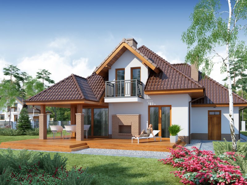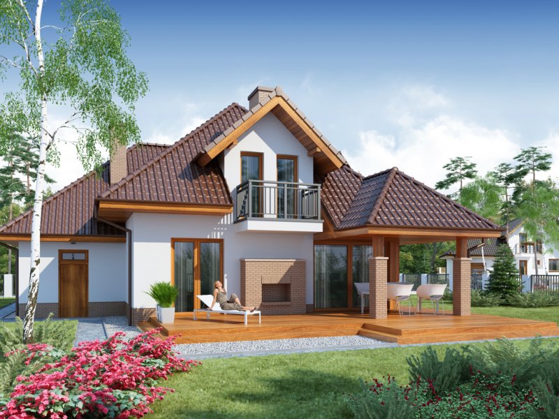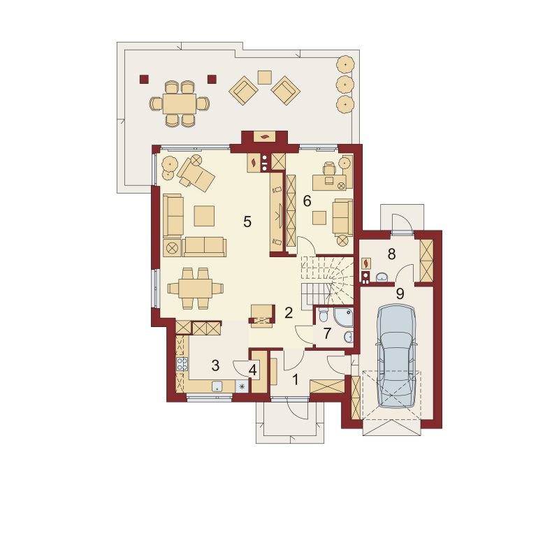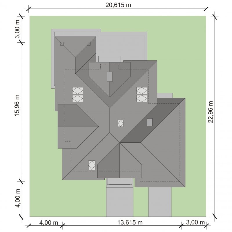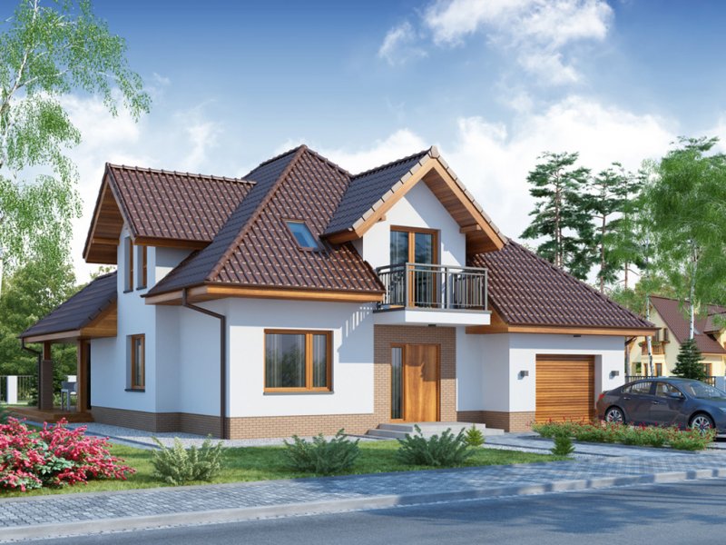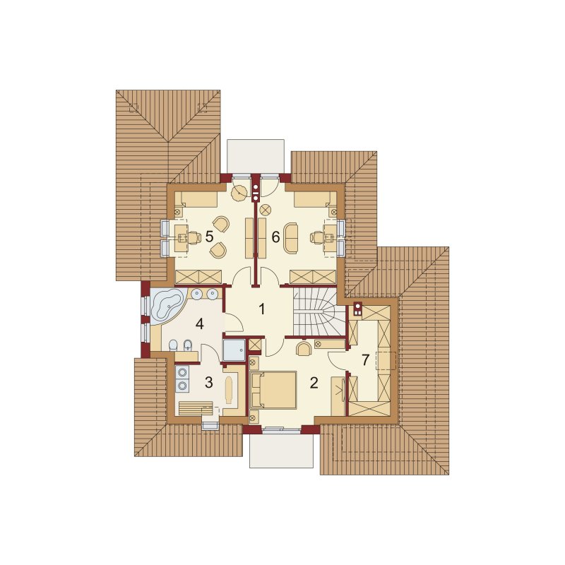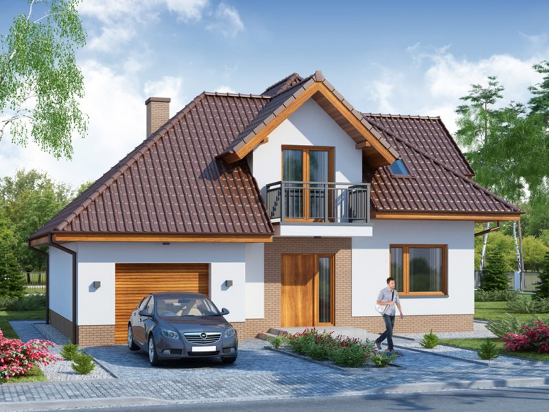 CELINA to dom parterowy z poddaszem użytkowym, zaprojektowany dla 4-5-osobowej rodziny. Wiatrołap z miejscem na szafę wiedzie do przestronnego salonu połączonego z jadalnią. Przylegającą kuchnię, częściowo wydzieloną ścianą działową, można całkowicie zamknąć lub otworzyć na resztę strefy dziennej. Na parterze zlokalizowano też obszerny gabinet, mogący pełnić funkcję pokoju gościnnego lub kolejnej sypialni, oraz łazienkę. Poprzez wiatrołap dostępny jest również garaż i usytuowane za nim pomieszczenie gospodarcze z praktycznym wyjściem do ogrodu. Na poddaszu znajdują się trzy duże sypialnie i salon łazienkowy wraz z z dostępną z niego sporą pralnią, oraz garderoba dostępna z głównej sypialni.