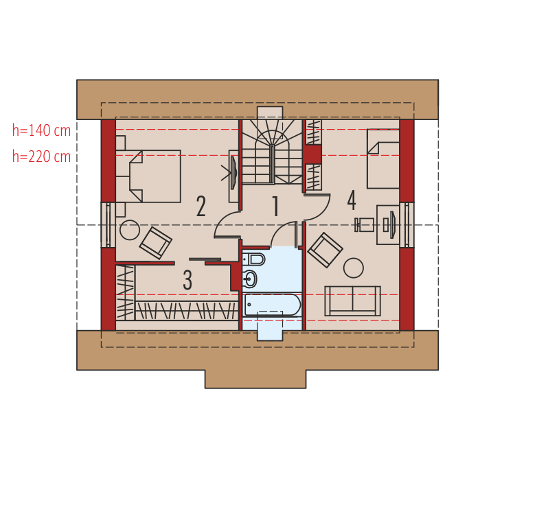 Strefa nocna – poddasze: dwie sypialnie, w tym sypialnia główna z garderobą oraz oddzielna łazienka