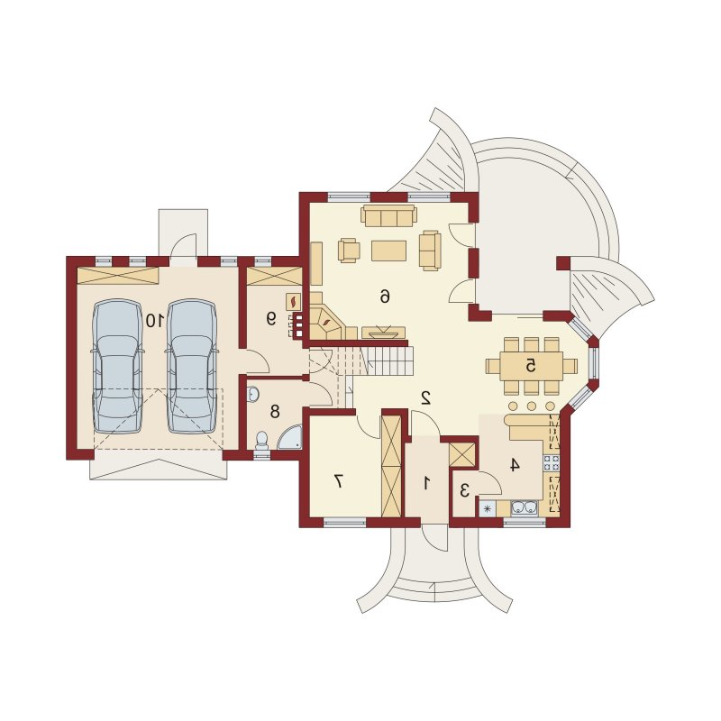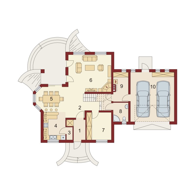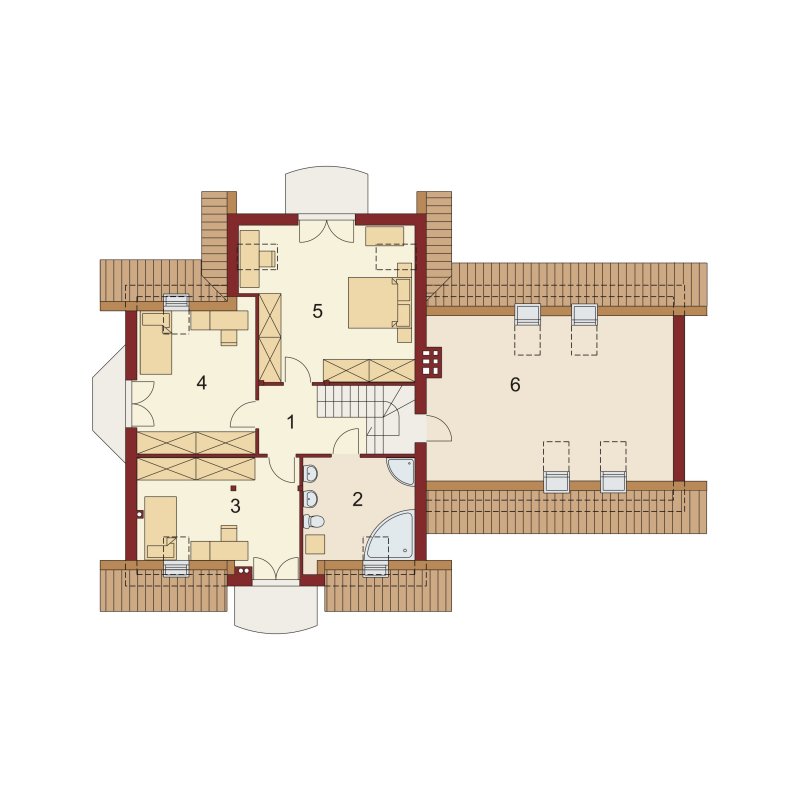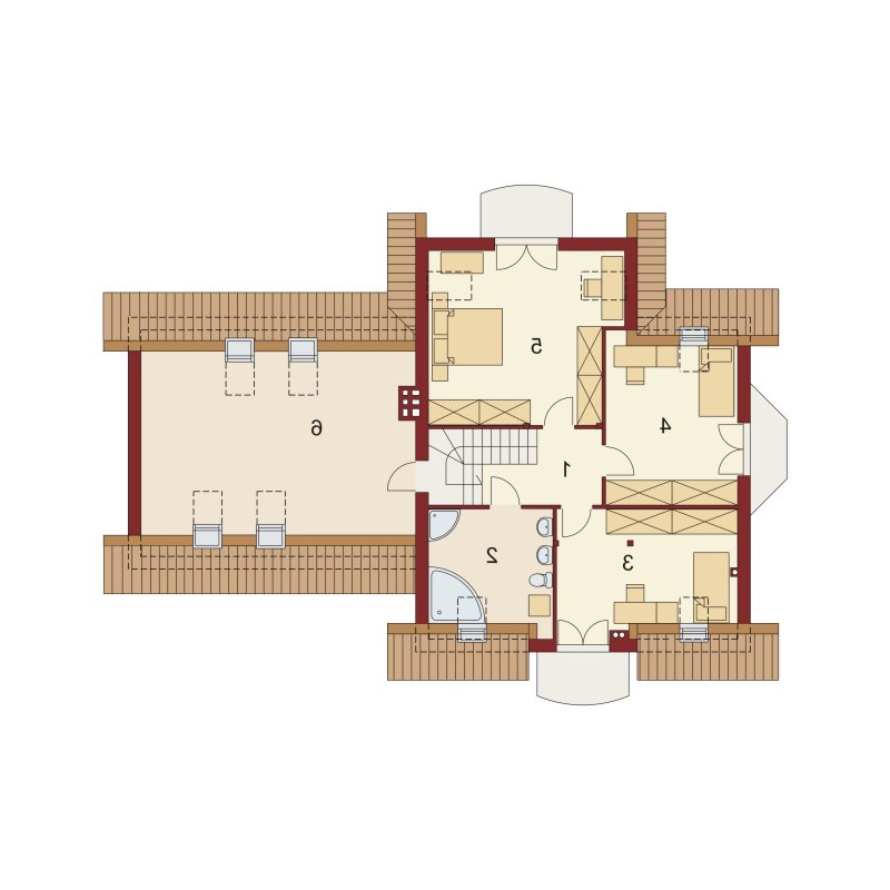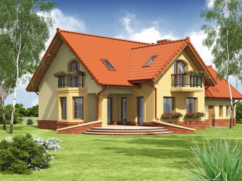 Tradycyjny dom jednorodzinny z poddaszem. Główną zaletą oraz cechą domu jest jego nasłonecznienie, dzięki temu jest to dom jasny i optymistyczny. Przestrzeń jaką posiada jadalnia, zlokalizowana w wykuszu, z powodzeniem pomieści dodatkowy stół. Jest to nie lada zaleta i okazja do wspólnego biesiadowania z przyjaciółmi i rodziną. Ciekawym pomysłem są dwa wyjścia z salonu na taras, z pewnością zostaną one wykorzystane w pogodne letnie wieczory. Łazienka, pomieszczenie gospodarcze oraz garaż to osobna część parteru. Jest to bardzo wygodne dla domowników – dzieli dom na poszczególne strefy: mieszkalną, intymną łazienkę oraz gospodarczą. Poddasze, z trzema sypialniami oraz łazienką, stanowi strefę nocną domku. Usytuowanie oraz rozmiar strychu sprzyja jego adaptacji na dodatkowe pomieszczenia podnoszące komfort i wygodę.
