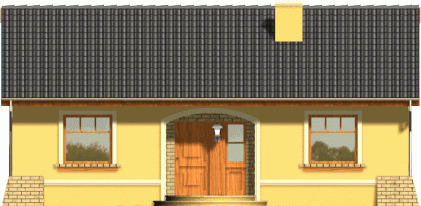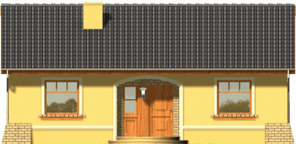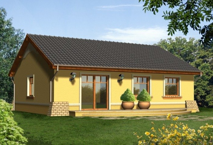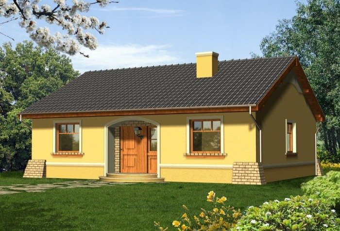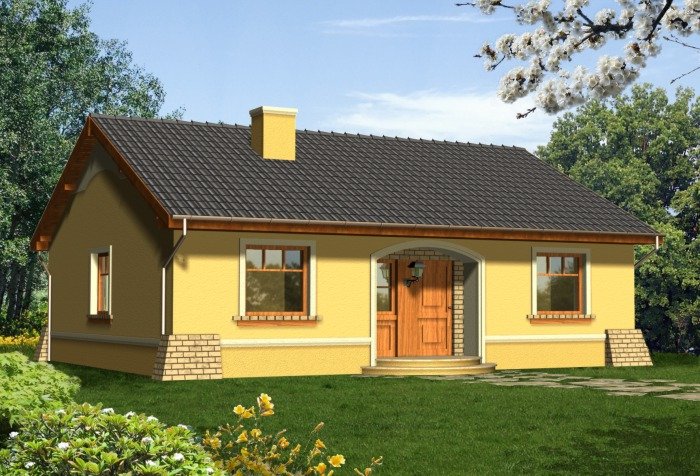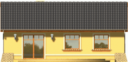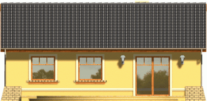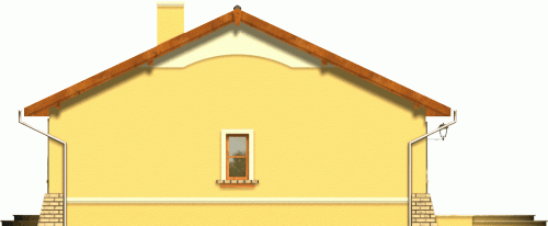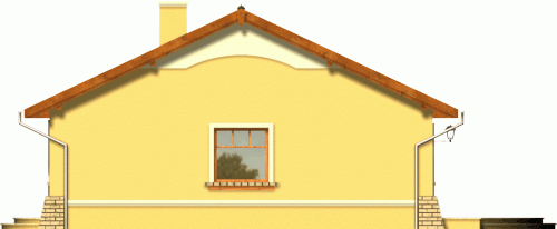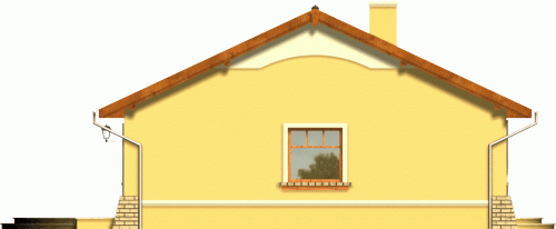 Prosty dom z dachem dwuspadowym. Od frontu zwraca uwagę reprezentacyjne wejście na osi budynku podkreślone łukową wnęką. Od strony ogrodu przykuwa wzrok szeroki taras, na który wejście prowadzi poprzez dwuskrzydłowe okno balkonowe w salonie. Dzięki harmonijnie zaprojektowanym fasadom ten tani domek prezentuje się atrakcyjnie nawet przy swoich niewielkich gabarytach.