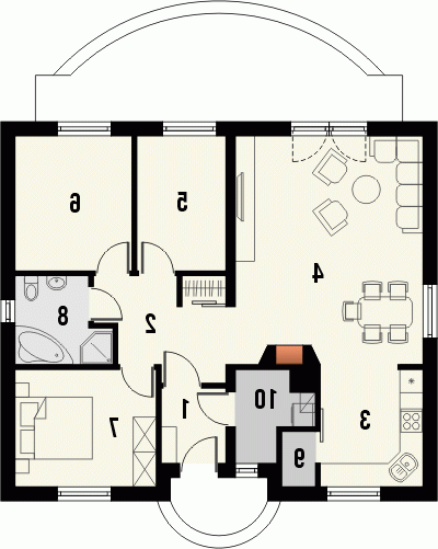 Budynek niepodpiwniczony parterowy. Obok salonu z kuchnią i spiżarką znalazła się także wydzielona strefa nocna składająca się z trzech sypialni i łazienki z wanną i prysznicem. Z wiatrołapu dostępne jest pomieszczenie gospodarcze przylegające do bloku kominowego zawierającego przewody kominowe zarówno od pieca c.o., jak i kominka w pokoju dziennym. Dokumentacja dostępna również w odbiciu lustrzanym.