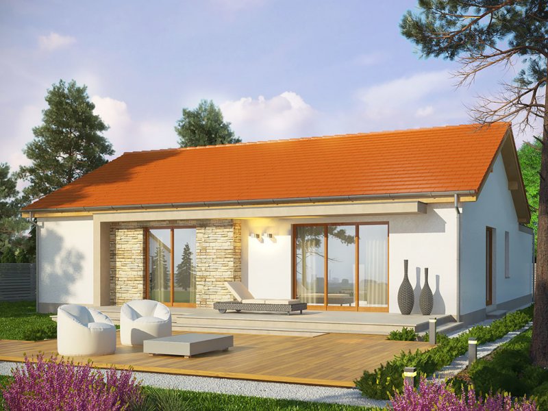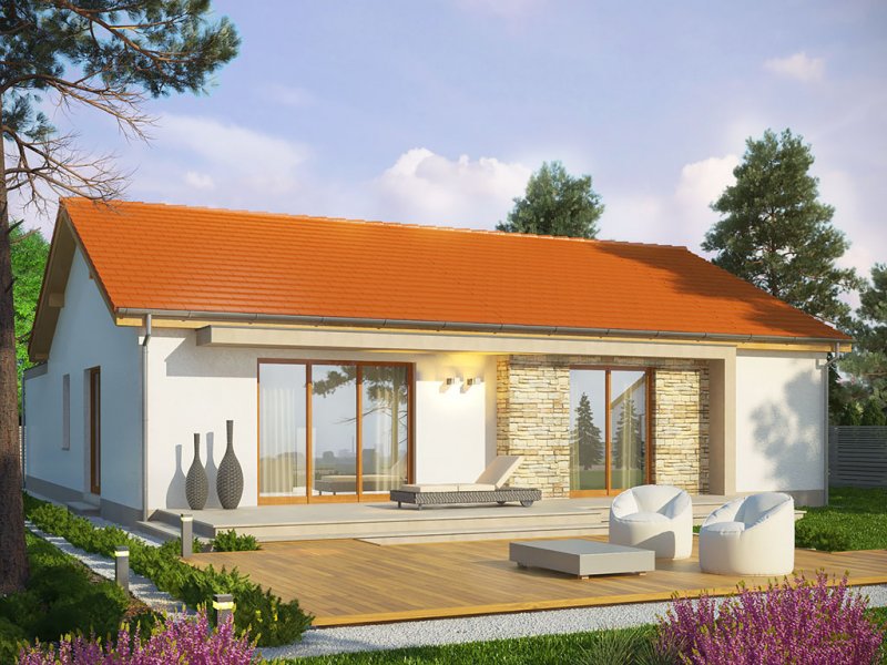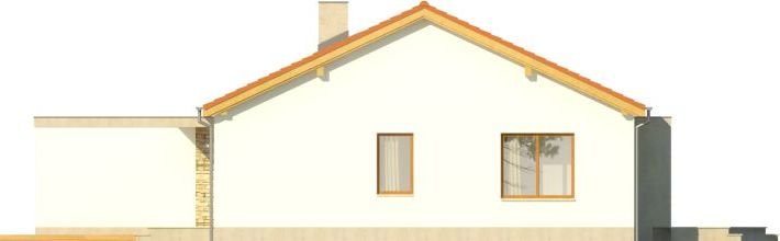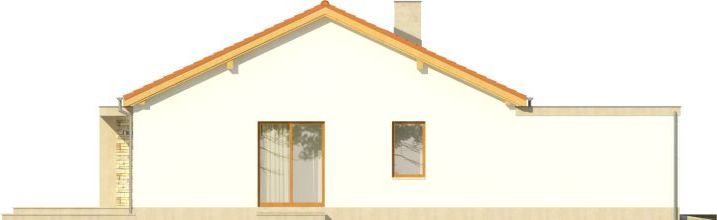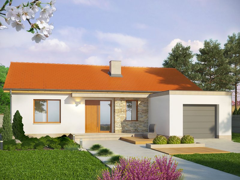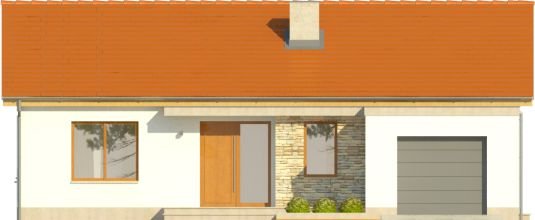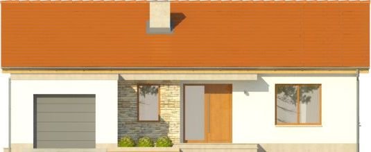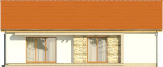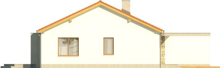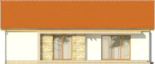 Dom ma ekonomiczną bryłę, przekryty jest tanim w wykonaniu dachem dwuspadowym. Wyróżniającą cechą tego projektu jest motyw białej ramy – pojawia się od zarówno od strony ogrodu, jak i wokół strefy wejściowej do budynku, zapewniając częściowe zadaszenie. Zaproponowano ciepłą, lekką kolorystykę – dach w kolorze ceglastym, białe elewacje urozmaicone okładziną z płytek kamiennych, jasna, drewniana stolarka okienna.