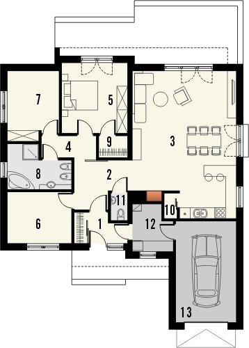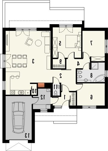 Dimaro 2 to parterowy dom jednorodzinny z garażem jednostanowiskowym, kryty dachem dwuspadowym. W projekcie przewidziano przestronny salon z jadalnią oraz otwartą kuchnię ze spiżarką. Zaprojektowano także dodatkowy pokój oraz wc. Z wiatrołapu dostępne jest pomieszczenie gospodarcze, z którego można się dostać do garażu. Z holu przejść można do strefy nocnej domu, gdzie znajdują się dwa pokoje, w tym jeden z garderobą oraz łazienka. Projekt dostępny jest w wersji standard i lustro.