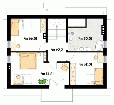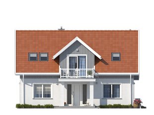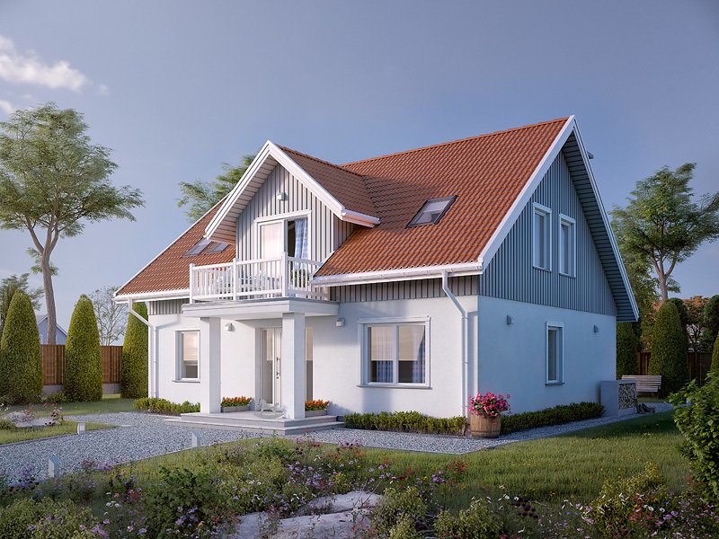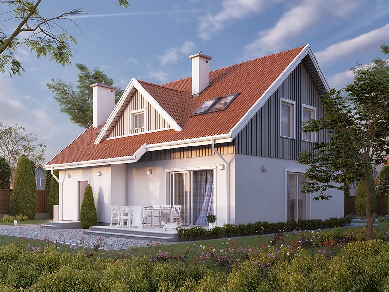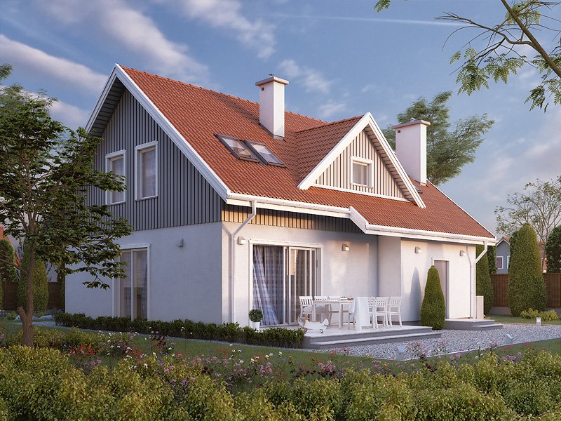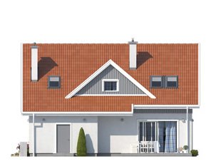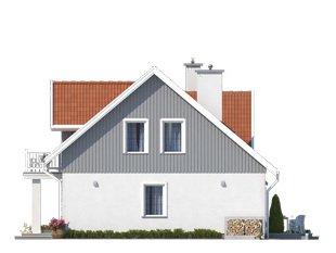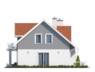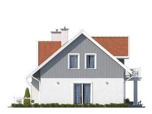 Dom jednorodzinny z poddaszem użytkowym. Na parterze zaprojektowano otwartą przestrzeń pokoju dziennego połączoną z kuchnią, dodatkowy pokój, sporą kotłownię i łazienkę. Na poddaszu zlokalizowano trzy sypialnie i łazienkę.