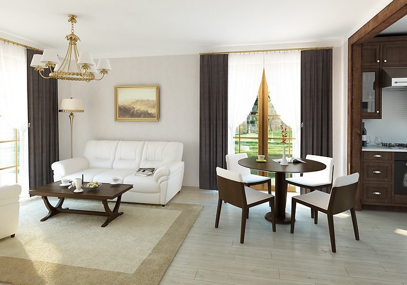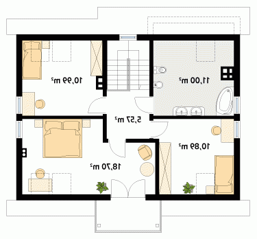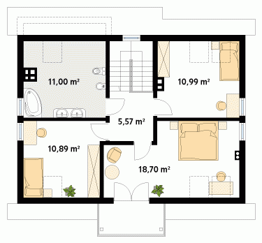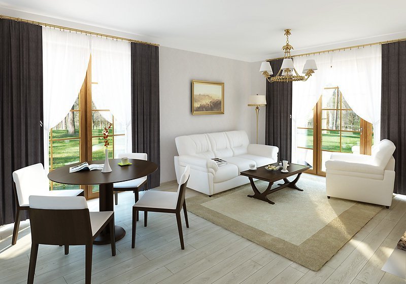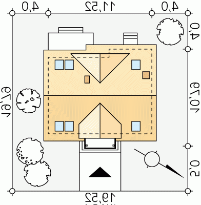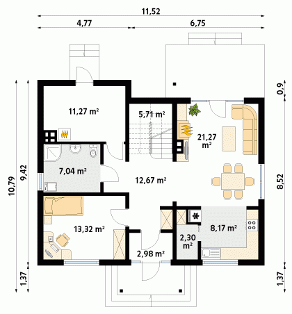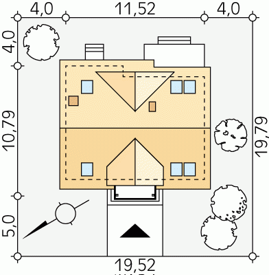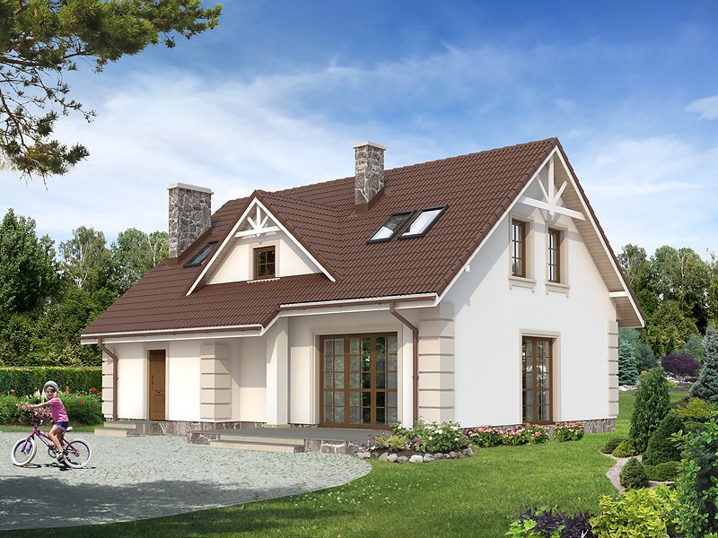 Jednorodzinny dom parterowy z użytkowym poddaszem. Klasyczna bryła budynku na rzucie prostokąta przykryta dwuspadowym dachem. Dom posiada optymalny program dla 4-osobowej rodziny. Na parterze przewidziano w części dziennej otwartą przestrzeń salonu i jadalni, kuchnię ze spiżarnią i dodatkowy pokój, w części gospodarczej łazienkę z kotłownią. Na poddaszu zaprojektowano 3 sypialnie oraz łazienkę.