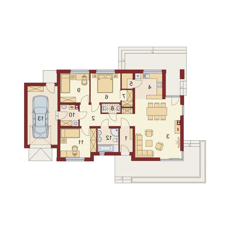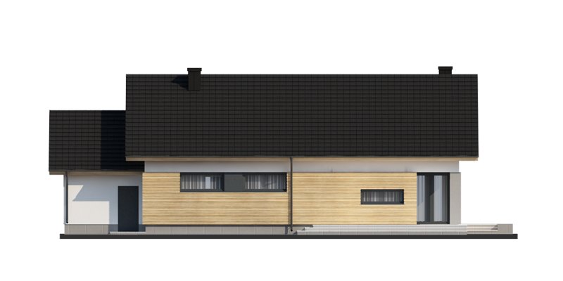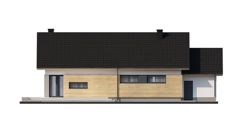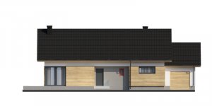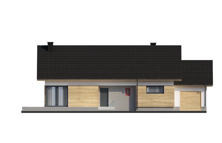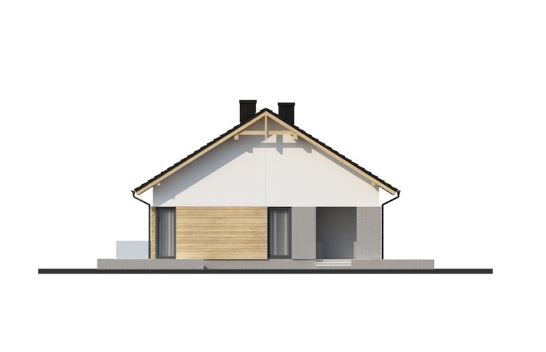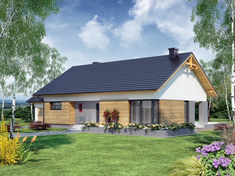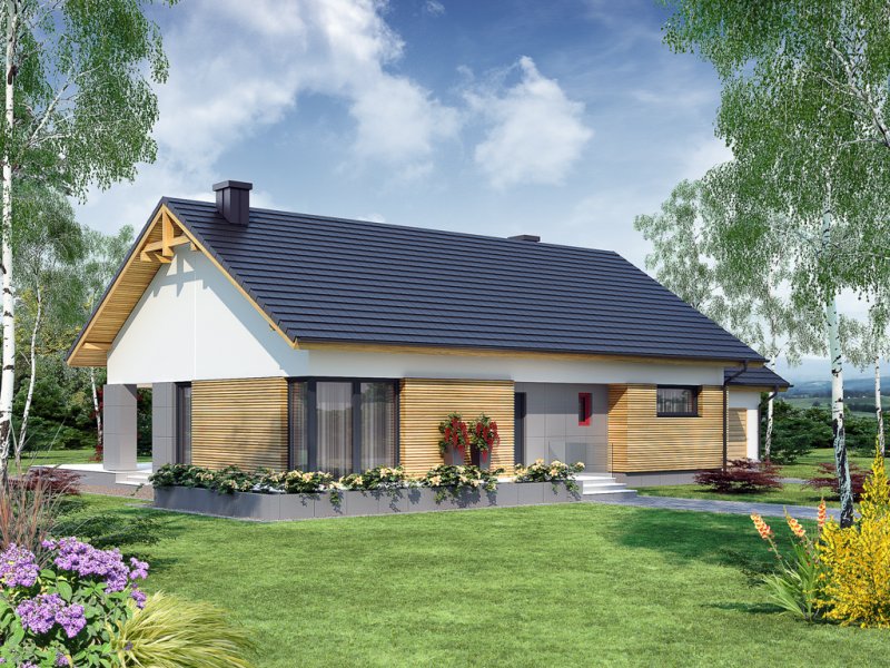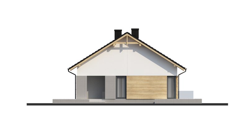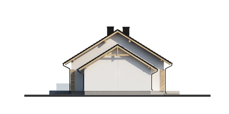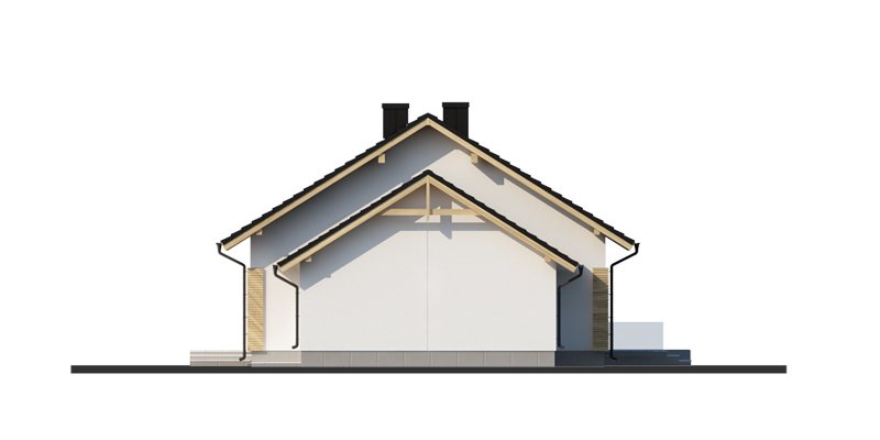 Duris jest domem świetnie wpisującym się w szeroką i krótką działkę. Jest stworzony dla rodziny 4-osobowej z upodobaniem do rozwiązań prostych i nowoczesnych. Dom generalnie dzieli się na 2 części – dzienną oraz nocną. Ta pierwsza to salon z jadalnią i otwarta na nie kuchnia ze spiżarnią. Zwolennicy kuchni zamkniętych mają możliwość rozdzielenia kuchni od dwóch pozostałych pomieszczeń. Salon posiada kominek komfortowo usytuowany w niedużej odległości zarówno od jadalni jak i strefy wypoczynkowej salonu. W tej części zaprojektowano doskonale doświetlające wnętrze duże przeszklenia, umożliwiające wyjście na taras zarówno od strony frontowej, jak i na ten zadaszony od strony ogrodu. Druga część budynku to strefa nocna. Składa się z trzech sypialni oraz łazienki. Rezygnując ze spiżarni i garderoby dostępnej z dwuosobowej sypialni, możemy ją znacznie powiększyć. W skrajnej części domu zlokalizowano pomieszczenie gospodarcze, przez które przejść można do jednostanowiskowego garażu, z którego z kolei zaprojektowano użyteczne wyjście na część ogrodową. Istnieje możliwość zaadaptowania poddasza na dodatkowe pomieszczenia użytkowe , dzięki umieszczeniu schodów w miejscu pomieszczenia WC.