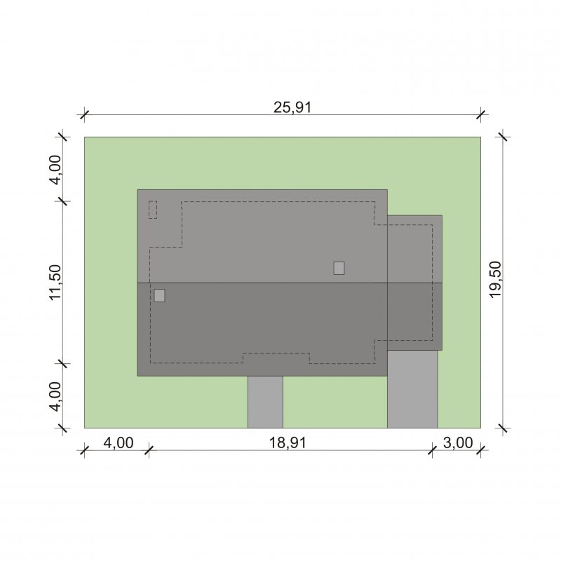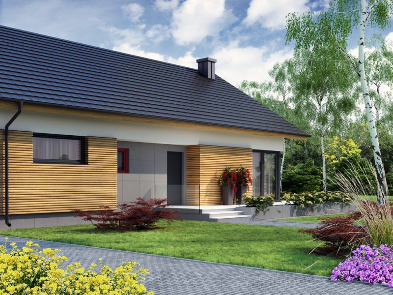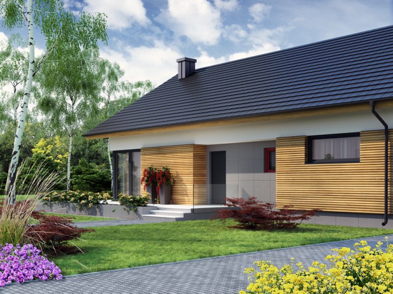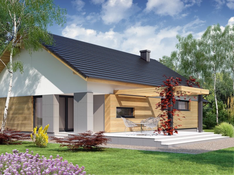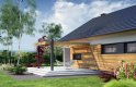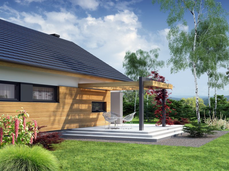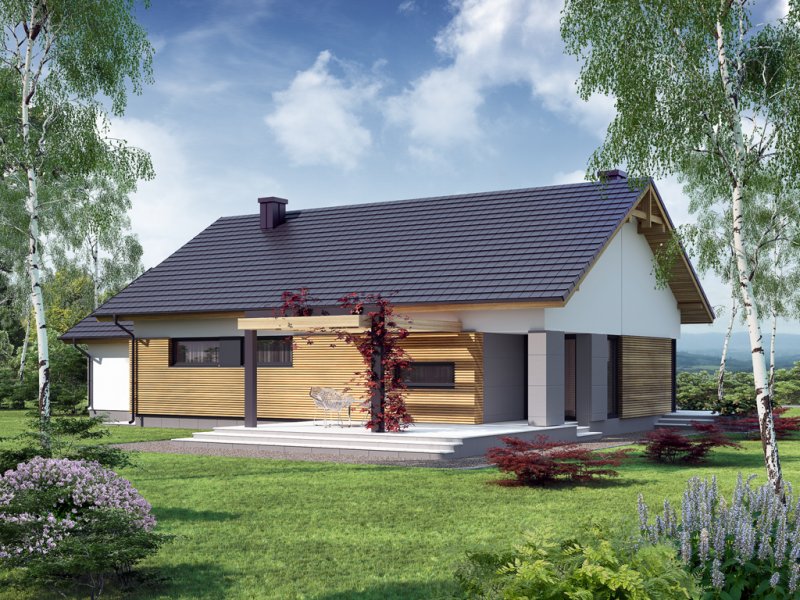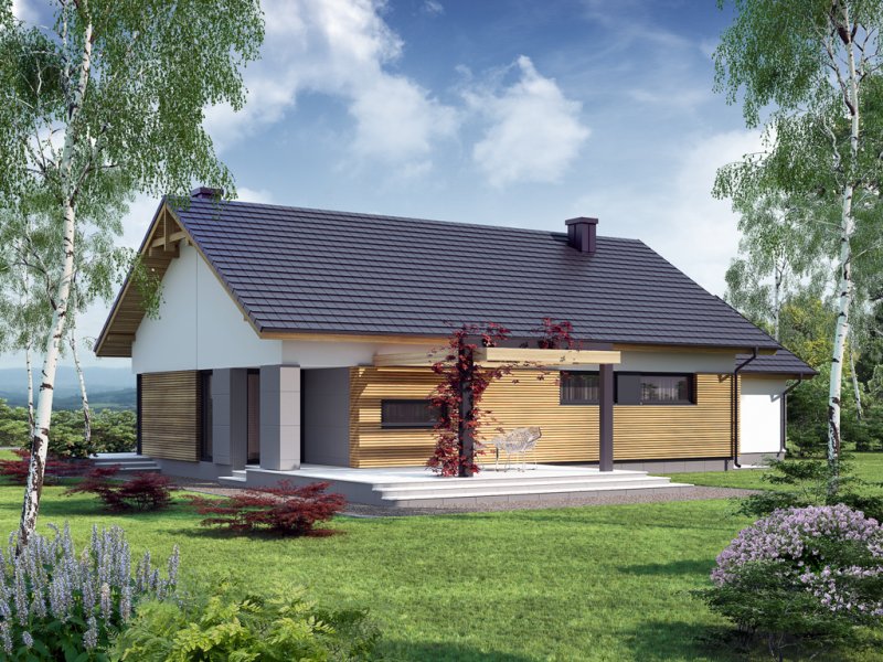 Wizualizacja jest propozycją tego jak dany projekt domu oraz jego otoczenie można zaaranżować. Sposób prowadzenia tarasu, kształt murków i elementy małej architektury typu pergole, donice itp. nie są objęte zakresem projektu. W związku z powyższym na projekcie budowlanym elementy te mogą nie być uwzględnione w projekcie ( patrz pergole ) lub zmieniony może być ich kształt i sposób prowadzenia ( wielkości tarasów, profil murków ).