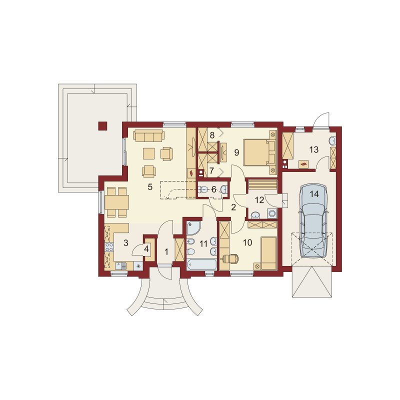 Budynek posiada wyraźny podział na strefy: dzienną, nocną i gospodarczą. Zaraz po przekroczeniu wiatrołapu ukazuje się pierwsza z nich – połączony z jadalnią salon z szerokim widokiem na zadaszony taras. Jadalnia płynnie przechodzi w kuchnię, którą po dostawieniu ścianki działowej możemy zamknąć. Znajduje się tutaj także dostępna od strony kuchni spiżarnia. Część nocną stanowią dwie sypialnie, duża łazienka oraz toaleta, natomiast część gospodarczą - pralnia przez którą można dojść do garażu oraz kotłownia.