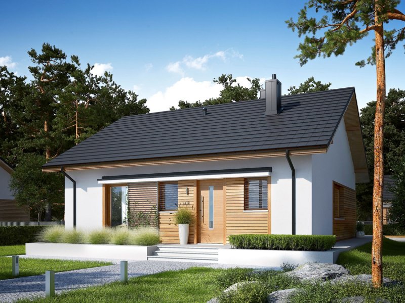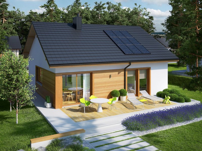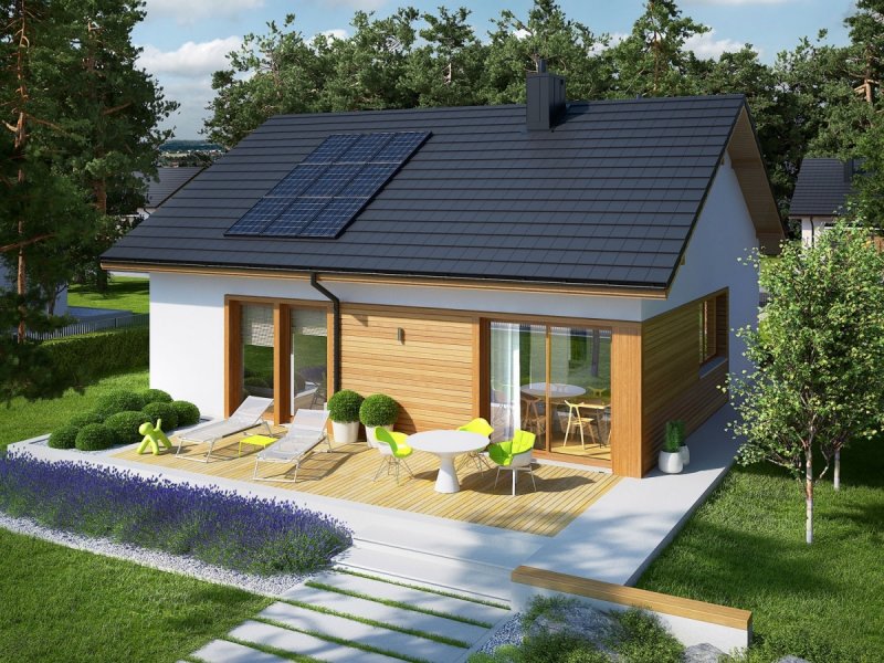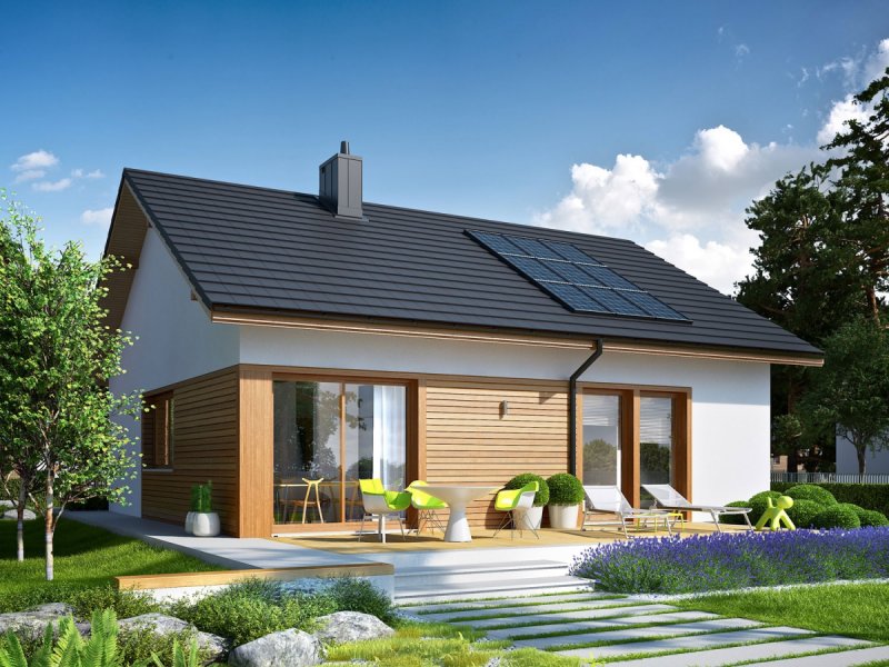 Elmo ECONOMIC to prosty i tani w budowie dom, który łączy funkcjonalność z nowoczesnością. Projekt maksymalnie wykorzystuje powierzchnię użytkową – nic tu nie jest przypadkowe i zbędne – wszystko zostało ergonomicznie rozplanowane i zorganizowane w trosce o najwyższy komfort użytkowy. Oprócz przytulnego wnętrza, do dyspozycji domowników jest przestronny taras dostępny z salonu i sypialni.