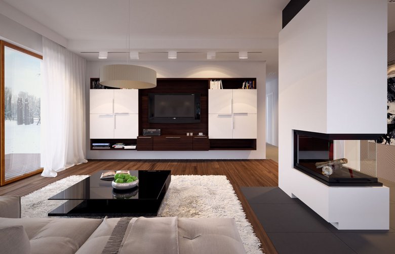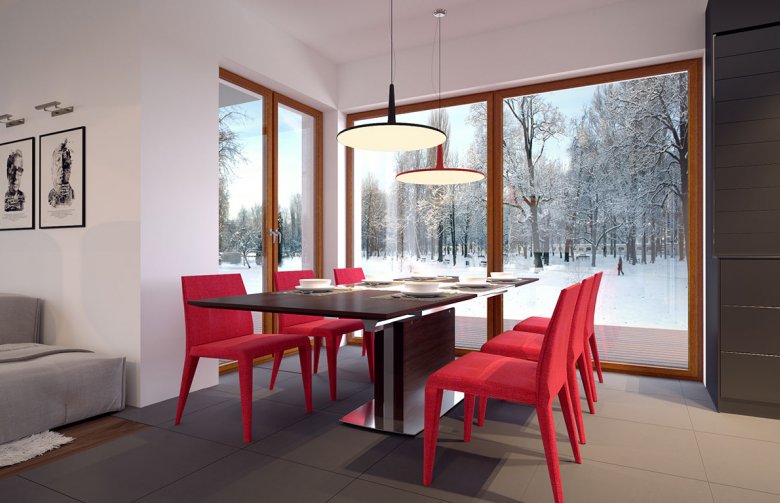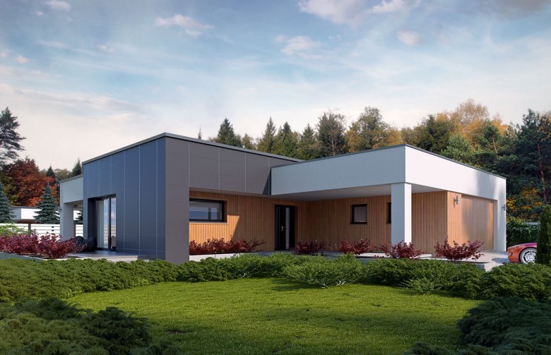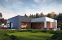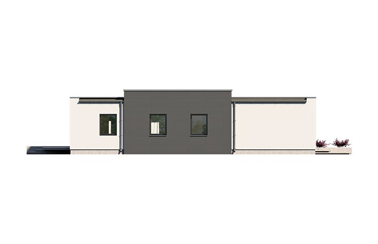 Parterowy dom jednorodzinny, z dwustanowiskowym garażem utrzymany w klimacie nowoczesnej willi. Łączy w sobie współczesny charakter elewacji z prostym, klasycznym układem pomieszczeń. Jest to bardzo wygodny, prosty i funkcjonalny dom, który swoim pełnym programem zapewnia optymalny komfort 4-osobowej rodzinie. W przestronnej części dziennej zaprojektowano duży salon, jadalnię otwierająca się na ogród poprzez ogromne przeszklenie, kuchnię ze spiżarnią oraz wc.