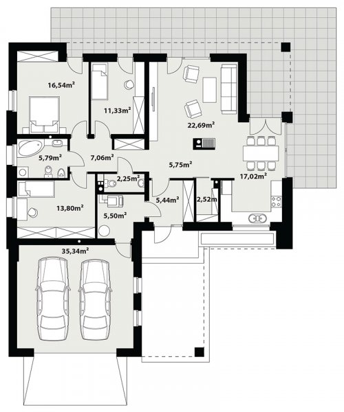 Atutem projektu jest duży, częściowo zadaszony taras. Tak zaproponowany, ciekawy i przestronny układ pomieszczeń umożliwia szereg aranżacji. Część nocna to 3 wygodne sypialnie, z czego dwie posiadają wyjście na taras oraz łazienka.