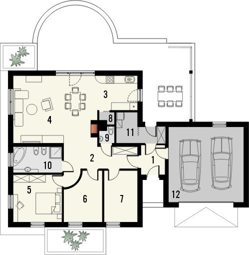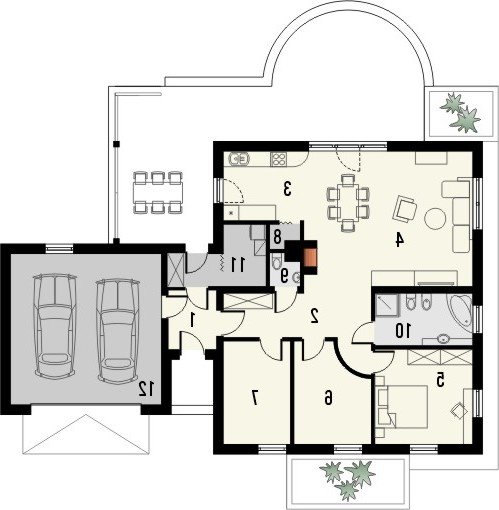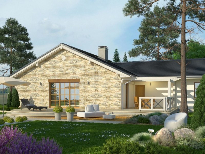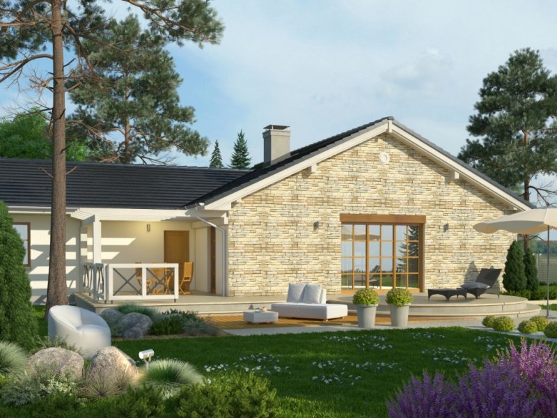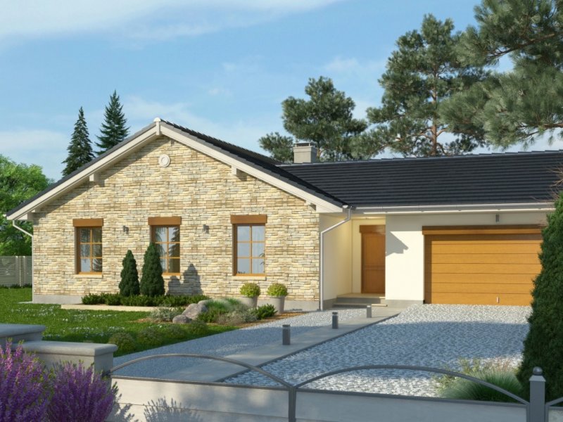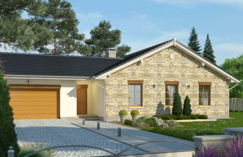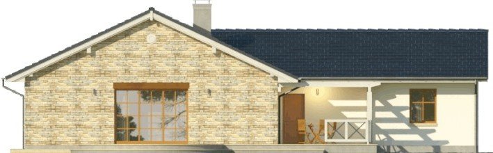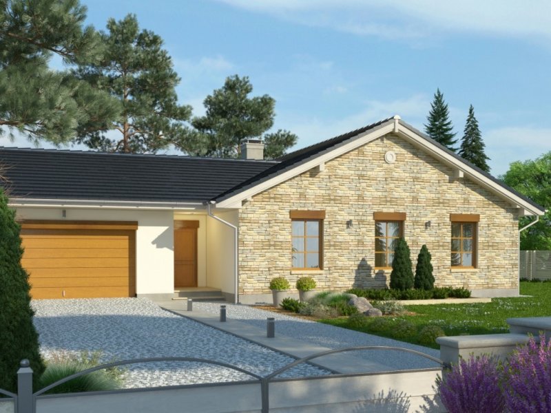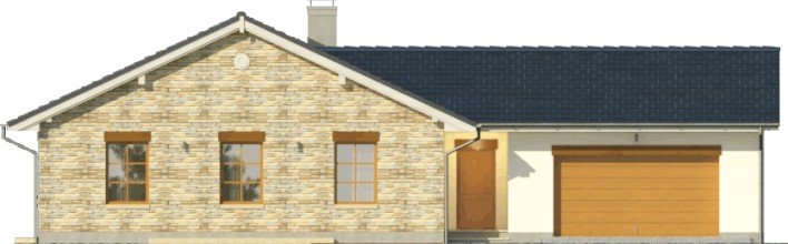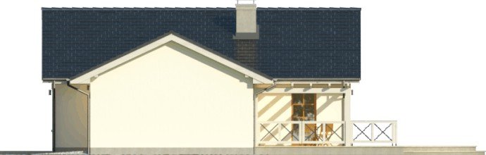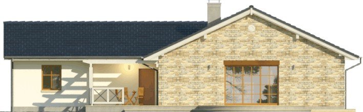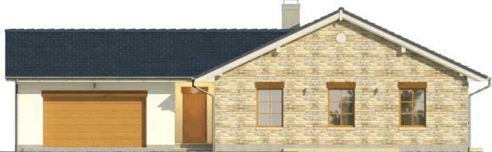 Dom parterowy, z garażem dwustanowiskowym. We wnętrzu zaprojektowano duży pokój dzienny z otwartą kuchnią, łazienkę z osobnym wc, 3 sypialnie oraz pomieszczenie gospodarcze. Projekt dostępny również w wersji lustrzanej.Ciekawa forma przykryta dwuspadowym dachem. Od strony ogrodu znajduje się salon z przylegającym do niego tarasem.