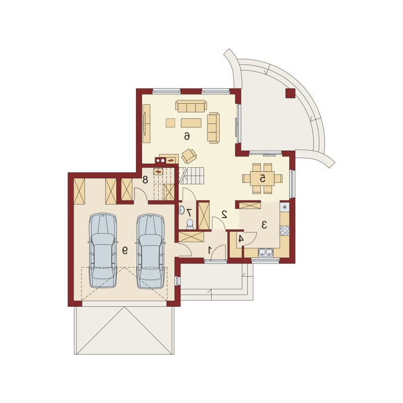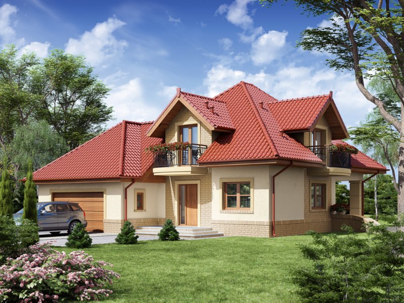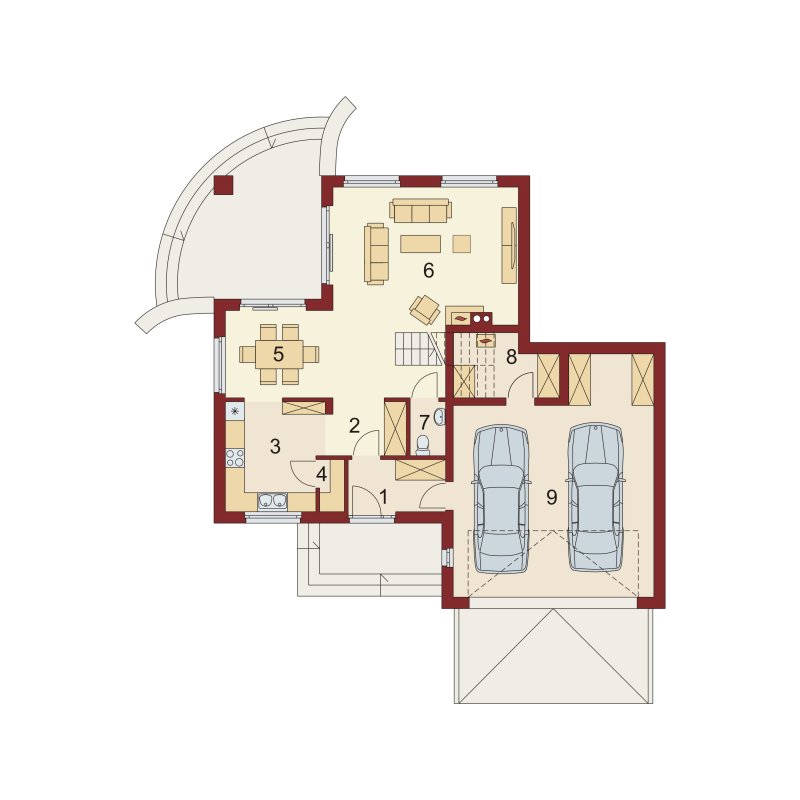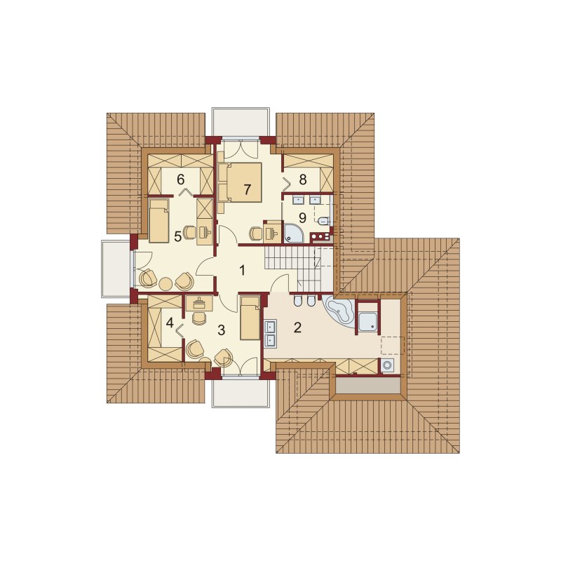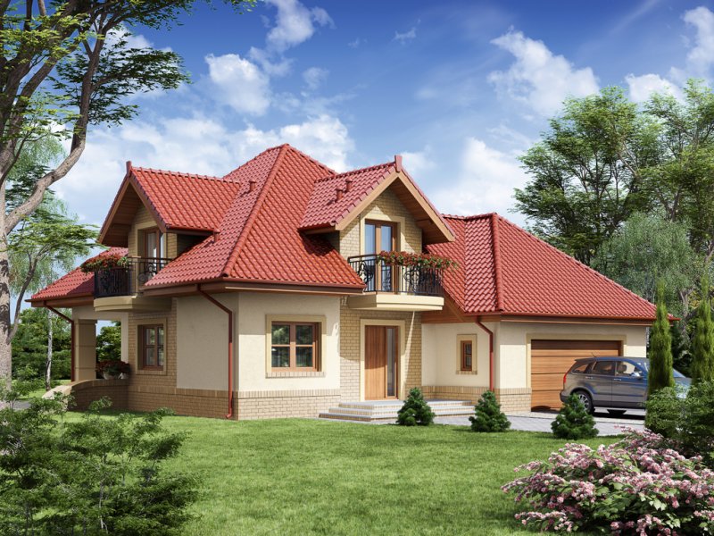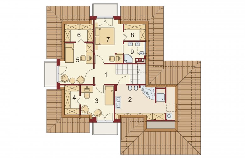 Dom z poddaszem użytkowym ucieszy przestronnością oraz funkcjonalnością pomieszczeń. Zaprojektowany z myślą o 4-osobowej rodzinie. Szczególnie zainteresuje właścicieli wąskich działek, którzy jednak chcą posiadać dwustanowiskowy garaż. Praktycznie rozplanowana powierzchnia wiatrołapu oraz hallu pozwoli na wkomponowanie dodatkowych szaf pod zabudowę. Kuchnia, jadalnia oraz salon to otwarta przestrzeń. Dzięki temu domek zyskuje dodatkową powierzchnię, a także ułatwia przemieszczanie się do poszczególnych pomieszczeń. Przestronność domu to również dodatkowy walor przy organizowaniu prywatnych spotkań towarzyskich z rodziną i przyjaciółmi. Poddasze stanowi strefę nocną domu. Znajdziemy tam obszerną łazienkę z miejscem na wannę, kabinę prysznicową i część na pralkę oraz trzy pokoje sypialnie. Wyjątkową cechą każdego z pokoi jest dostęp do prywatnej garderoby, a sypialnia małżeńska ma również swoją łazienkę. Takie rozwiązanie to nie lada zaleta dla rodzin z dorastającymi dziećmi.