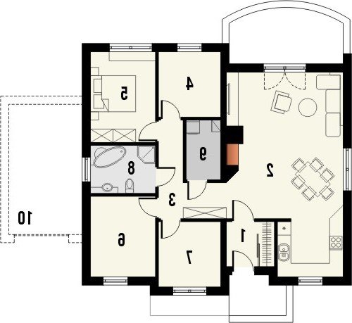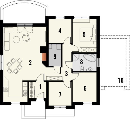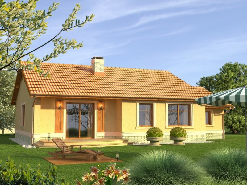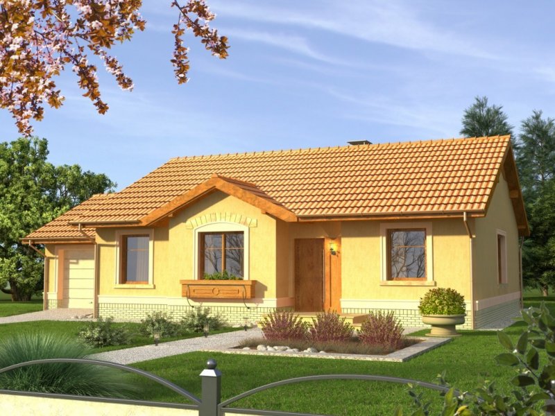Figaro to tani, tradycyjny dom parterowy sprzedawany w wariancie z garażem jednostanowiskowym i bez garażu. W elewacji wejściowej jest charakterystyczny szczyt z oknem od pokoju oraz osłonięte podcieniem wejście. Poprzez wycofanie tylnej ściany salonu utworzona jest druga wnęka i dzięki temu część tarasu jest zadaszona. Do następnych zalet należą: duży pokój dzienny z otwartą kuchnią i aż cztery sypialnie w części nocnej. W dużej łazience przy sypialniach zmieści się zarówno wanna jak i prysznic, a w hallu i wiatrołapie wbudowane szafy ubraniowe. W centralnie umieszczonym, jedynym w tym domu bloku kominowym znajdują się przewody od kominka i pieca c.o. Dzięki takiej lokalizacji kominek w salonie może być drugim, alternatywnym źródłem ciepła w domu. Dokumentacja dostępna też w wersji lustrzanej. Dom zaprojektowano ze ścianami warstwowymi z betonu komórkowego z dociepleniem. Elewacje są tynkowane, z cokołami obłożoneymi płytkami klinkierowymi. Sufit z płyt gipsowo-kartonowych jest podwieszany bezpośrednio do drewnianej więźby. Jako pokrycie dachu można zastosować dachówkę cementową albo ceramiczną lub też inny materiał podany w adaptacji. Dopuszcza się wprowadzenie zmian wszystkich materiałów na dowolnie wybrane przez inwestora.