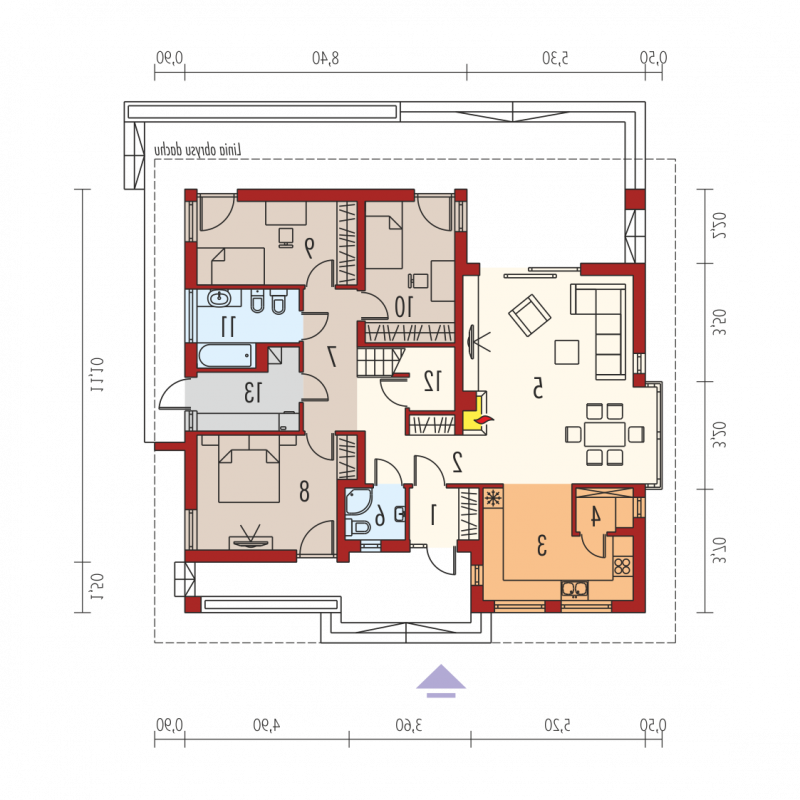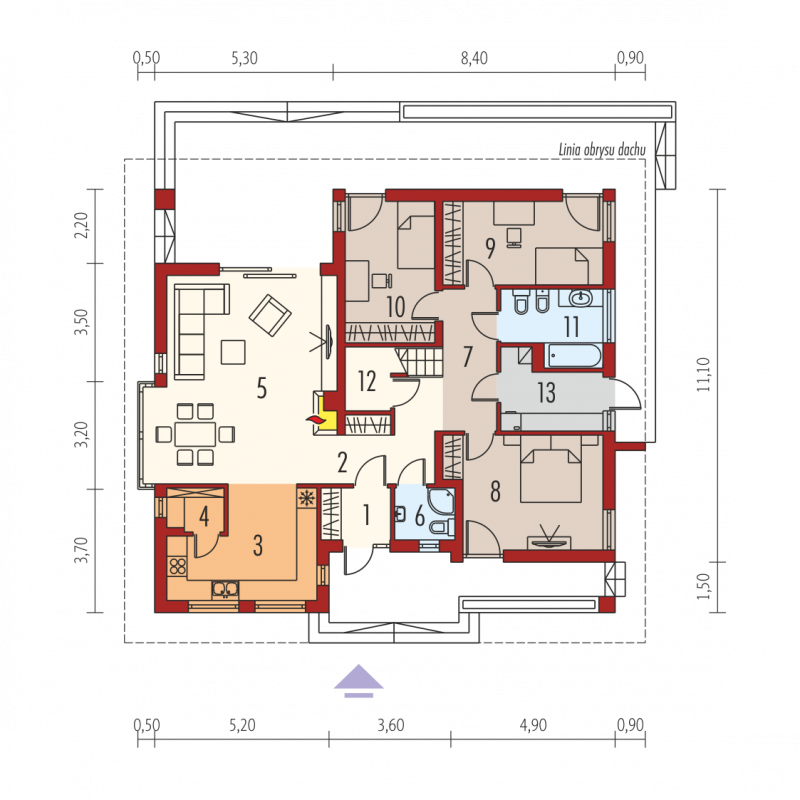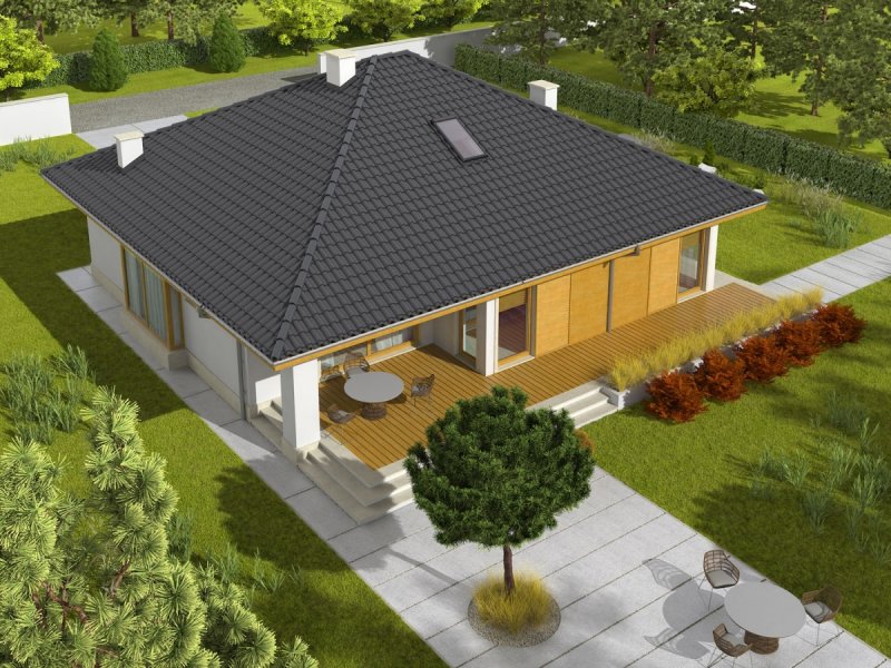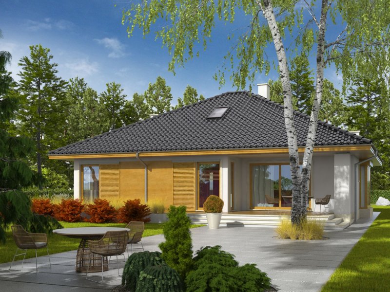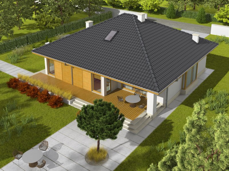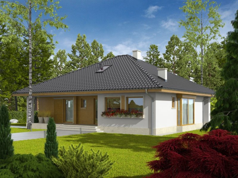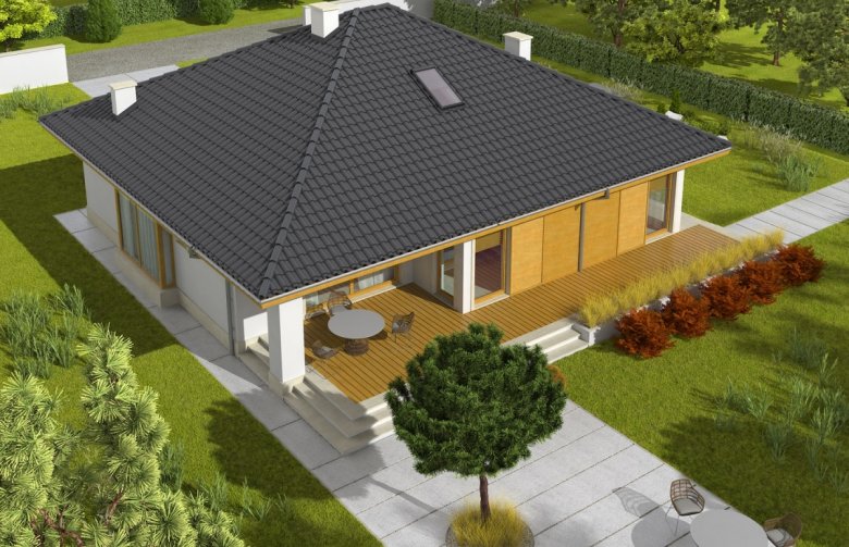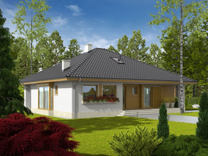 Dom parterowy, niepodpiwniczony. Przeznaczony dla 3-4-osobowej rodziny. W strefie dziennej znajdują się salon z kominkiem, jadalna oraz kuchnia ze spiżarnią. Znalazła się tu również łazienka oraz wygodne pomieszczenie gospodarcze. Strefę nocną tworzą trzy sypialnie oraz duża łazienka. W holu zaprojektowano schody prowadzące na praktyczny strych. Flori III to klasyczny dom parterowy z wygodnie rozplanowanym układem pomieszczeń. Prostą bryłę domu zdobi ciekawa kompozycja materiałów, zastosowanych na elewacji. Atutem domu jest przytulny taras, który stanowi rodzinny azyl dla złaknionych relaksu w towarzystwie przydomowej zieleni. Flori III to propozycja dla koneserów komfortowych przestrzeni i eleganckich połączeń. Istnieje możliwość: - podpiwniczenia - zbliźniaczenia - wykonania domu dwulokalowego - zmiany kąta nachylenia dachu do 30°