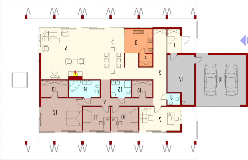 Dom parterowy, niepodpiwniczony z garażem dwustanowiskowym, przeznaczony dla 4- osobowej rodziny. „Frame” to imponujący dom z wyraźnie wydzieloną strefą nocną i jednoprzestrzenną wspólną częścią dzienną. Oprócz pomieszczeń o przeznaczeniu podstawowym dla domu jednorodzinnego plan funkcji zakłada również pokój do pracy, spiżarnię, garderoby oraz pomieszczenie techniczne. Tym, co wyróżnia ten dom na tle innych, jest jego konstrukcja, którą projektant wyeksponował planując ją na zewnątrz budynku. Dzięki takiemu rozwiązaniu stworzona została możliwość dowolnego kształtowania wnętrza domu. Liczne przeszklenia na bocznych elewacjach przesłonięto systemem zewnętrznych żaluzji i rolet. Automatyczne sterowanie osłonami daje możliwość kontroli nad docierającym do wewnątrz światłem słonecznym, a co za tym idzie – również temperaturą w pomieszczeniach. Dom został zaprojektowany jako wysoko energooszczędny, z rekuperacją, kolektorami słonecznymi oraz ogniwami fotowoltaicznymi. Więcej informacji na temat projektu na stronie serwisu: www.domy21.pl.