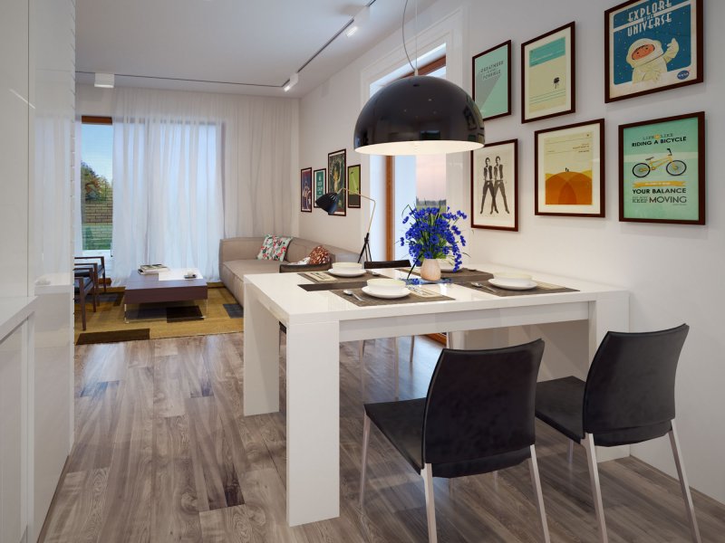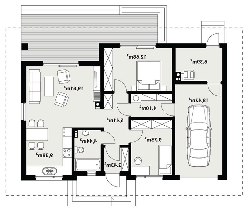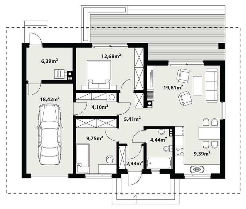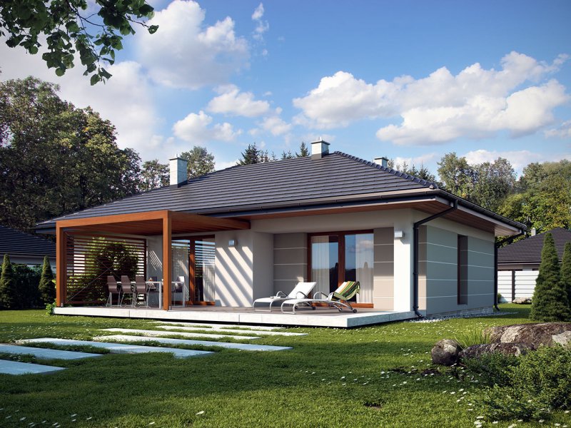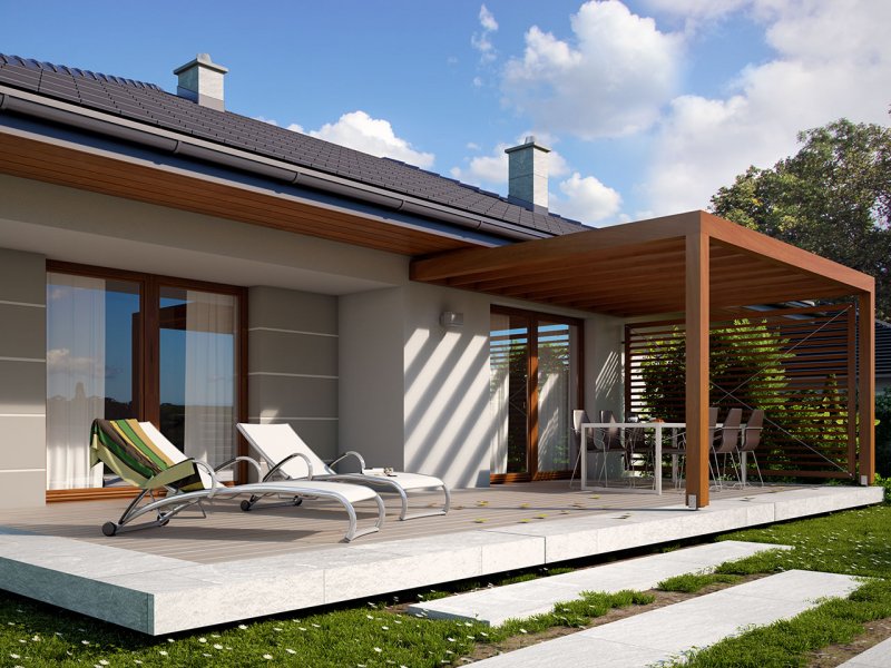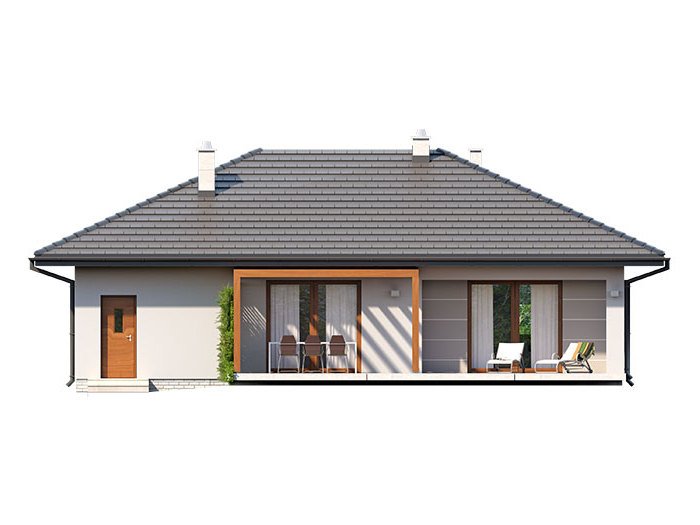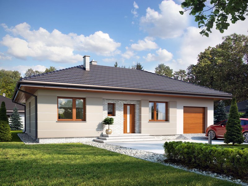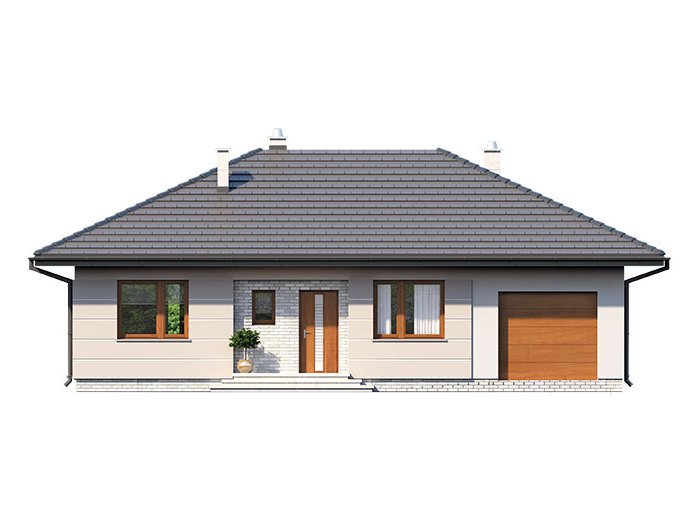 Galia drewniana to prosty i ekonomiczny w budowie ale zarazem funkcjonalny dom, który powstał z myślą o inwestorach poszukujących alternatywy do mieszkania w bloku. Jest to nowoczesny, urokliwy dom mieszkalny w technologii szkieletu drewnianego przeznaczony dla 4 osobowej rodziny. Ogromnym jego plusem jest program funkcjonalny z widocznym podziałem na część dzienną, nocną i gospodarczą, gdzie wnętrze zostało rozplanowane w sposób przemyślany, z dbałością o maksymalne wykorzystanie przestrzeni domu. Część reprezentacyjna, to przestronny salon otwarty na zadaszony taras oraz kuchnia z jadalnią. Oprócz części dziennej, przewidziano strefę intymną domu, która składa się z dwóch sypialni i łazienki. Dużą kotłownię oraz garaż zaprojektowano w części gospodarczej domu. Wymiary kotłowni umożliwiają montaż kotła na każdy rodzaj paliwa. Rzut budynku oraz prostota bryły czynią ten dom prostym w budowie i tanim w eksploatacji. Atutem tego projektu jest nie tylko prostota i przejrzystość układu funkcjonalnego ale także eleganckie, nowoczesne elewacje podkreślone szlachetnymi materiałami oraz delikatnym detalem. Dostępny również w technologii murowanej.