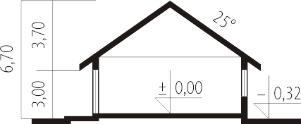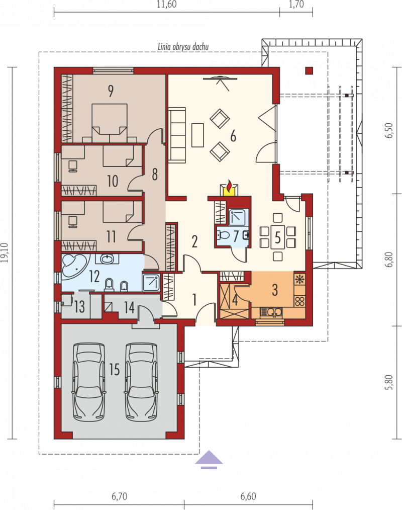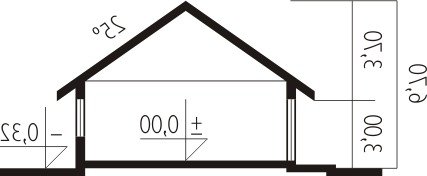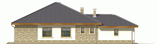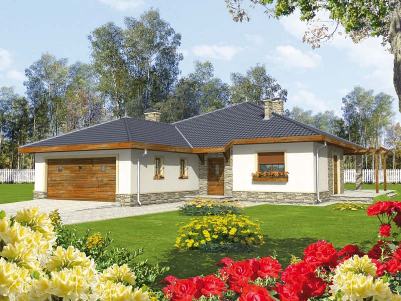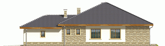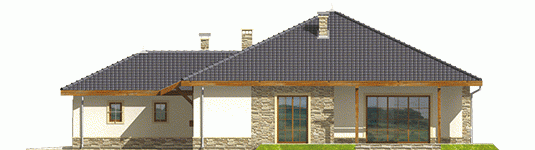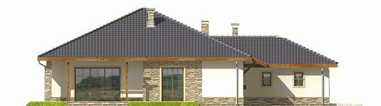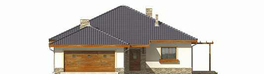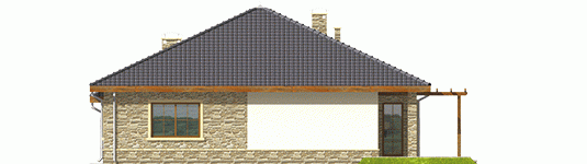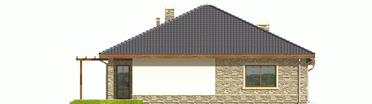 Dom parterowy z możliwością adaptacji poddasza z dwustanowiskowym garażem przeznaczony dla 4-5-osobowej rodziny. Strefę dzienną budynku stanowi duży salon (z wyjściem na zadaszony taras) połączony przez jadalnię z kuchnią, wc z prysznicem oraz spiżarnia. Strefa nocna to trzy sypialnie łazienka oraz dostępna bezpośrednio z łazienki pralnia. W obrębie korytarza zaprojektowano szafy wnękowe pełniące rolę garderoby. Funkcjonalne rozwiązanie wnętrza pozwala usytuować budynek na działce dowolnie zorientowanej względem stron świata.