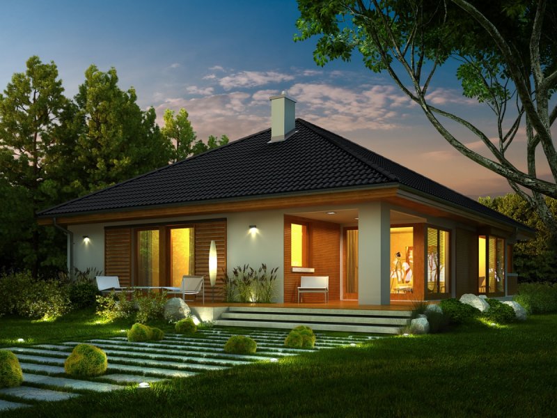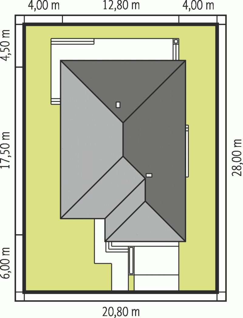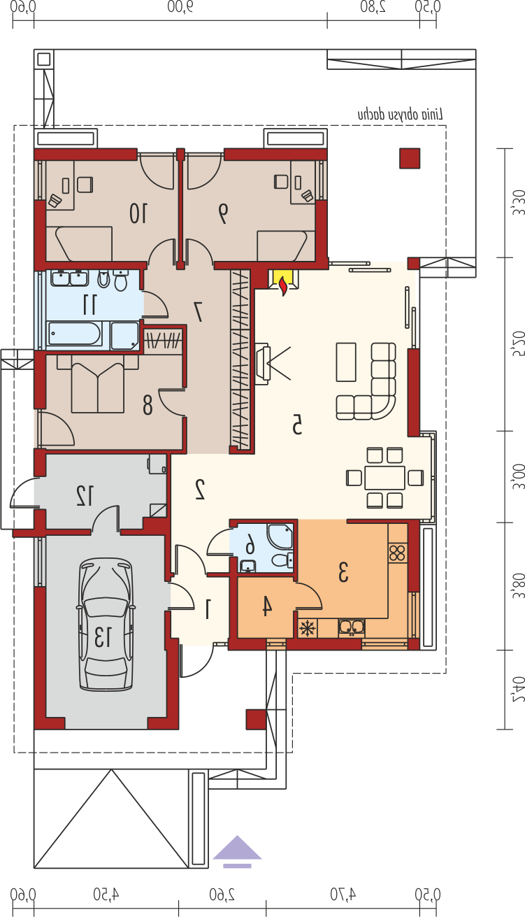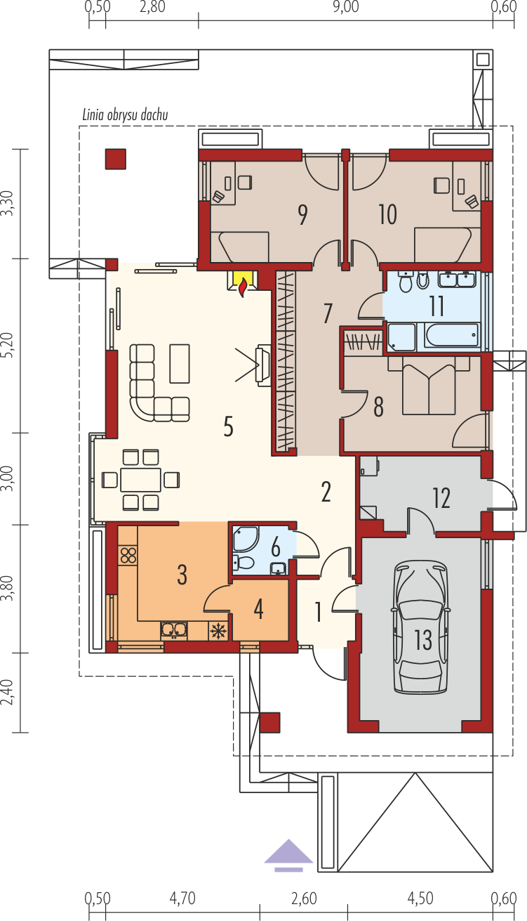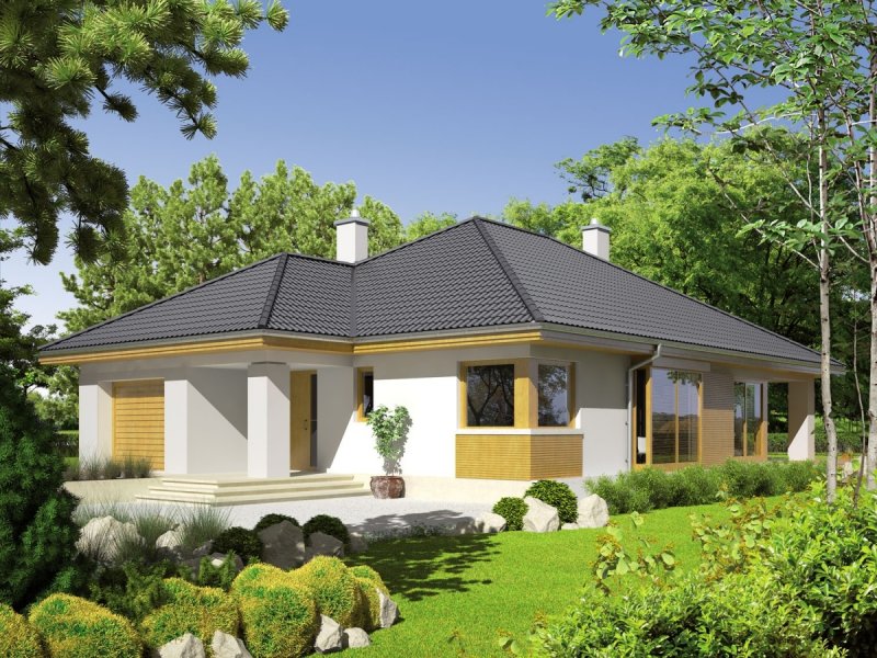 Dach: konstrukcja drewniana, ocieplenie wełna mineralna 30 cm, dachówka ceramiczna lub cementowa, więźba dachowa dostępna również w systemie prefabrykacji drewnianej