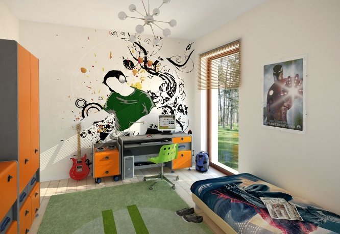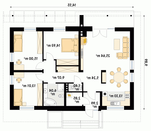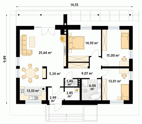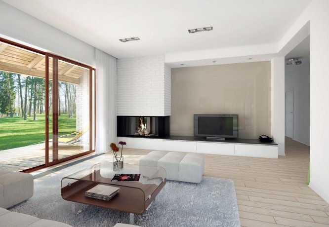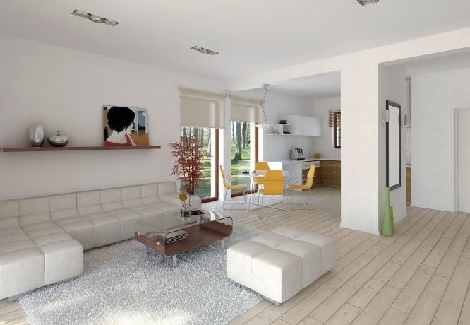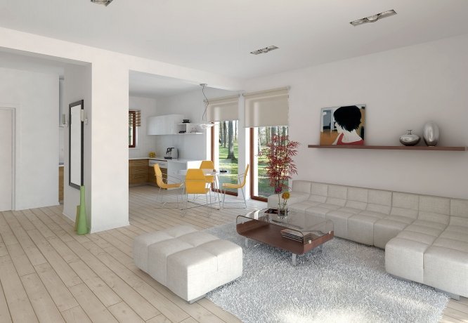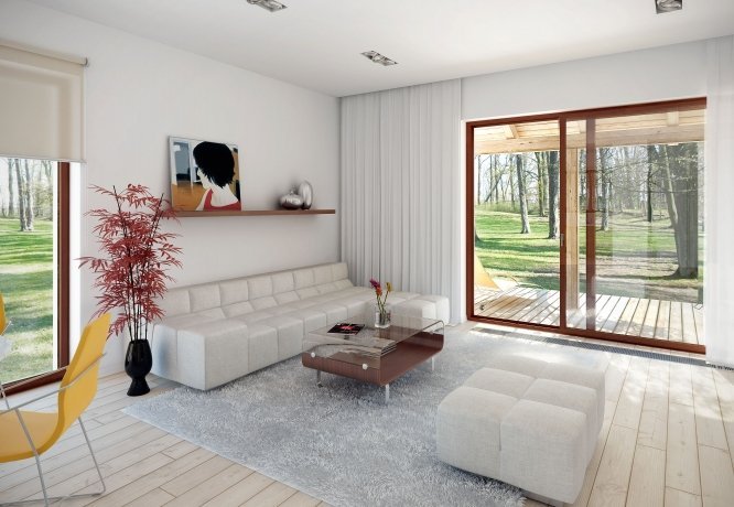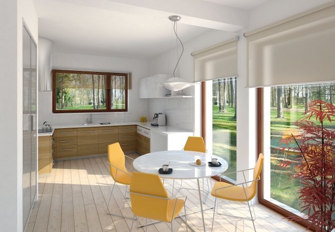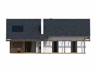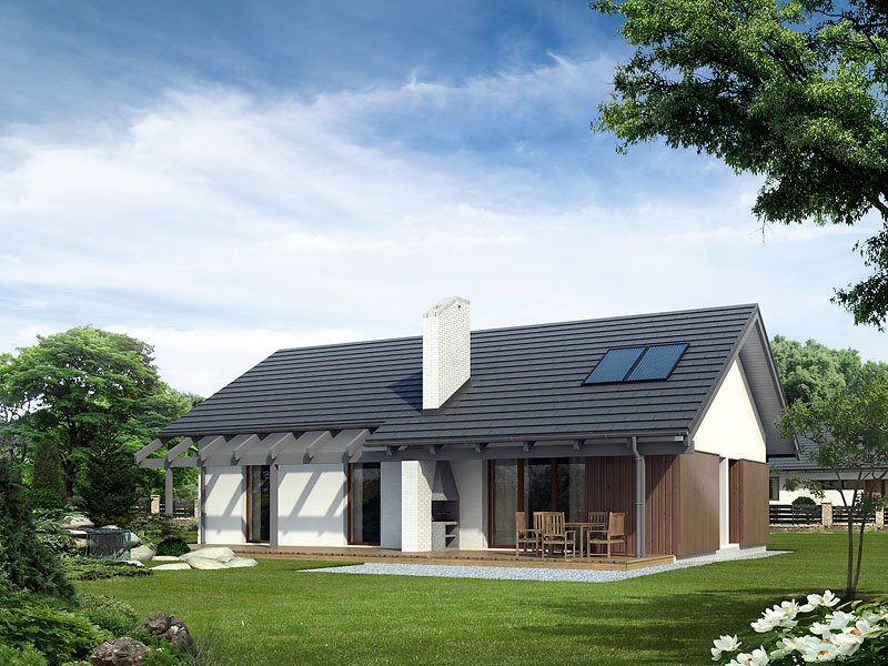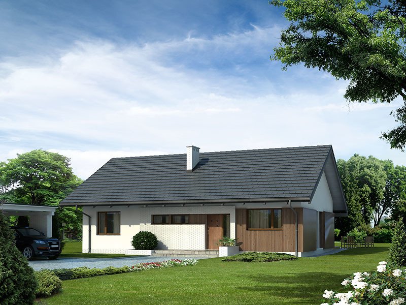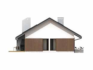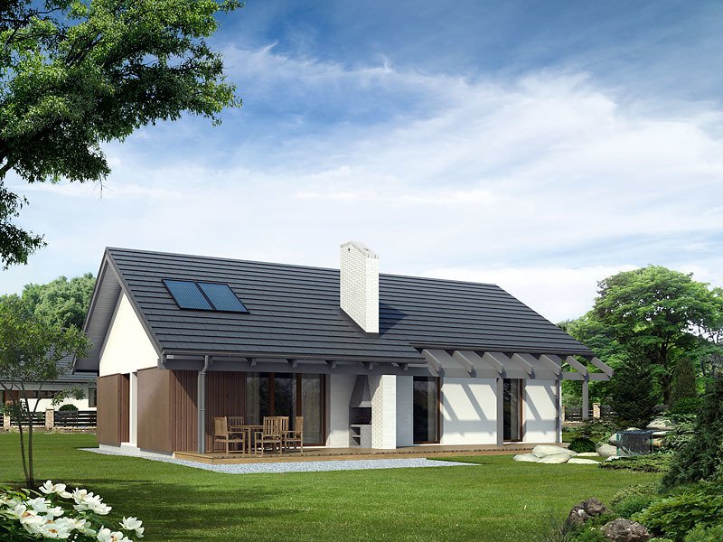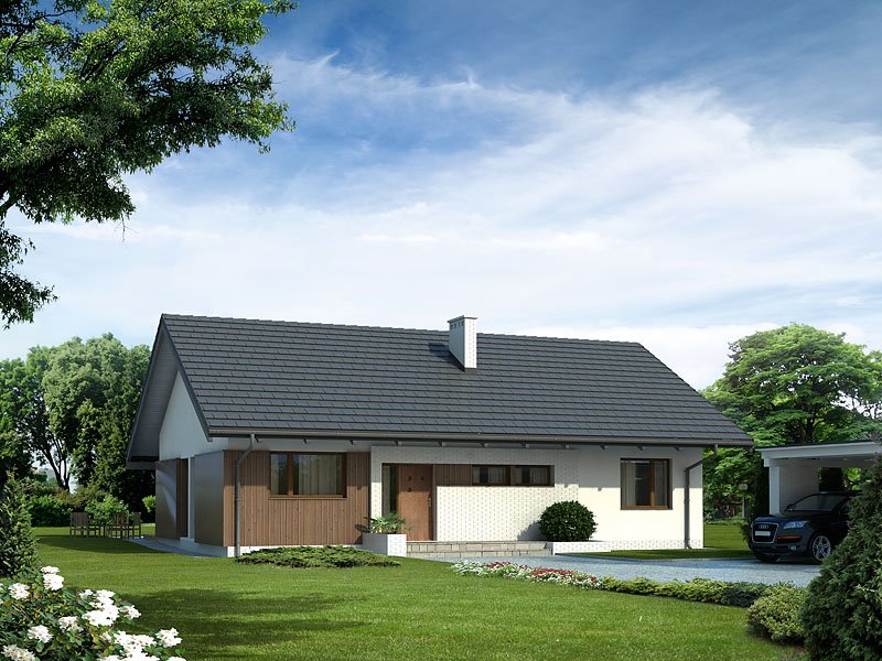 Parterowy dom jednorodzinny o czystym układzie funkcjonalnym, z wyraźnym podziałem na część dzienną i nocną. Przeznaczony dla 4-osobowej rodziny (trzy sypialnie). Zadaszony taras z miejscem na grill.