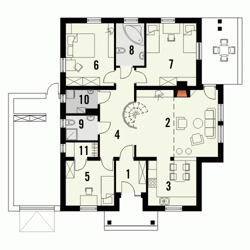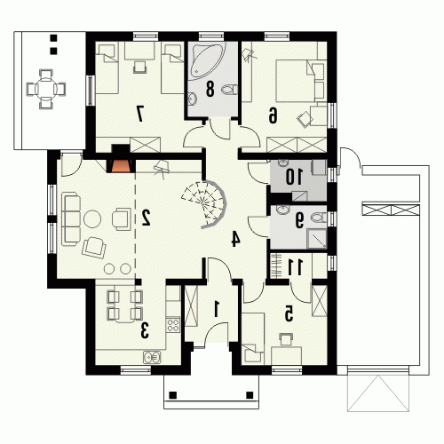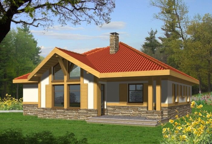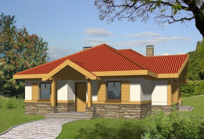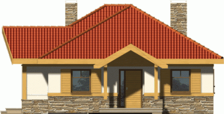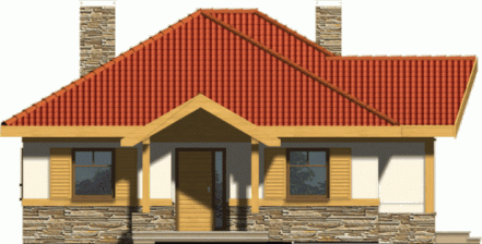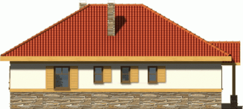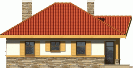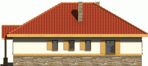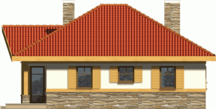 Budynek niepodpiwniczony parterowy. Można również zamówić wersję projektu domu z garażem. Wnętrze podzielone jest klarownie na część dzienną i nocną. W strefie dziennej zlokalizowana jest kuchnia z salonem, z którego poprzez drzwi balkonowe wychodzi się na zadaszony taras. Obowiązkowym elementem pokoju dziennego jest kominek. W części nocnej do dyspozycji są 3 sypialnie z 2 łazienkami oraz pomieszczenie gospodarcze mogące także służyć jako pralnia. Jeden z pokoi wyposażony jest ponadto w garderobę. Możliwe jest zaadaptowanie poddasza o powierzchni 23,8m2. Dokumentacja dostępna jest również w odbiciu lustrzanym.