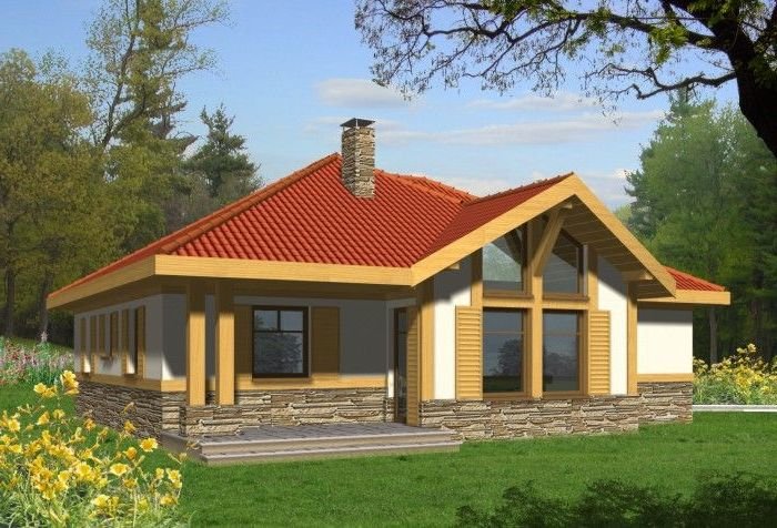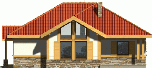 W wyglądzie zewnętrznym tego domu dominują naturalne materiały, których umiejętne użycie nadaje nowoczesny wygląd. Reprezentacyjne, duże okna w salonie jeszcze podkreślają atrakcyjność jego sylwetki.