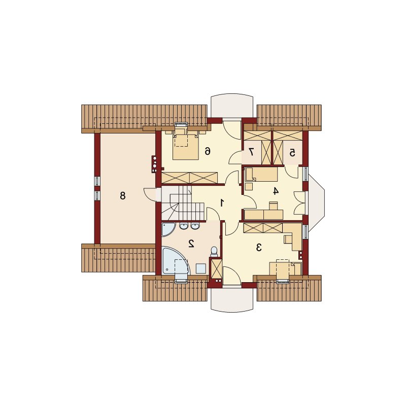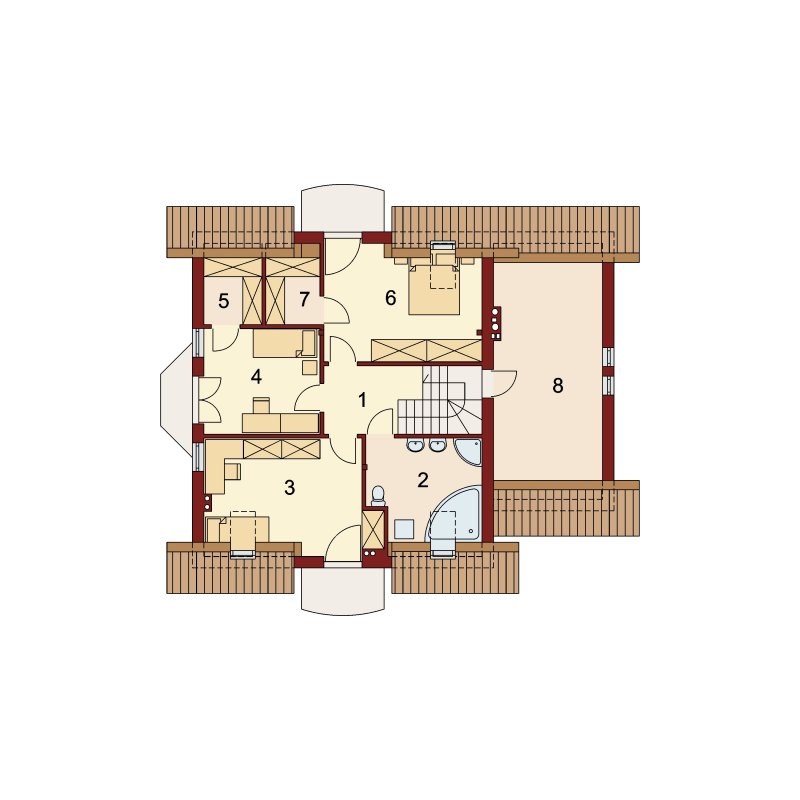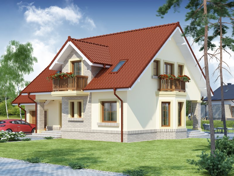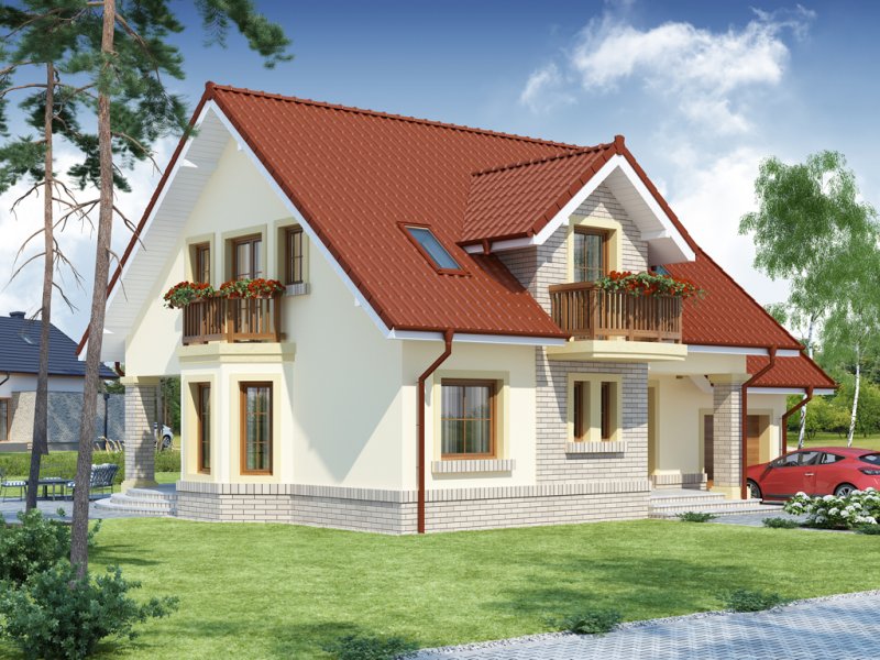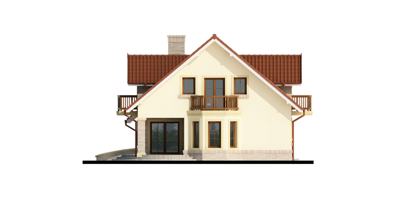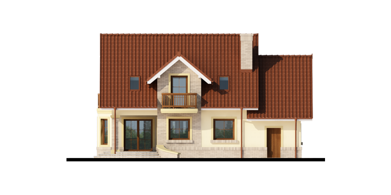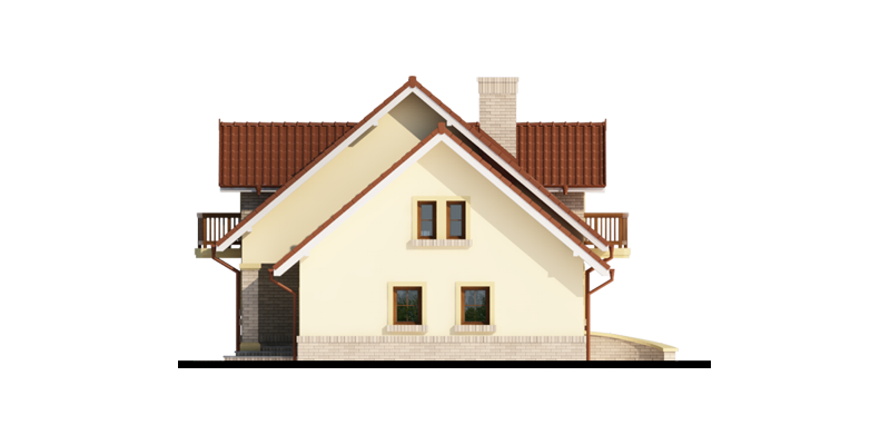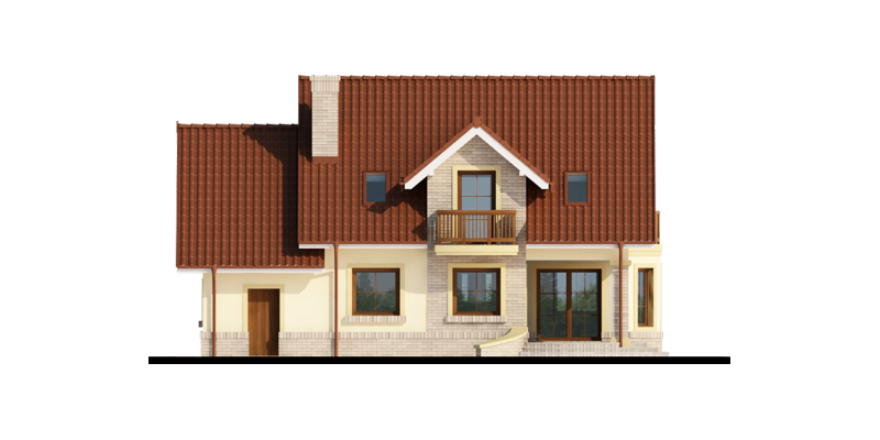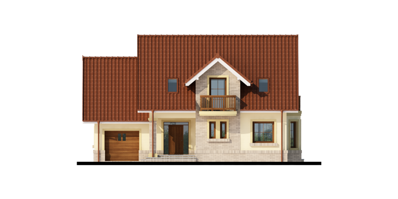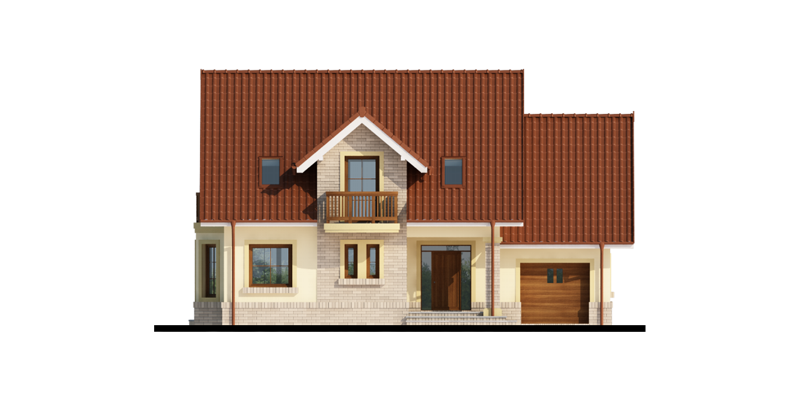 Hektor, to ekonomiczny dom dla 4 osobowej rodziny zaprojektowany na planie prostokąta wzbogaconego o przeszklony wykusz, wcięcie tarasu oraz praktyczny podcień. Stanowiąca jednorodną przestrzeń część dzienna na parterze mieści salon z kominkiem, umiejscowioną w wykuszu jadalnię i kuchnię z barkiem. Wykorzystując słup kuchnię można zamknąć ścianką działową tworząc odrębne pomieszczenie. Obok kuchni znajduje się spiżarnia, a za nią pomieszczenie wc. Można zrezygnować ze spiżarki powiększając wc i projektując tam łazienkę. W części gospodarczej parteru mamy jednostanowiskowy garaż z miejscem na ciąg praktycznych regałów, czy szaf oraz pomieszczenie gospodarcze/kotłownię z wyjściem od strony ogrodu. Poddasze, to strefa nocna, w której zaplanowano dwie sypialnie z garderobami i jedna z obszerną szafą wnękową oraz optymalnej wielkości łazienkę. Nieużytkową w projekcie przestrzeń strychu można zaadaptować na pokój hobby, czy zabaw dla dzieci.