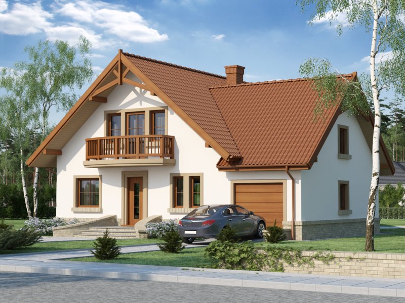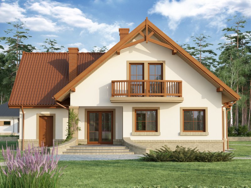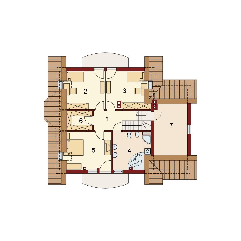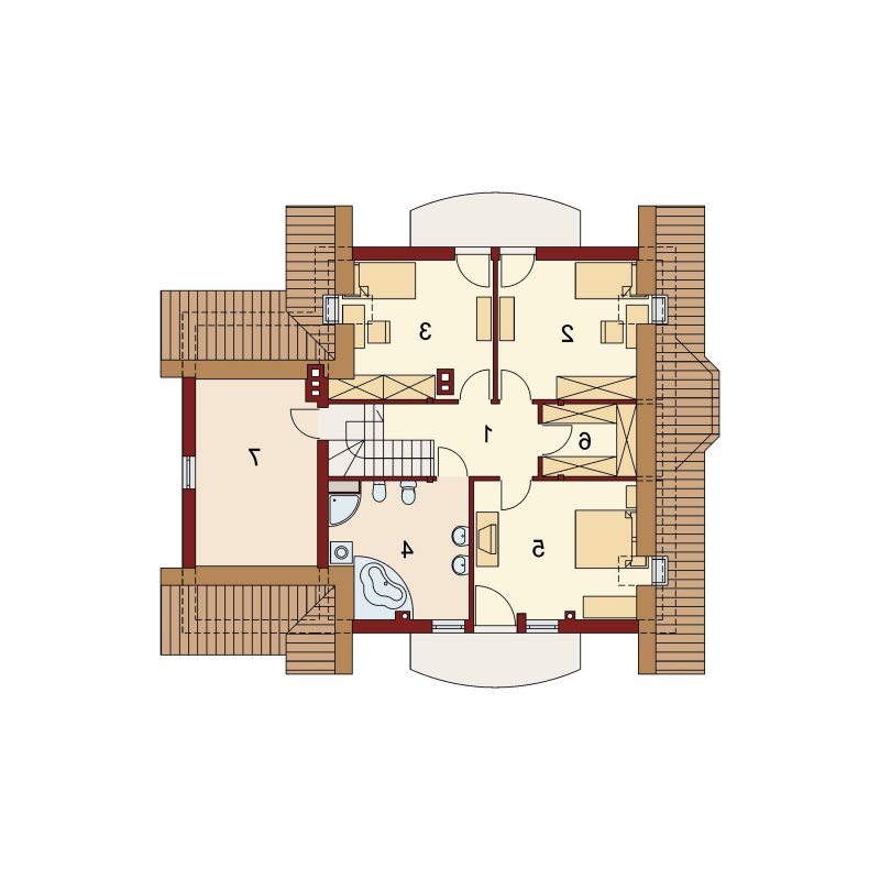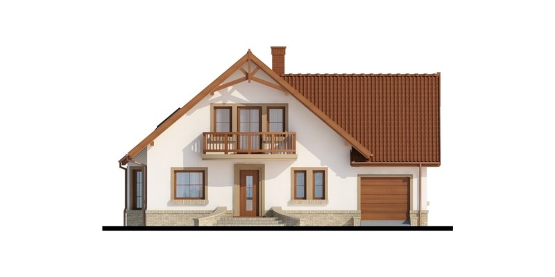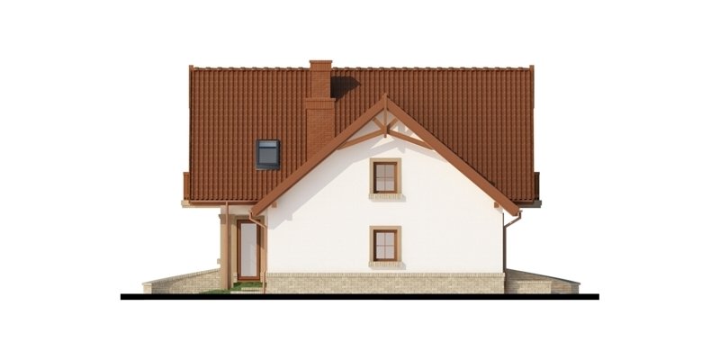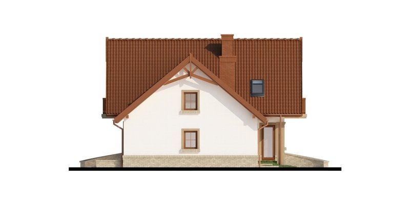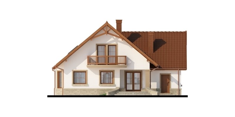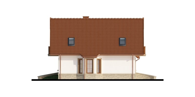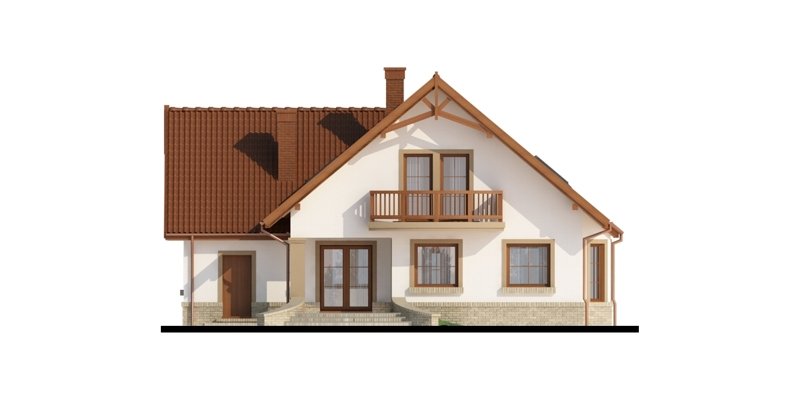 Dom z poddaszem użytkowym, przeznaczony dla 4-5-osobowej rodziny. Na parterze znajduje się przestronny pokój dzienny otwarty na jadalnię połączoną z kuchnią. Rozwiązanie funkcjonalne pozwala na wydzielenie ww. pomieszczeń. Wyjście na taras z podcieniem jest możliwe zarówno z jadalni jak i z pokoju dziennego. Na parterze znajduje się spiżarnia, łazienka oraz dodatkowy pokój, a także pomieszczenie gospodarcze, przez które można się dostać do przestronnego garażu, dającego możliwość zabudowania dwóch ścian szafami. Na poddaszu znajdują się trzy sypialnie, łazienka oraz garderoba. Hol na poddaszu posiada wnękę przeznaczoną na szafę. Nad garażem można zaadaptować strych nieużytkowy dostępny bezpośrednio z klatki schodowej na dodatkowe pomieszczenie gospodarcze lub pokój o powierzchni ponad 13 m2. W ramach adaptacji istnieje mozliwość powiększenia kuchni z jadalnią i tarasu w podcieniu oraz powiększenie i lokalizacja spiżarni bezpośrednio przy kuchni, kosztem dodatkowego pokoju na parterze.