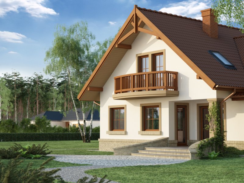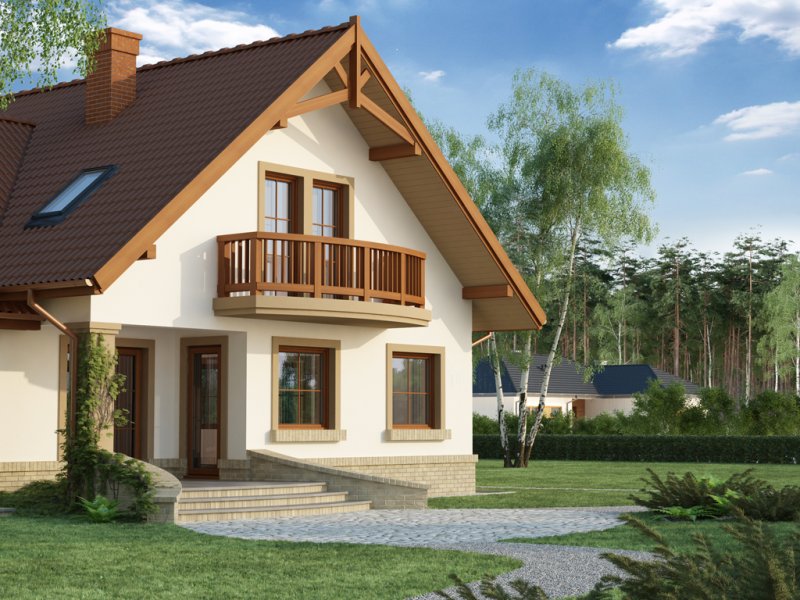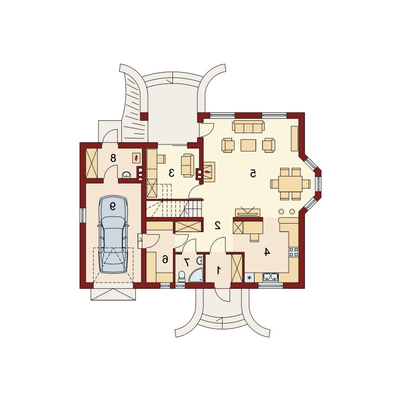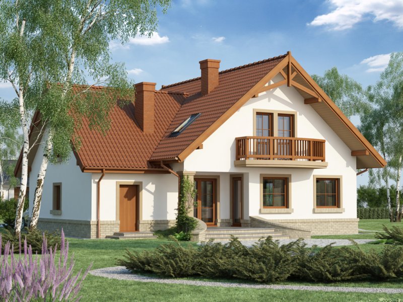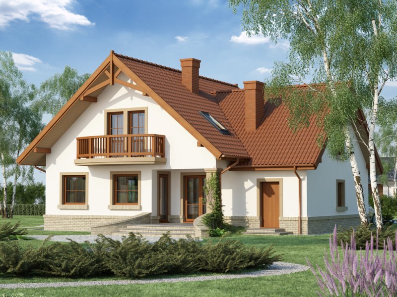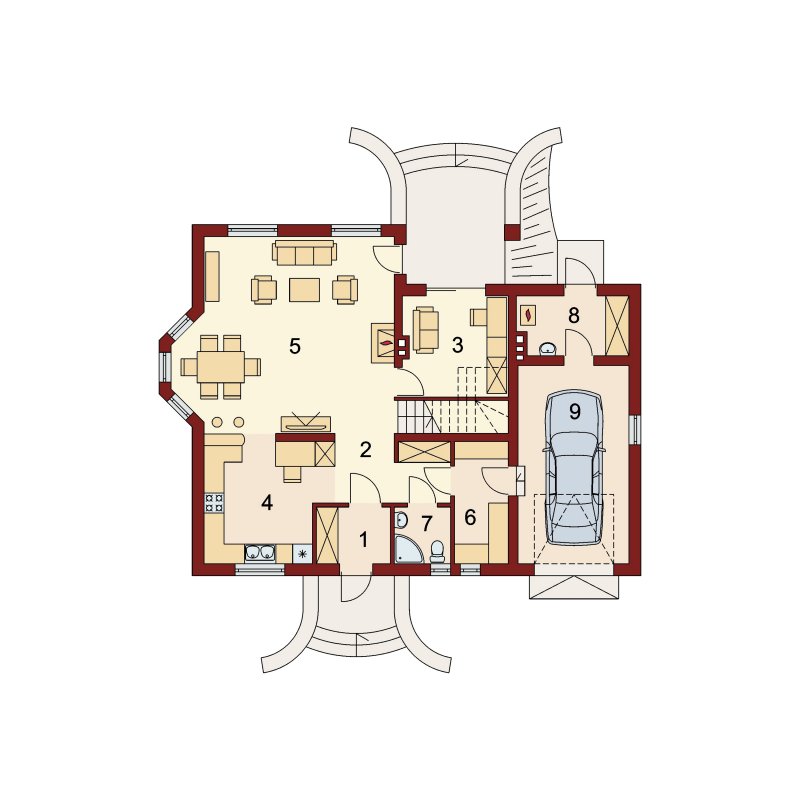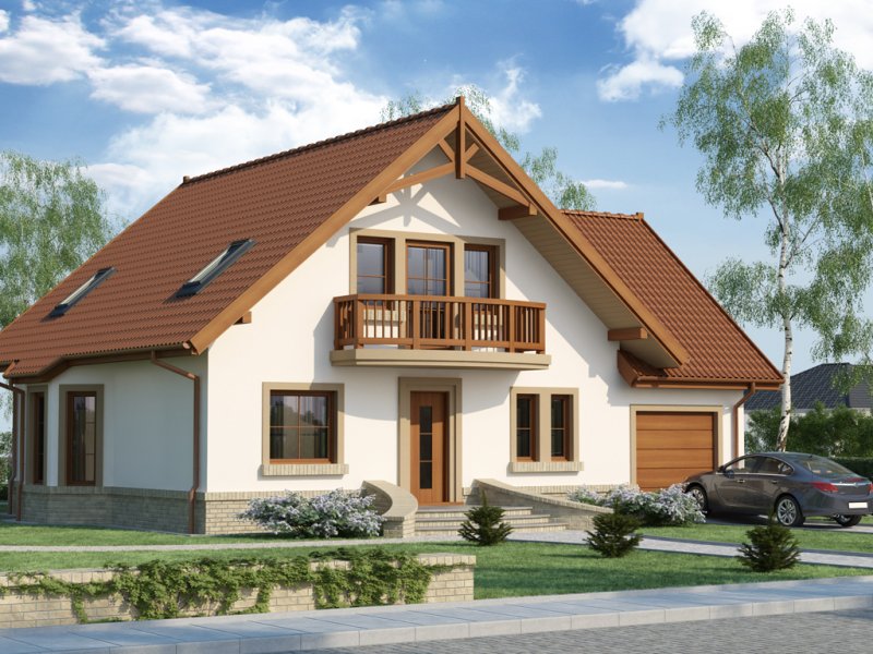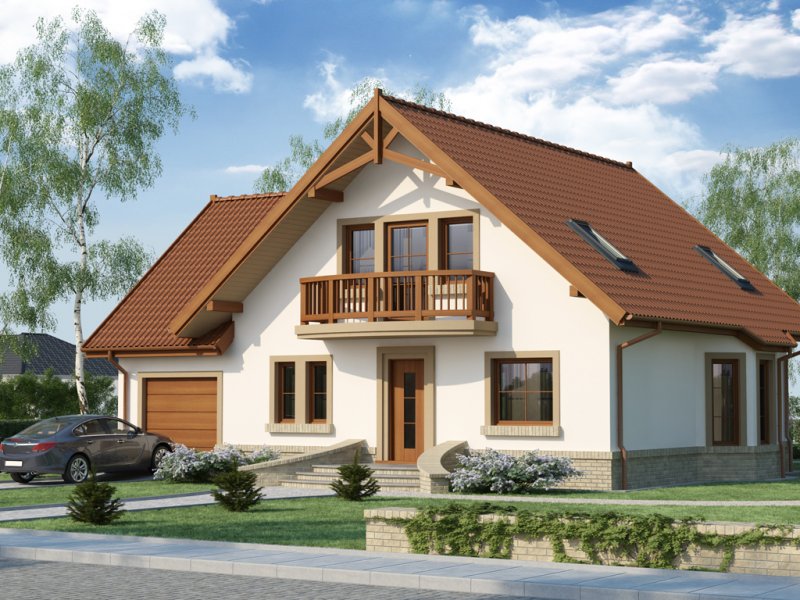 Dom z poddaszem użytkowym, przeznaczony dla 4-5-osobowej rodziny. Na parterze znajduje się przestronny pokój dzienny otwarty na jadalnię połączoną z kuchnią. Rozwiązanie funkcjonalne pozwala na wydzielenie ww. pomieszczeń. Wyjście na taras z podcieniem jest możliwe zarówno z jadalni jak i z pokoju dziennego. Na parterze znajduje się spiżarnia, łazienka oraz dodatkowy pokój, a także pomieszczenie gospodarcze, przez które można się dostać do przestronnego garażu, dającego możliwość zabudowania dwóch ścian szafami. Na poddaszu znajdują się trzy sypialnie, łazienka oraz garderoba. Hol na poddaszu posiada wnękę przeznaczoną na szafę. Nad garażem można zaadaptować strych nieużytkowy dostępny bezpośrednio z klatki schodowej na dodatkowe pomieszczenie gospodarcze lub pokój o powierzchni ponad 13 m2. W ramach adaptacji istnieje mozliwość powiększenia kuchni z jadalnią i tarasu w podcieniu oraz powiększenie i lokalizacja spiżarni bezpośrednio przy kuchni, kosztem dodatkowego pokoju na parterze.