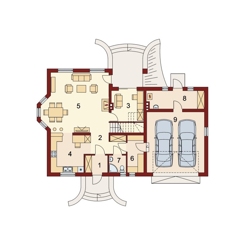 Na parterze znajdują się: przestronna kuchnia którą z łatwością można wydzielić ściankami działowymi, osadzona w wykuszu jadalnia, pokaźnych rozmiarów pokój dzienny, gabinet który z łatwością można zaadaptować na dodatkową sypialnię dla gości, zlokalizowana obok wiatrołapu wygodna łazienka oraz w części gospodarczej – spiżarnia przez którą dojść można do dwustanowiskowego garażu i pomieszczenia gospodarczego pełniącego również funkcję kotłowni. Na poddaszu wygospodarowano dwa ustawne pokoje połączone wspólnym balkonem, pojemną garderobę dostępną z przestrzeni komunikacji i dwuosobową sypialnię z własnym balkonem, sąsiadującą z dużym salonem kąpielowym.